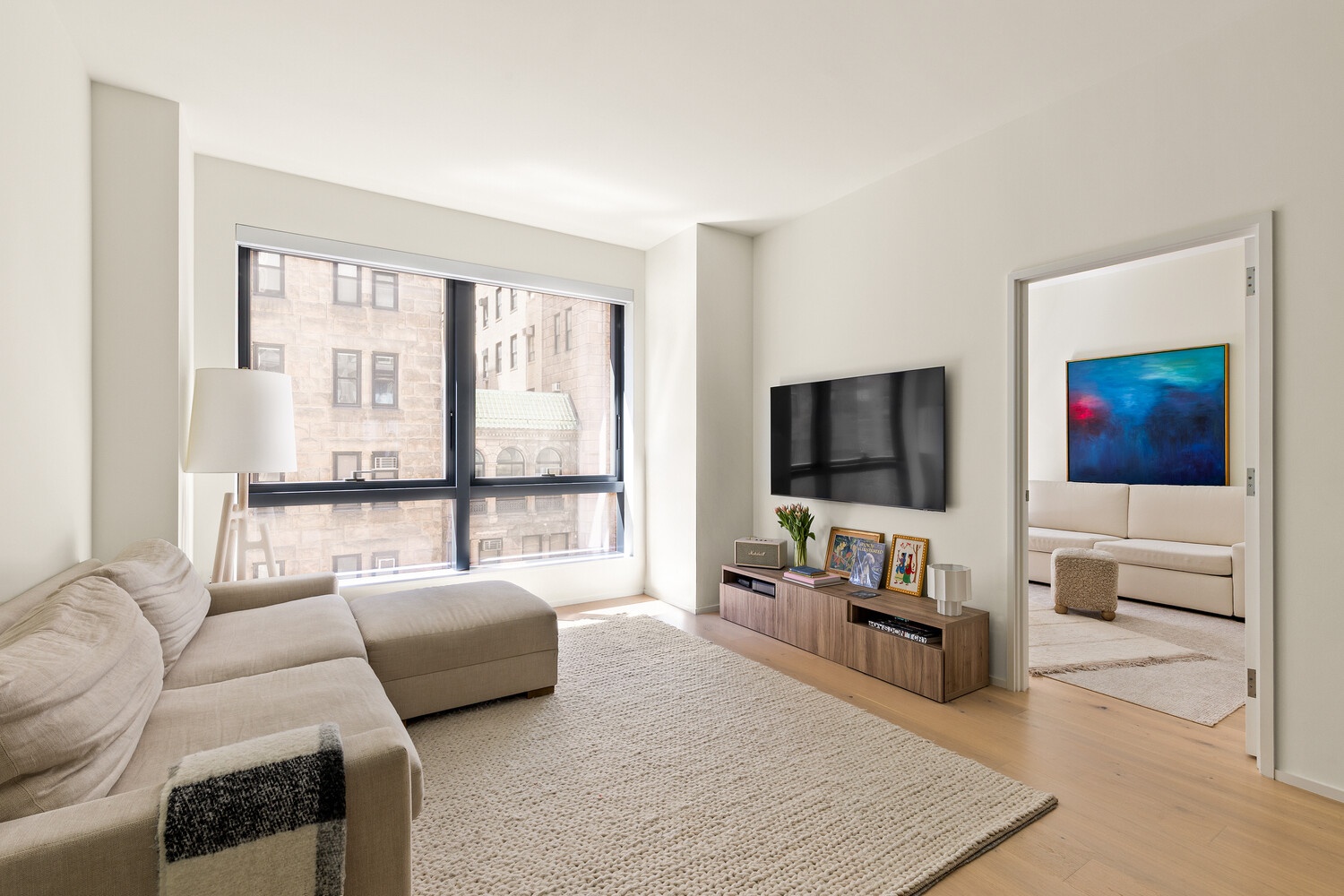 A gracious entry unfolds into a beautifully proportioned living and dining space, defined by soaring 9'6" ceilings and dual northern and southern exposures. Oversized windows frame soft, ambient light throughout, complementing the wide-plank white oak floors and enhancing the home's serene, gallery-like ambiance. The south-facing living room and secondary bedroom overlook the charming, tree-lined streetscape of East 22nd Street, while the serene primary suite is privately positioned to the north, overlooking a landscaped courtyard. Floor-to-ceiling glass doors open to a private 52-square-foot terrace, offering a quiet and intimate outdoor retreat.