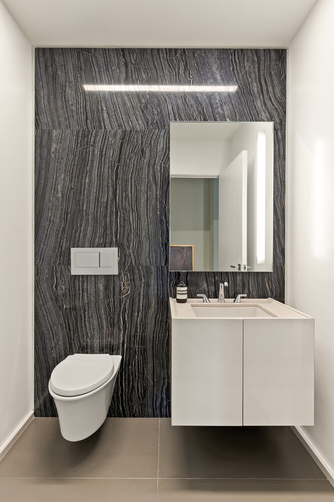 The primary bath is a sanctuary of indulgence, richly clad in Calacatta Paonazzo marble, with sculptural detailing, radiant heated floors, polished chrome fixtures, and a sleek glass-enclosed shower-evoking the experience of a private spa.