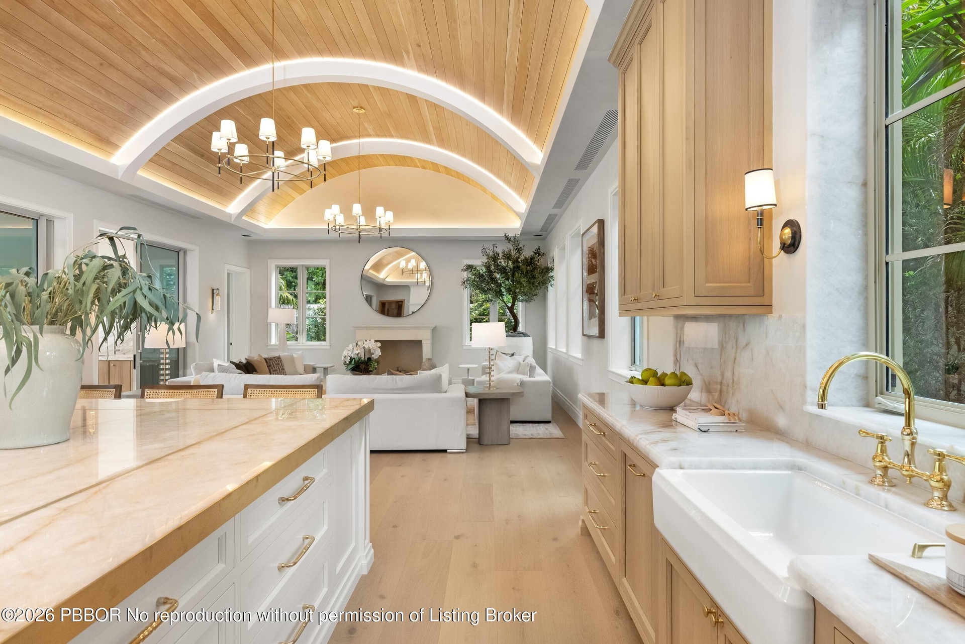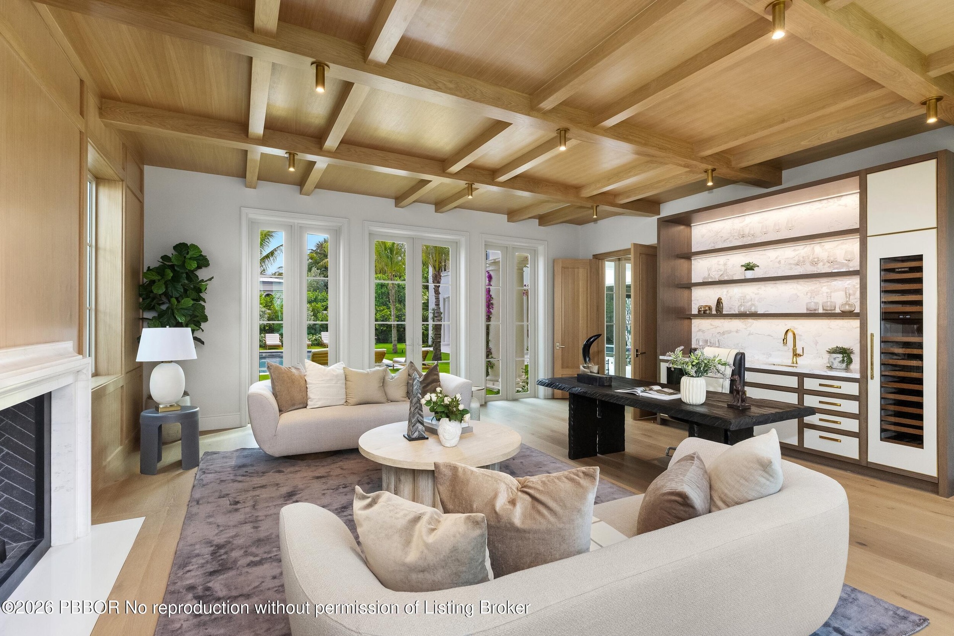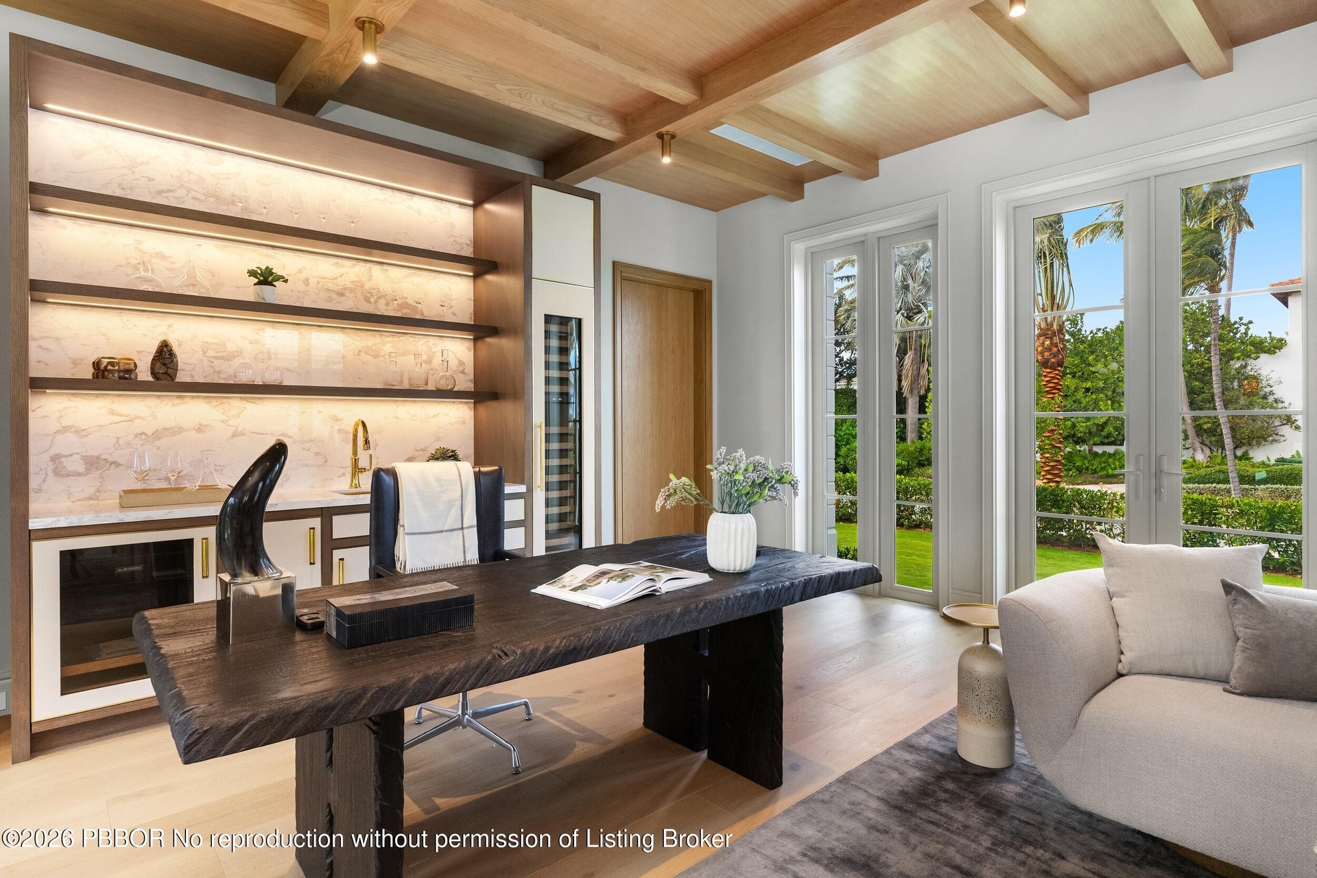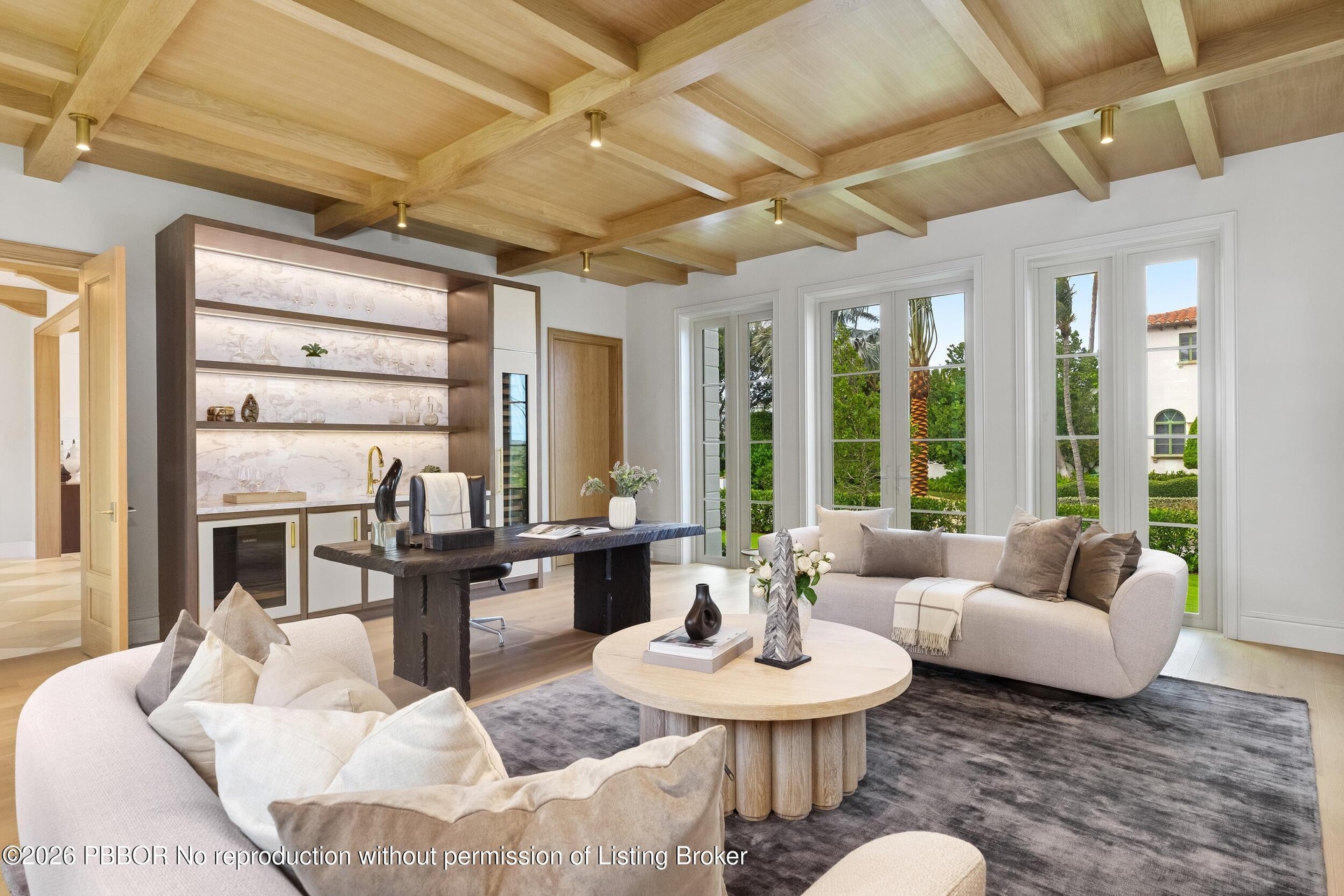 A grand entry leads to light-filled interiors with soaring ceilings and seamless flow between formal and casual living spaces. The chef's kitchen is anchored by a Cristallo stone island with brass inlay and features a L'Atelier stove, along with Sub-Zero and Miele appliances, and a walk-in pantry. A standout feature is the private office, accessed through a hidden door, complete with a full bar, Sub-Zero refrigeration, wine storage, ice maker, and integrated in-wall speakers--ideal for both work and entertaining.