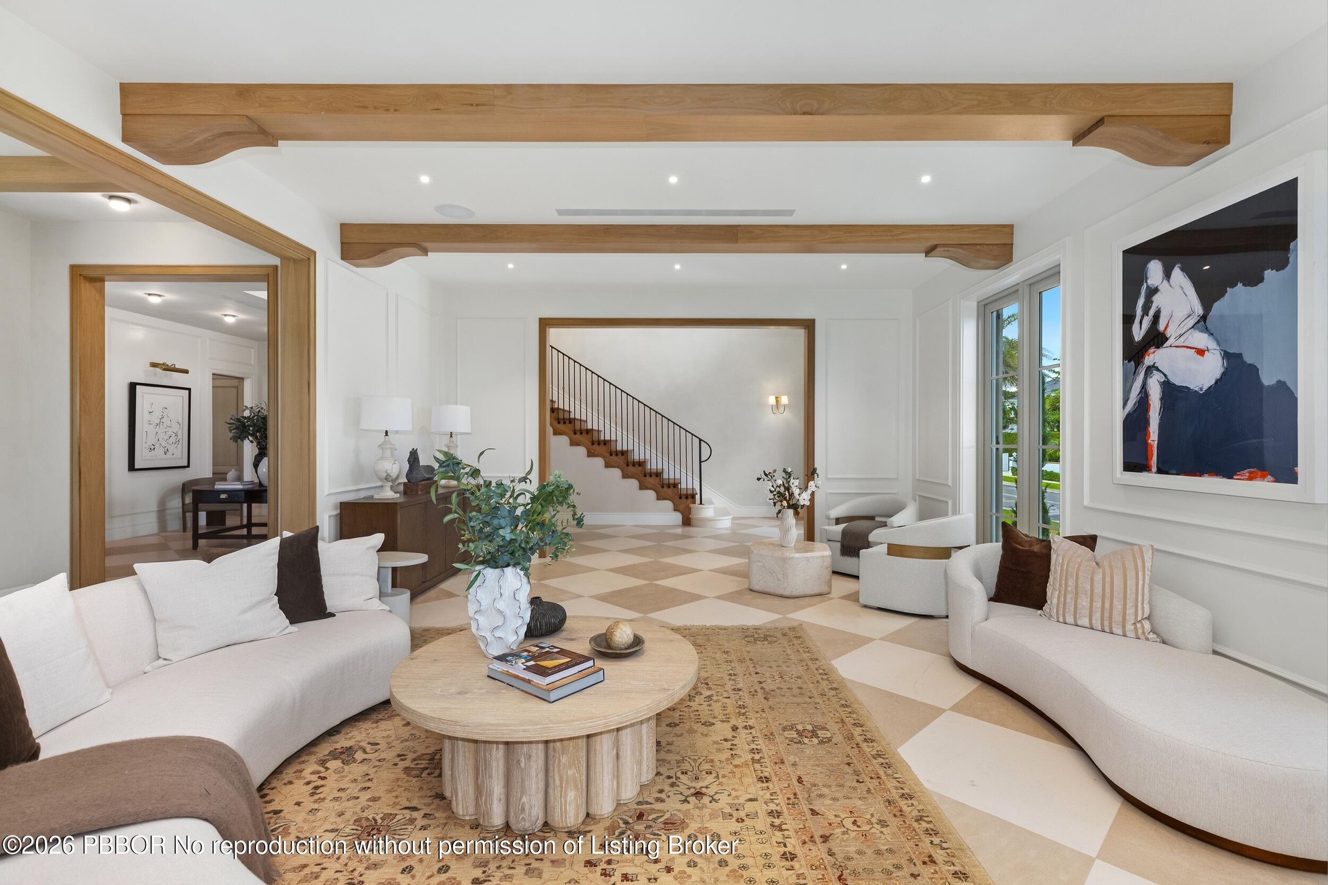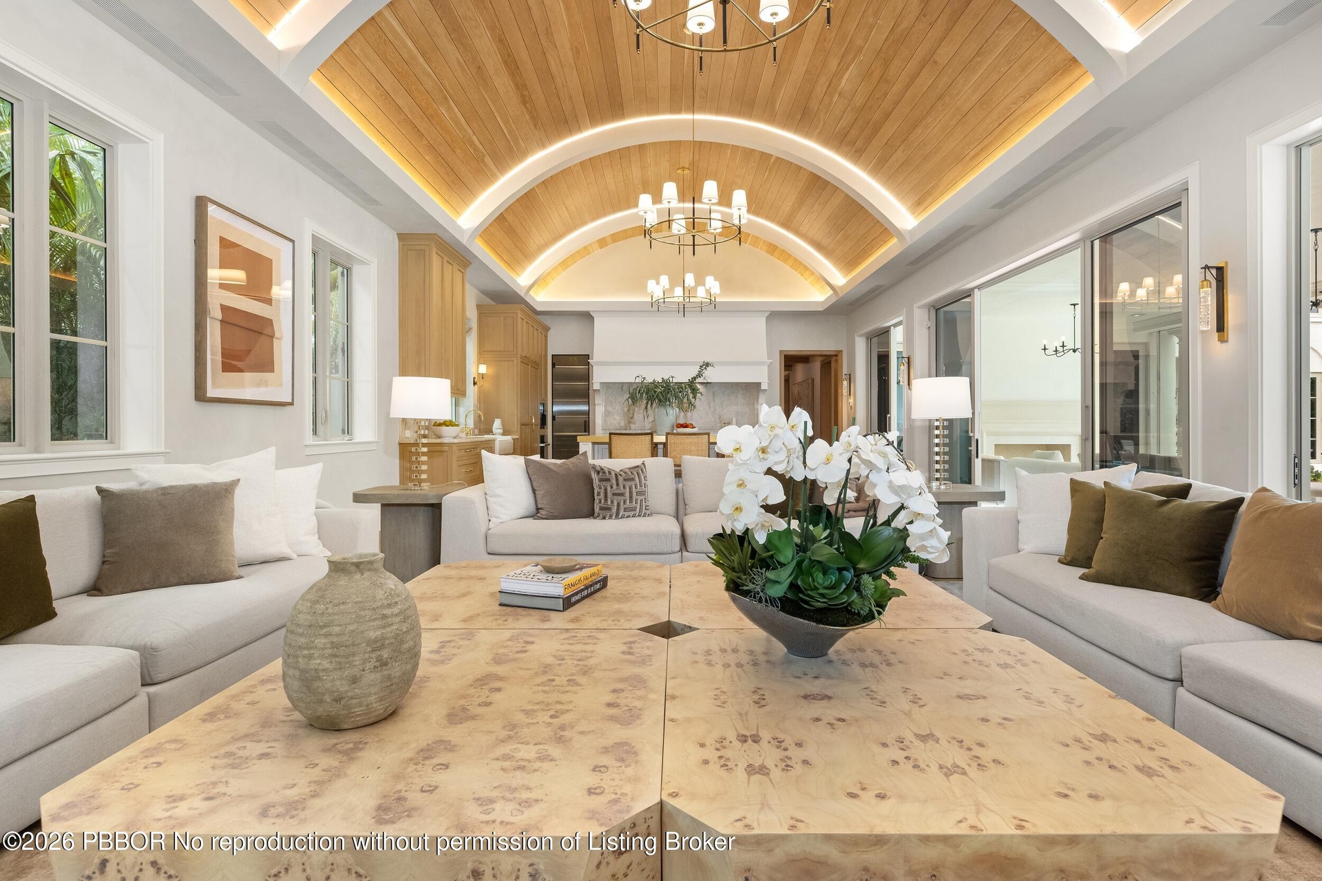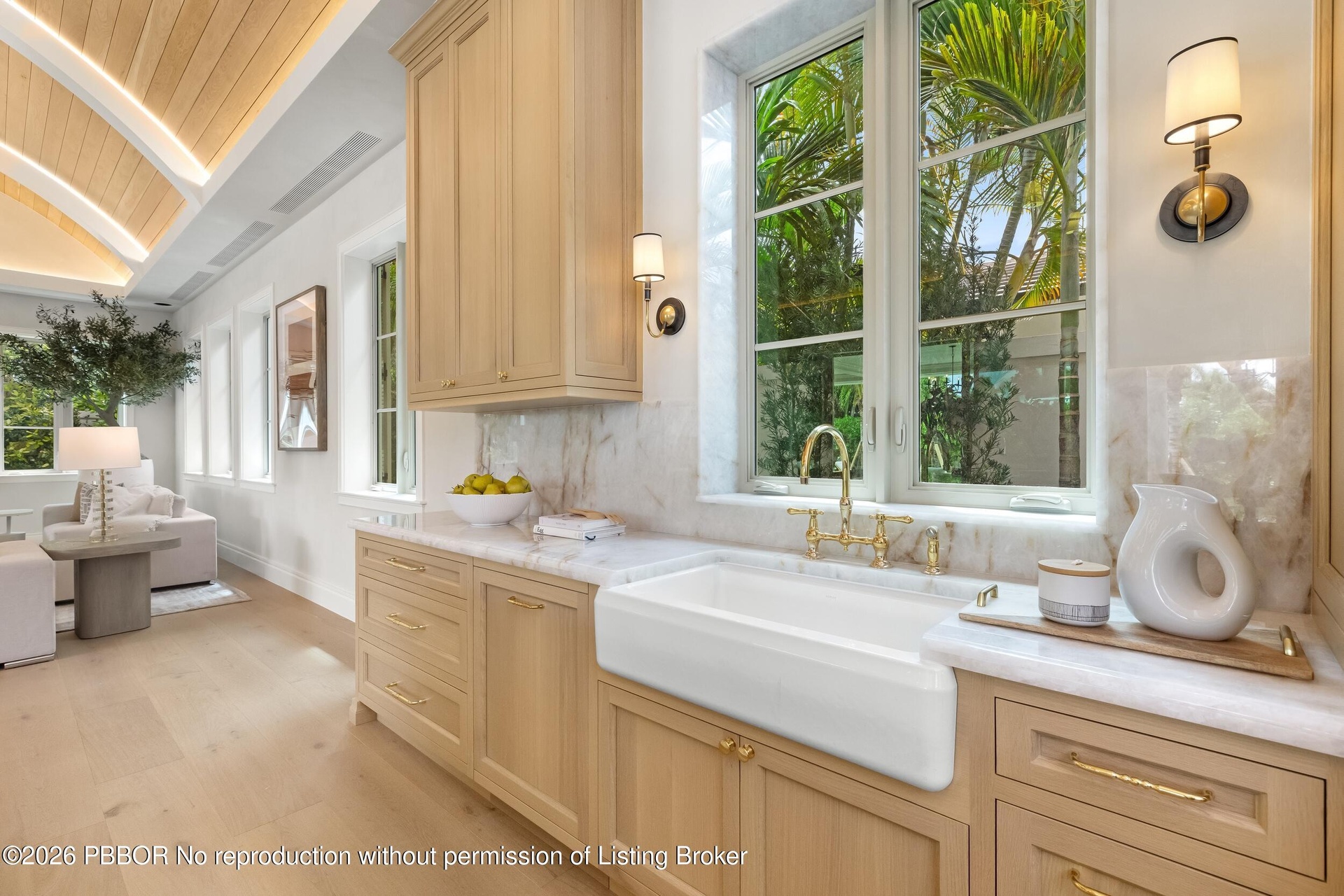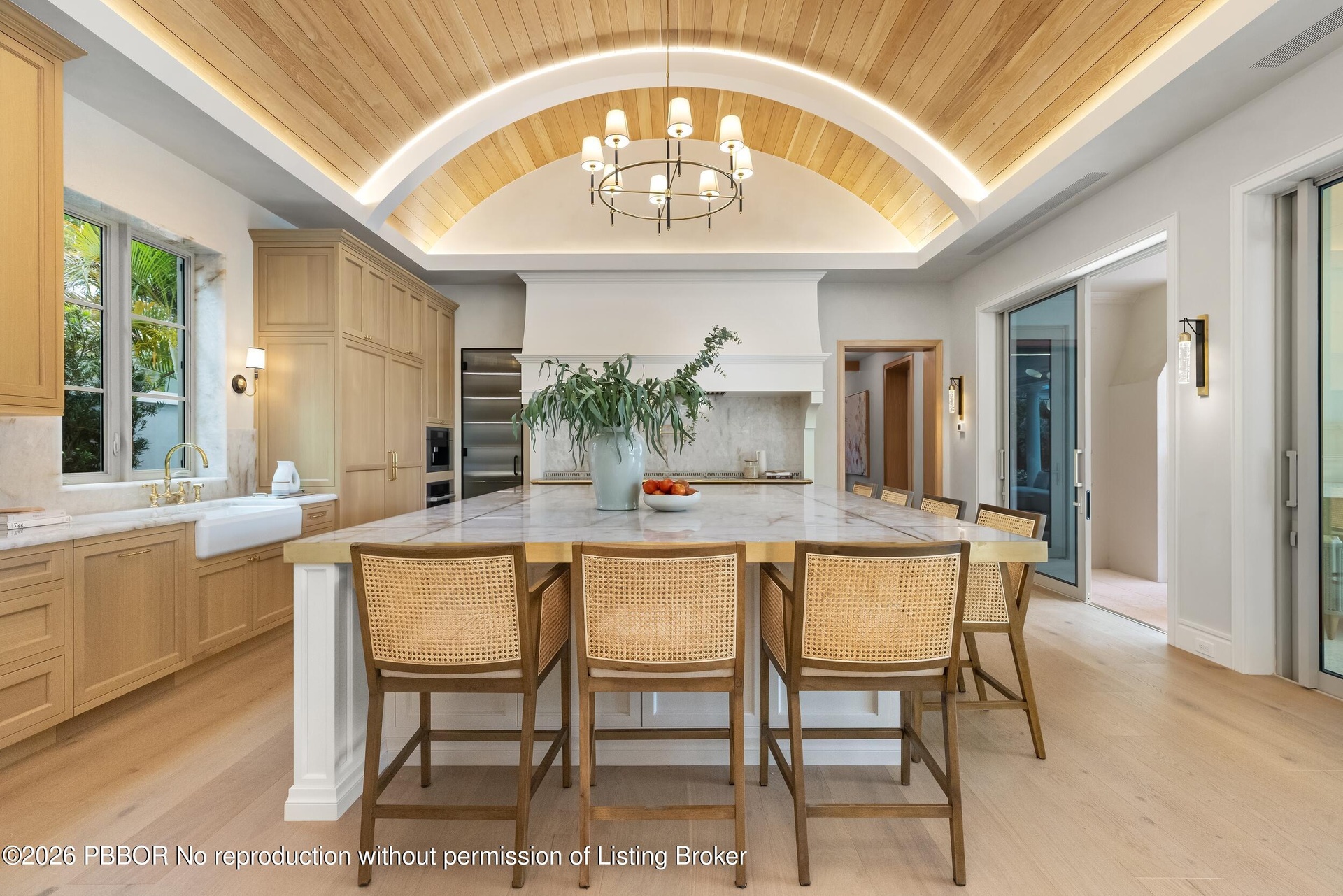 A grand entry leads to light-filled interiors with soaring ceilings and seamless flow between formal and casual living spaces. The chef's kitchen is anchored by a Cristallo stone island with brass inlay and features a L'Atelier stove, along with Sub-Zero and Miele appliances, and a walk-in pantry. A standout feature is the private office, accessed through a hidden door, complete with a full bar, Sub-Zero refrigeration, wine storage, ice maker, and integrated in-wall speakers--ideal for both work and entertaining.