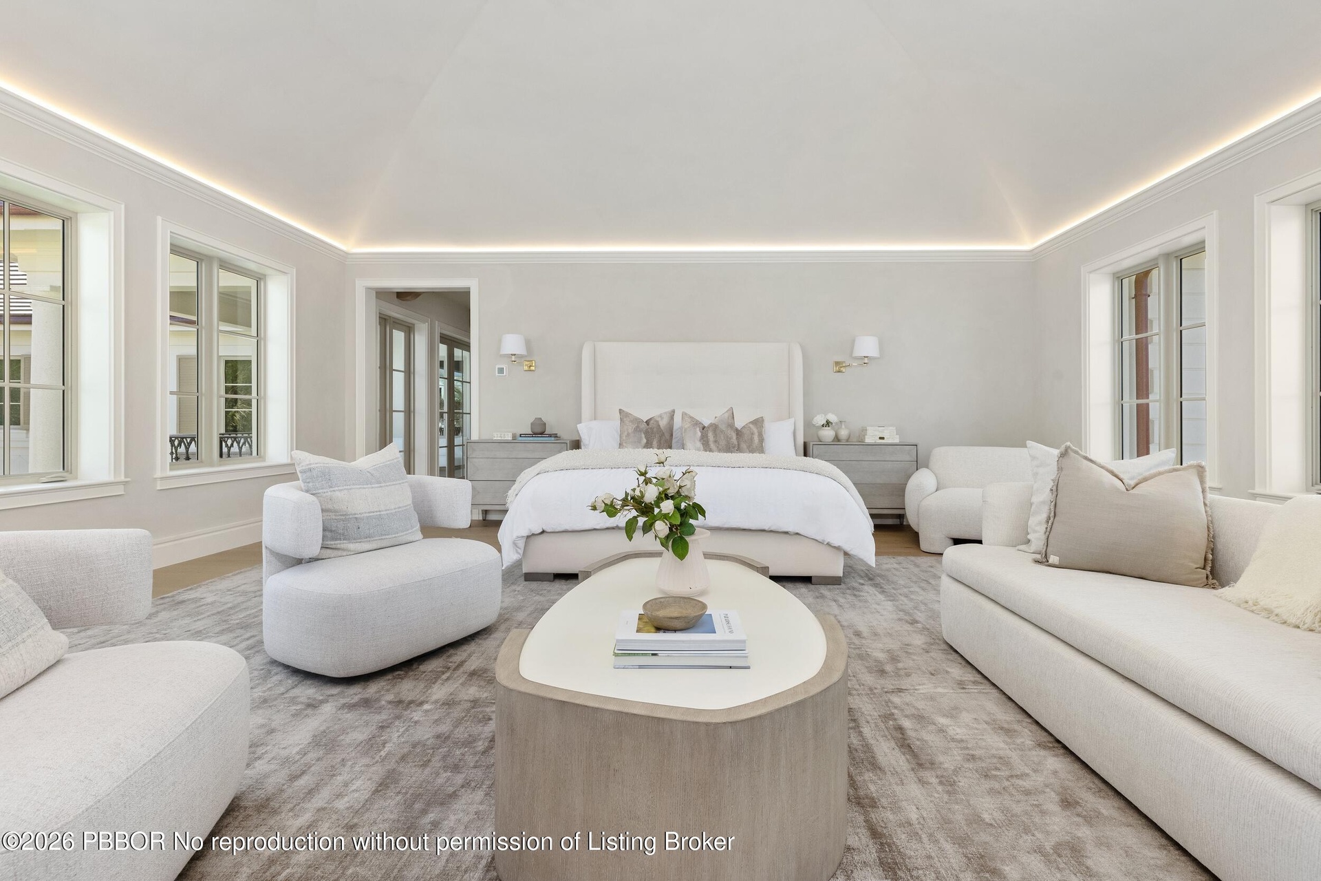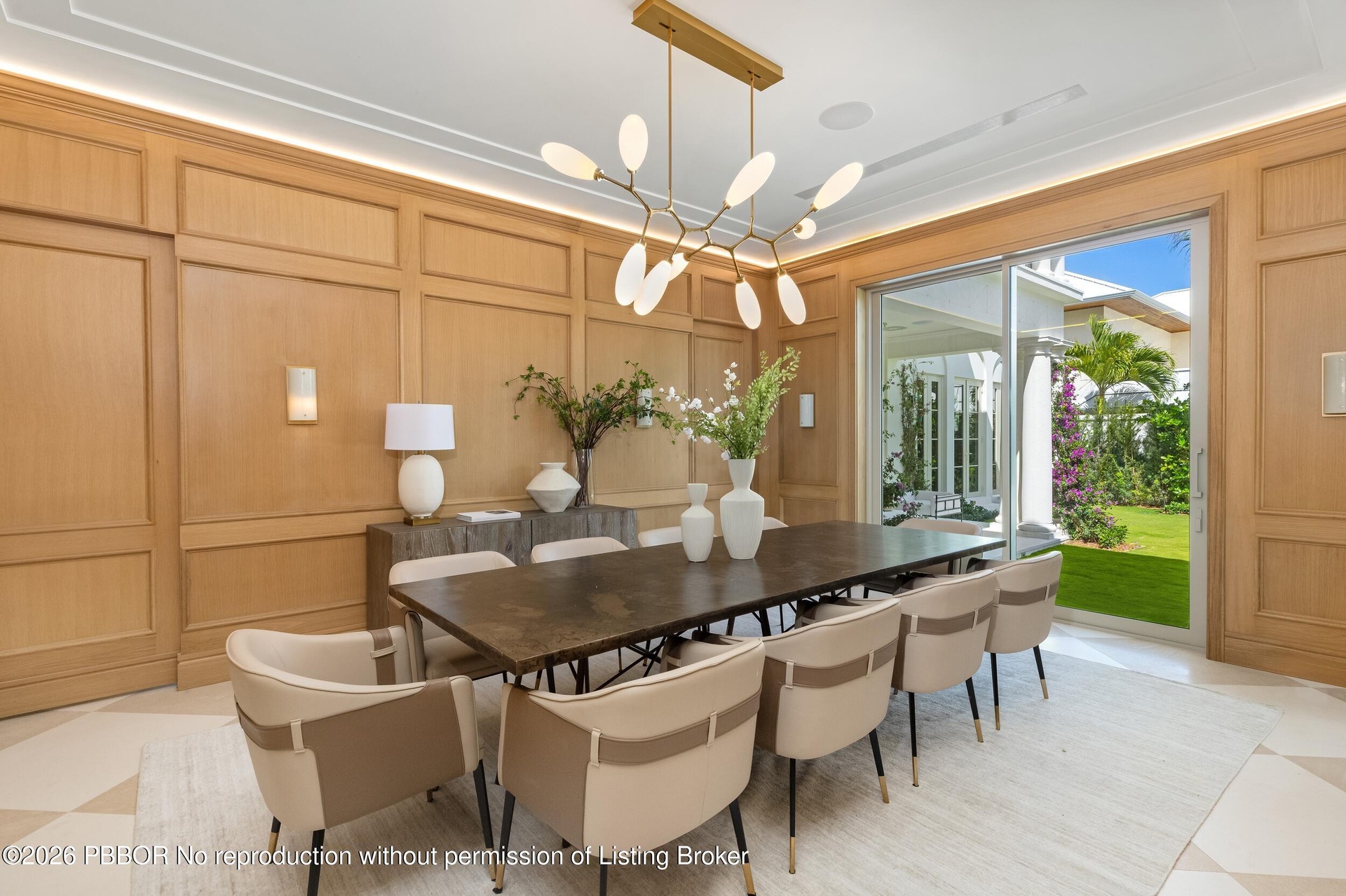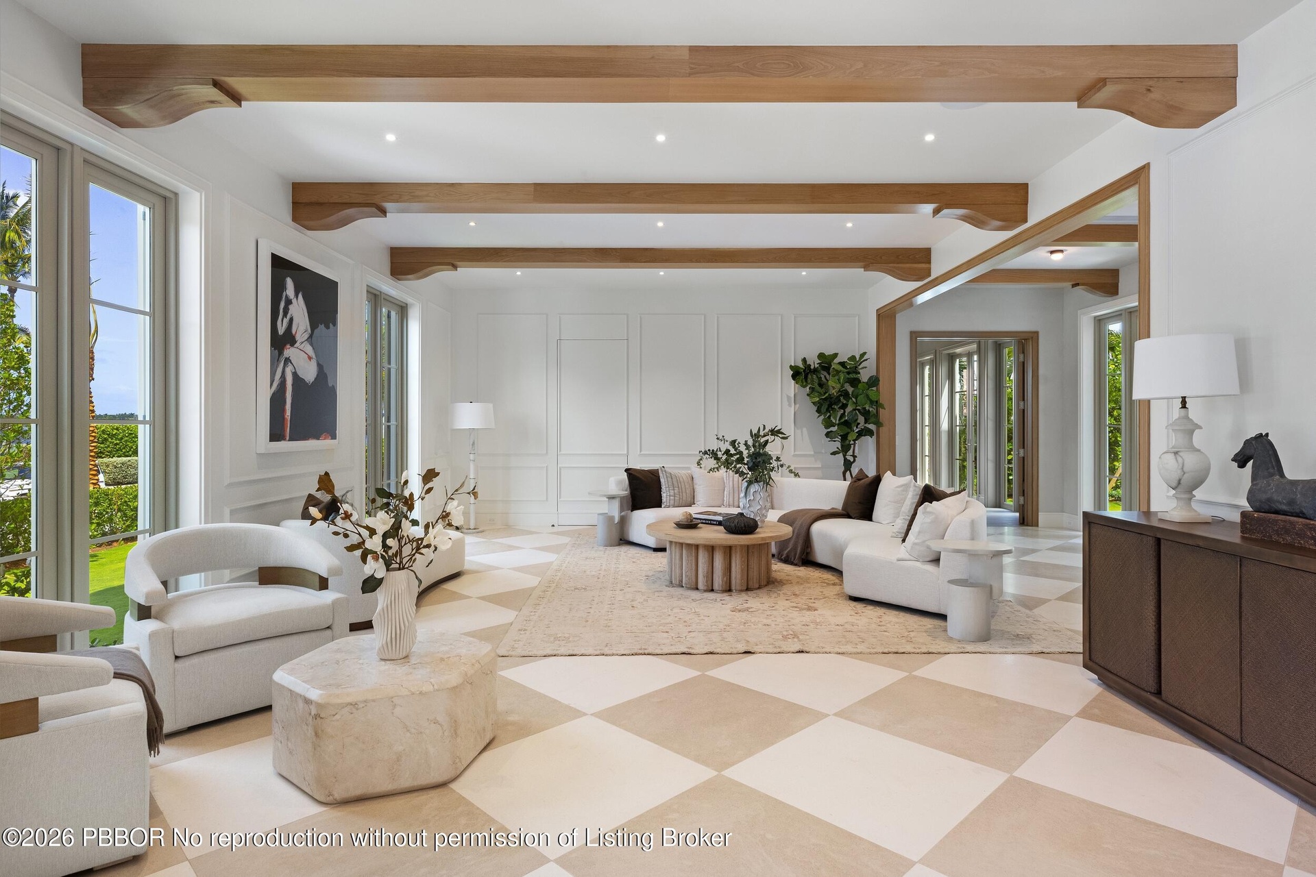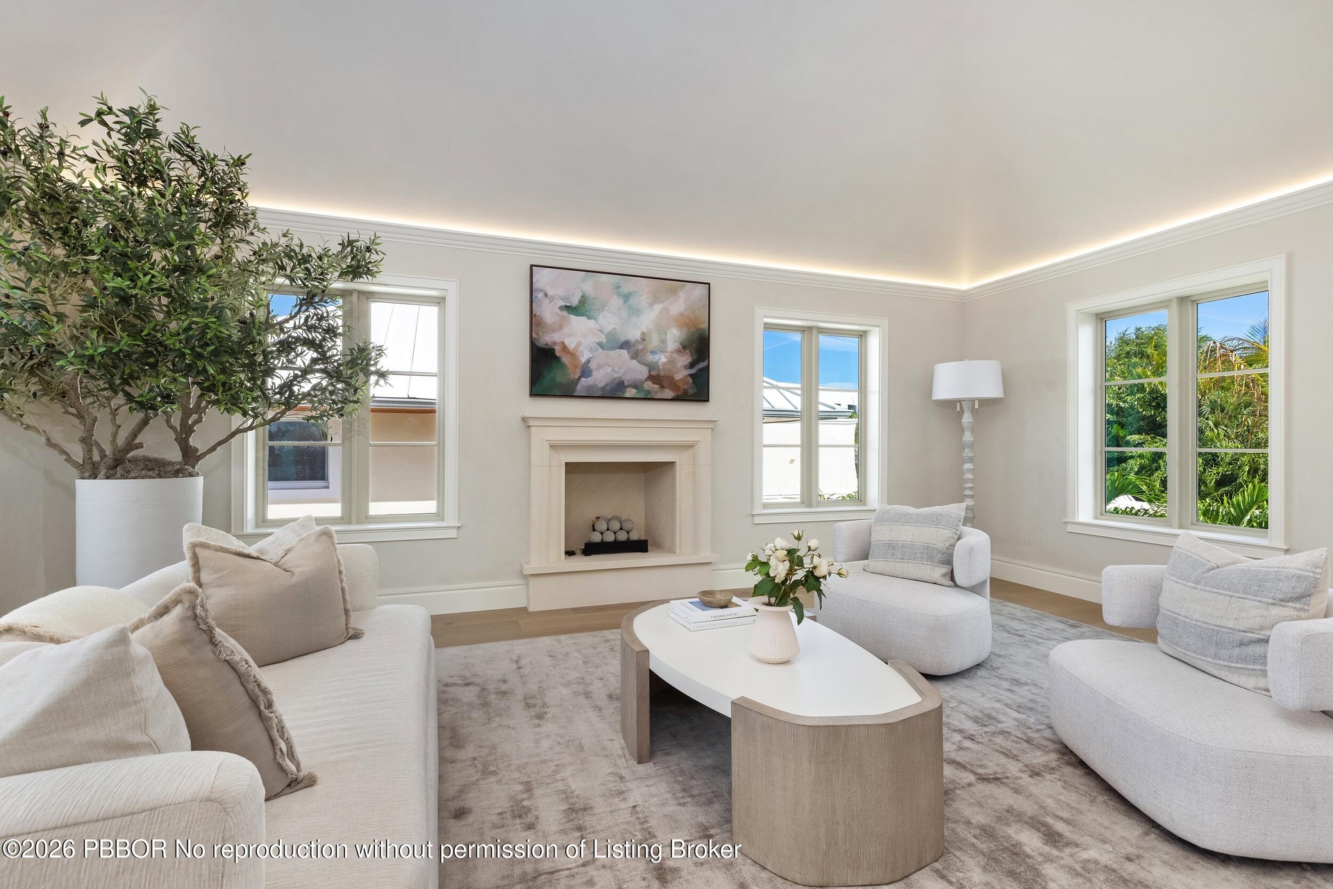 A grand entry leads to light-filled interiors with soaring ceilings and seamless flow between formal and casual living spaces. The chef's kitchen is anchored by a Cristallo stone island with brass inlay and features a L'Atelier stove, along with Sub-Zero and Miele appliances, and a walk-in pantry. A standout feature is the private office, accessed through a hidden door, complete with a full bar, Sub-Zero refrigeration, wine storage, ice maker, and integrated in-wall speakers--ideal for both work and entertaining.