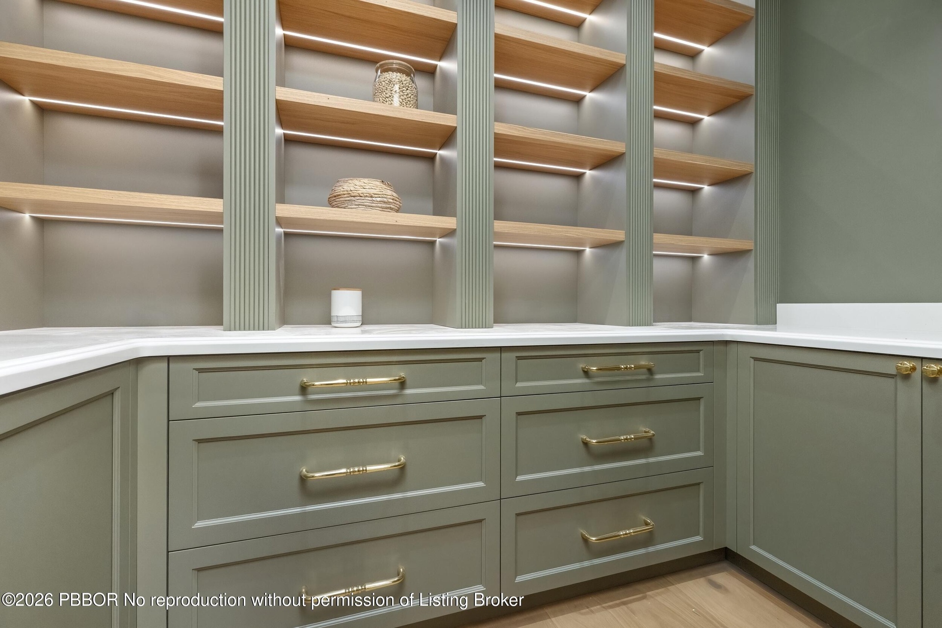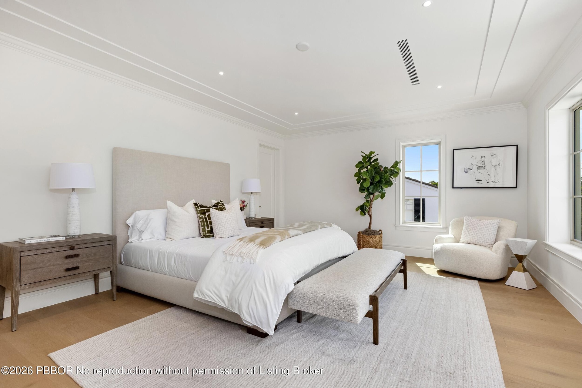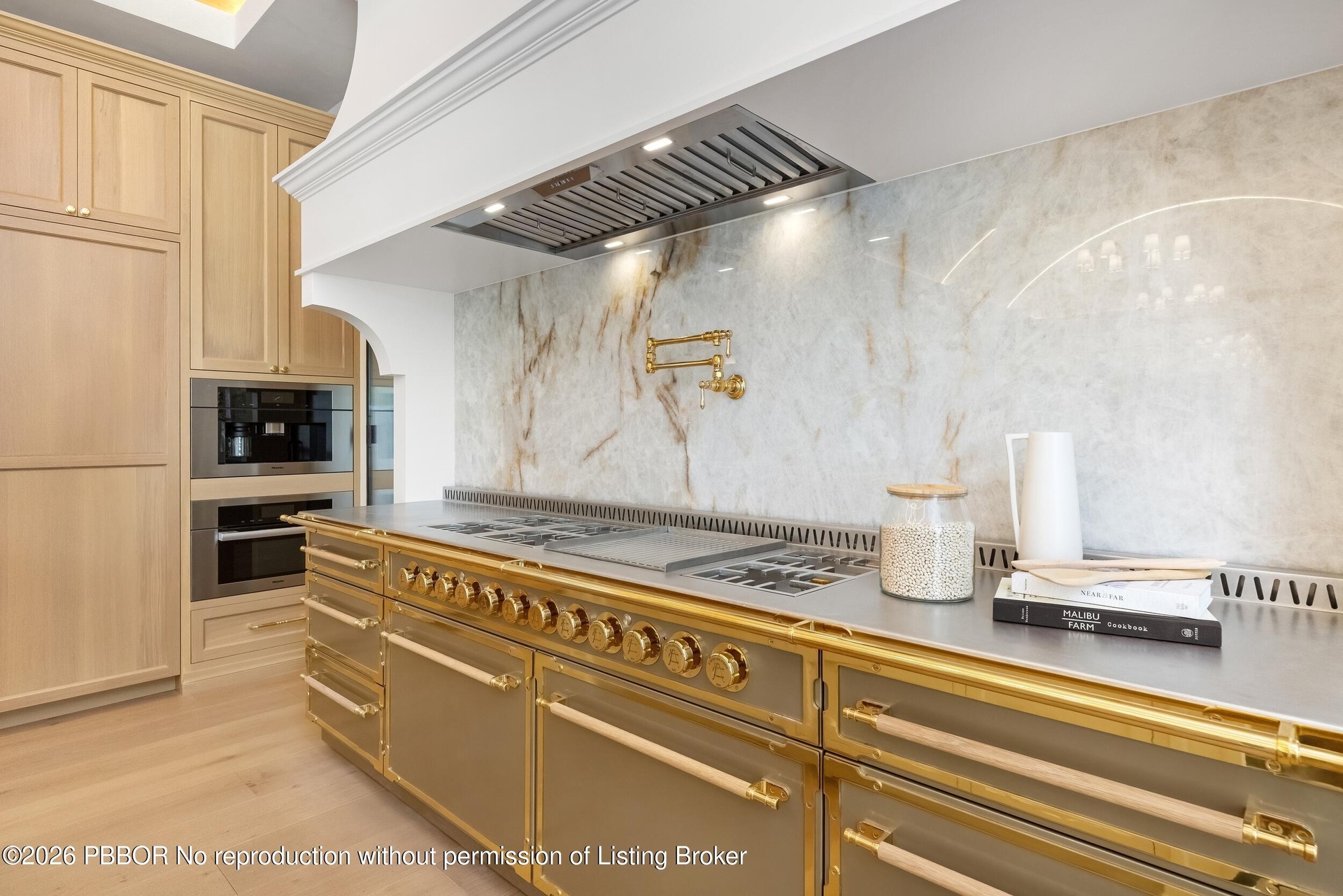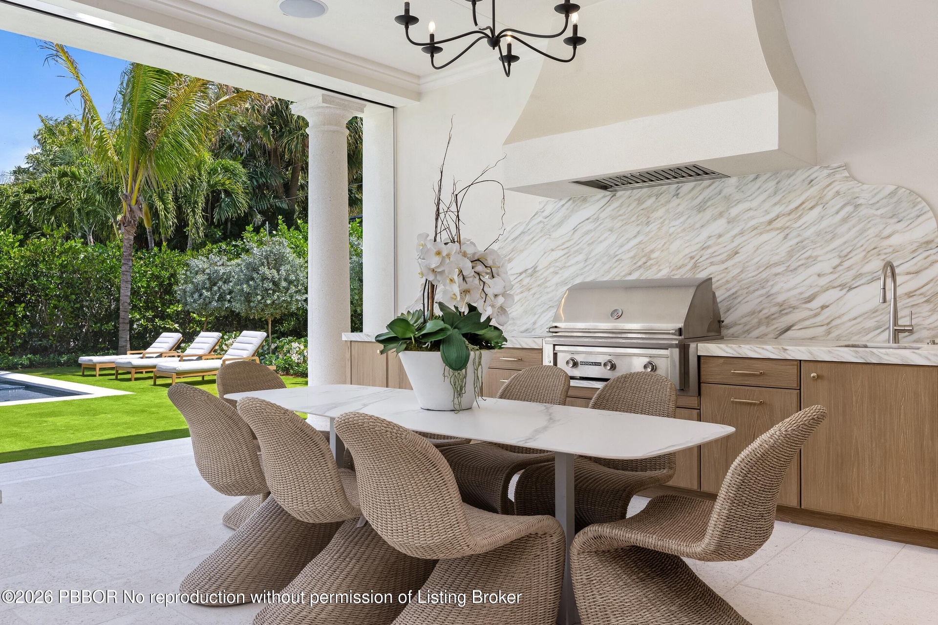 A grand entry leads to light-filled interiors with soaring ceilings and seamless flow between formal and casual living spaces. The chef's kitchen is anchored by a Cristallo stone island with brass inlay and features a L'Atelier stove, along with Sub-Zero and Miele appliances, and a walk-in pantry. A standout feature is the private office, accessed through a hidden door, complete with a full bar, Sub-Zero refrigeration, wine storage, ice maker, and integrated in-wall speakers--ideal for both work and entertaining.