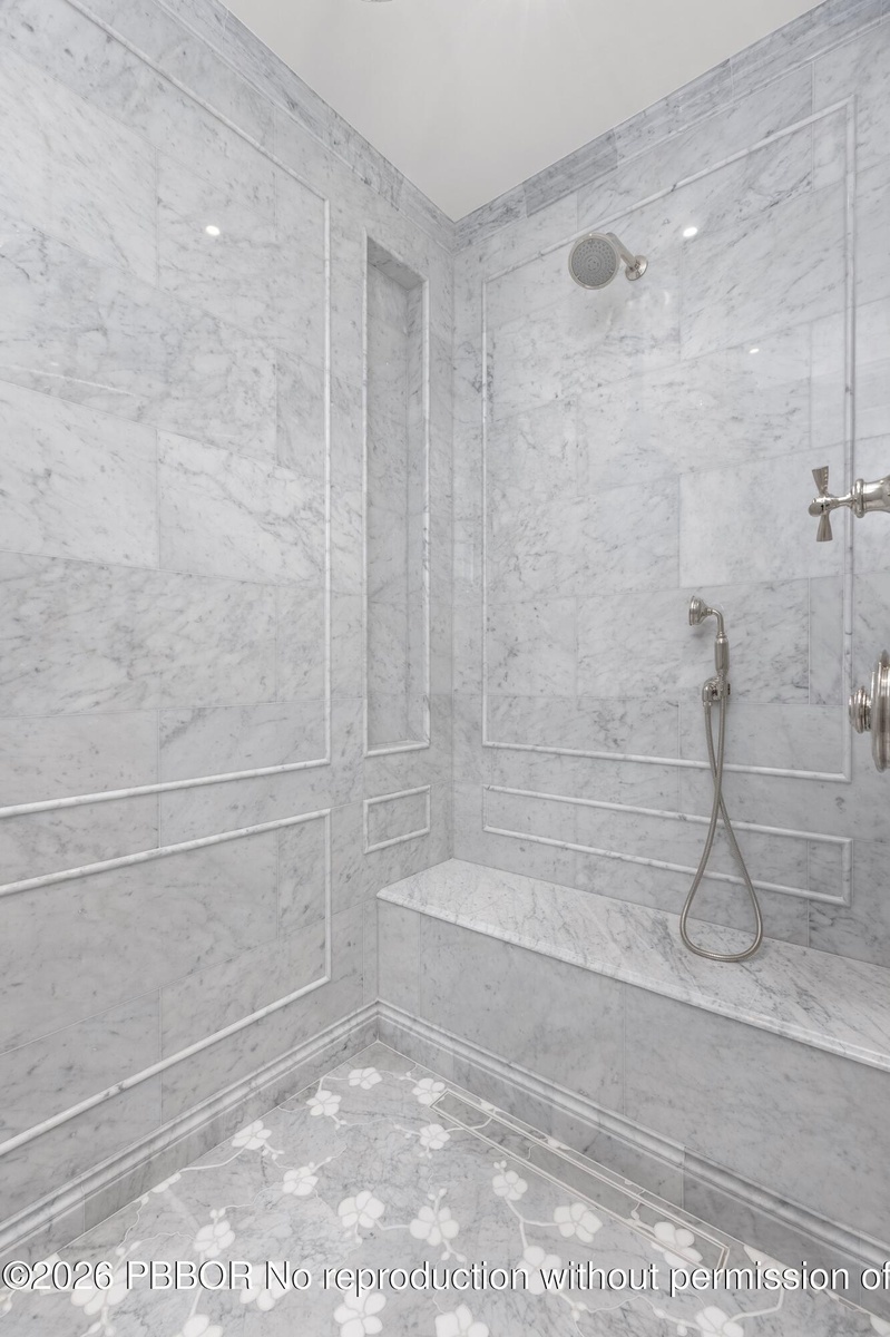 Outdoor living includes an impressive 40-foot covered loggia with a summer kitchen and fireplace, overlooking a heated pool and spa, with a full cabana bath and outdoor shower.