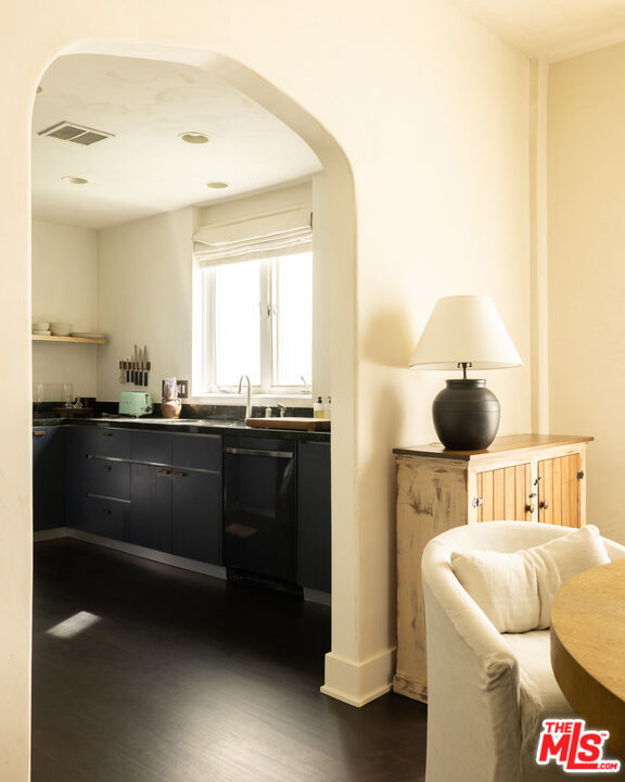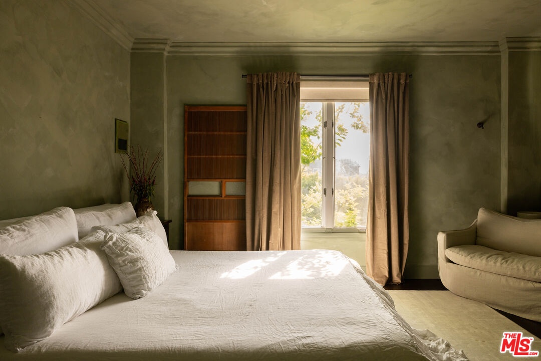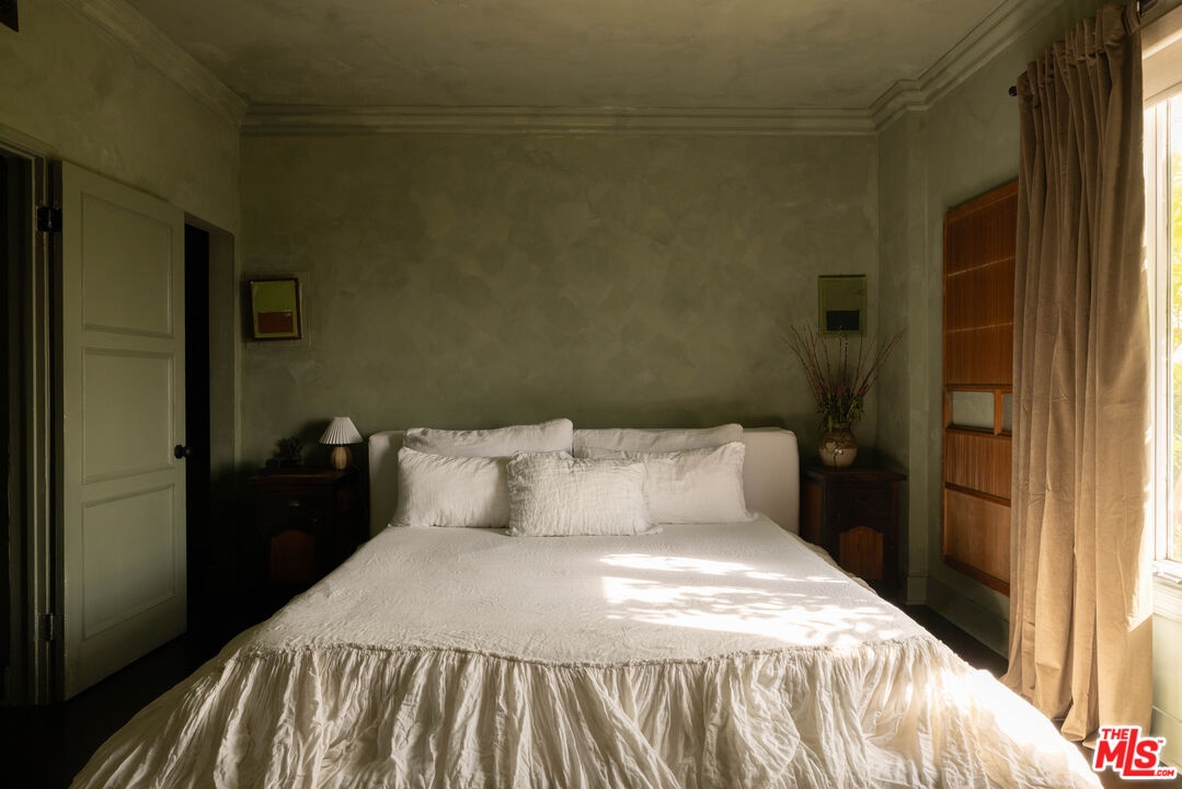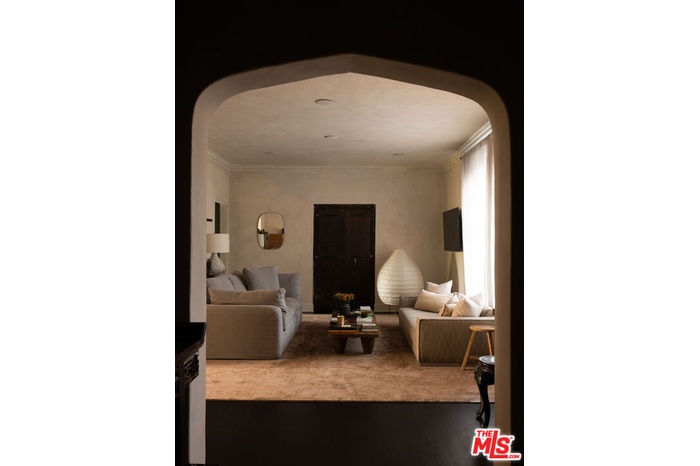 Located in one of West Hollywood's most iconic buildings, The Granville, this elegant two-bedroom, one-bath residence offers timeless character and abundant natural light. With coveted Mills Act status, the home also benefits from substantial property tax savings. The storied building was designed by the same architect behind the famed Plaza Athne in Paris, lending a rare sense of historic pedigree. Recently extensively remodeled with thoughtful design and artisan finishes, the residence blends Old Hollywood charm with refined modern updates through a California Wabi-Sabi inspired interior design that highlights natural materials, quiet textures, and understated elegance. High ceilings, classic moldings, and generous passageways frame the interiors, while new hardwood floors and curated details elevate the space. The spacious unit enjoys views of both the Sunset hills and the famed Chateau Marmont, while the dining room overlooking the communal courtyard fountains and anchored by a vintage Tom Greene brass torch chandelier offers an inviting setting for entertaining. The updated kitchen features natural stone surfaces, handmade zellige tile backsplash, and new appliances including a refrigerator and dishwasher. The reimagined bath showcases handcrafted tilework, a sculptural travertine tub, and custom finishes, complemented by subtle plaster style walls by Portola Paints. Additional upgrades include new HVAC, water heater, and in-unit laundry. Residents of The Granville enjoy a beautiful garden courtyard with fountain and outdoor seating, doorman service, and exceptional walkability to West Hollywood's best dining, shopping, and nightlife.
