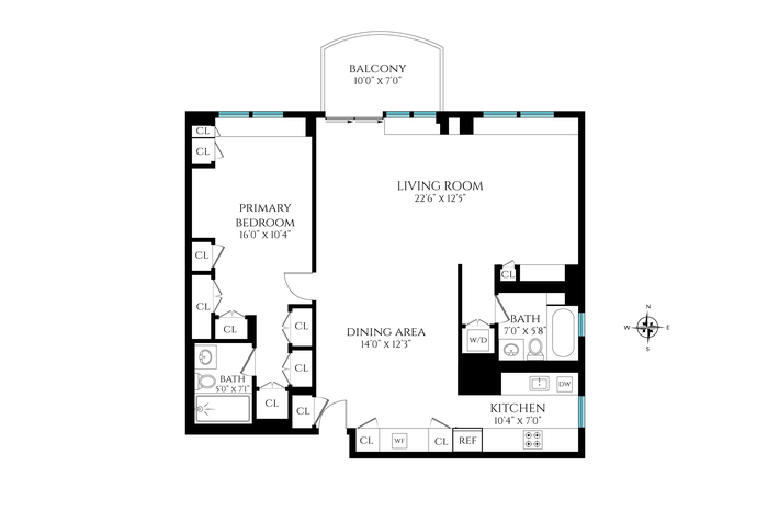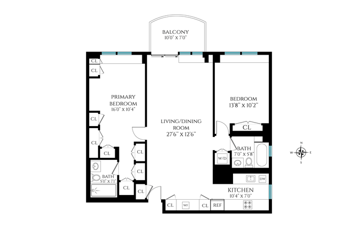Upon entering, you are greeted by bright open views. A coat closet is thoughtfully positioned adjacent to the dining area, offering everyday convenience leading into the expansive living room. The flexible floor plan is enhanced by soaring ceilings, creating a light filled, loft like ambiance. A private balcony extends off the living room, providing a serene retreat to enjoy your morning coffee or unwind in the evening. The windowed chef’s kitchen is outfitted with top of the line appliances, quartzite countertops and custom cabinetry, ideal for both everyday living and entertaining.
