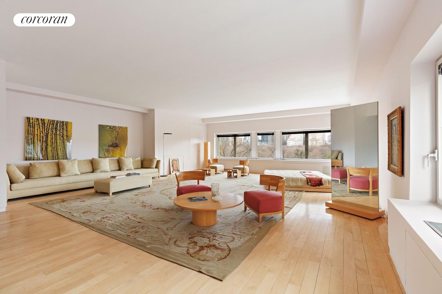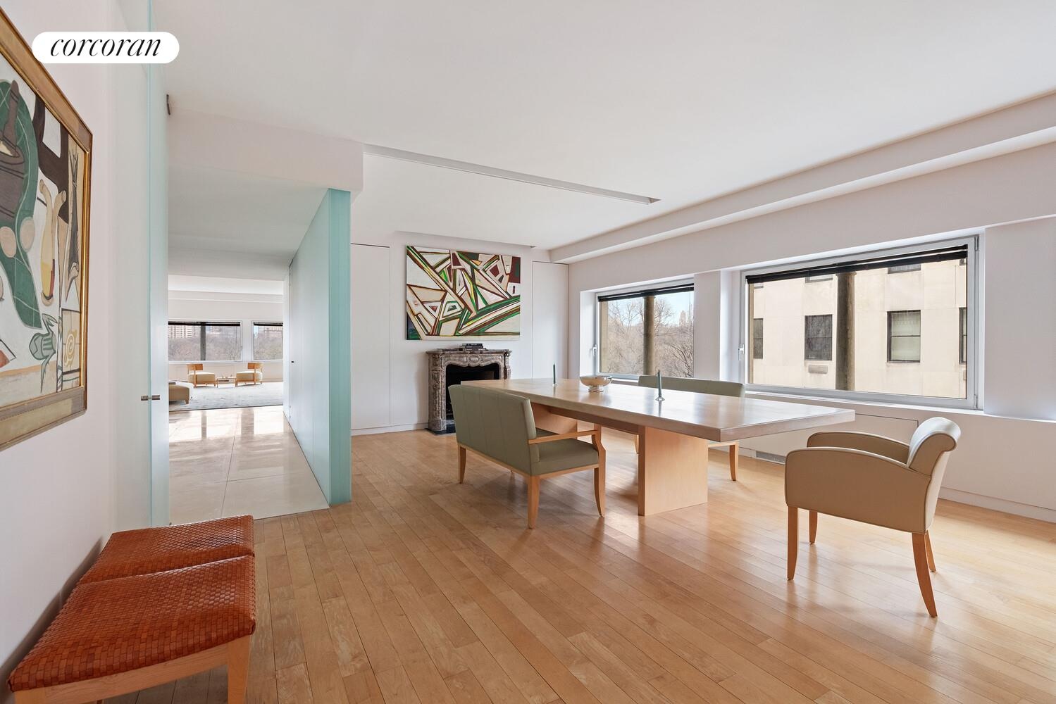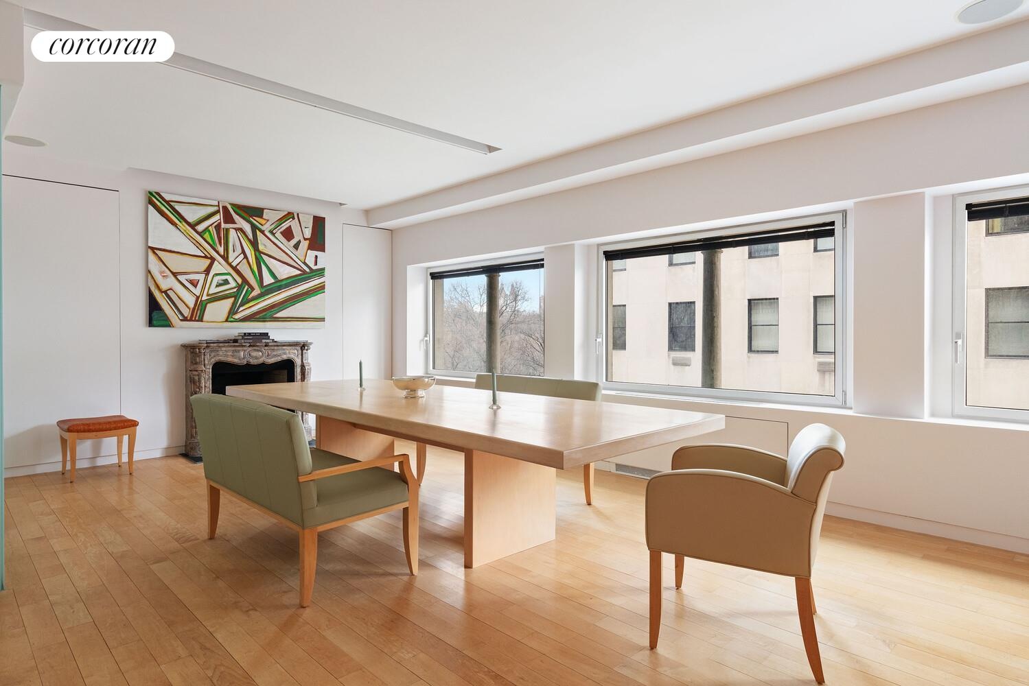 The flat itself (#5) unfolds west to east across the entire floor, brilliantly illuminated by natural light from sunrise to sunset, and it offers a front-row seat to the changing seasons across Central Park. Presently, the layout is configured with a master bedroom suite with a custom home office more aptly described as a professional sanctuary, and an en suite guest bedroom, both tucked smartly into the eastern portion of the plan. Along Fifth, a strikingly capacious west and north-facing living room invites high design and a curated art collection to complement its natural backdrop.