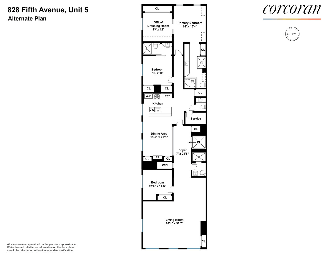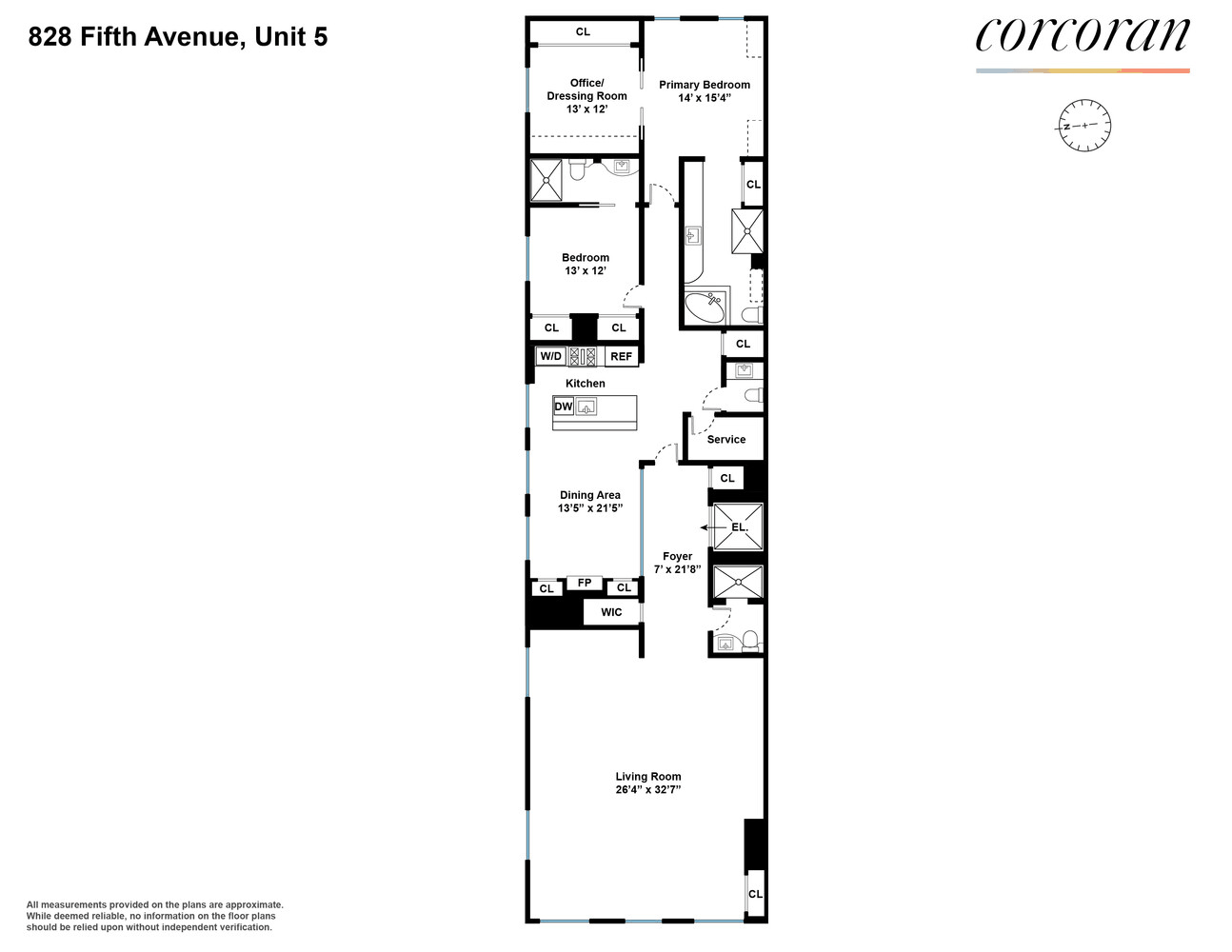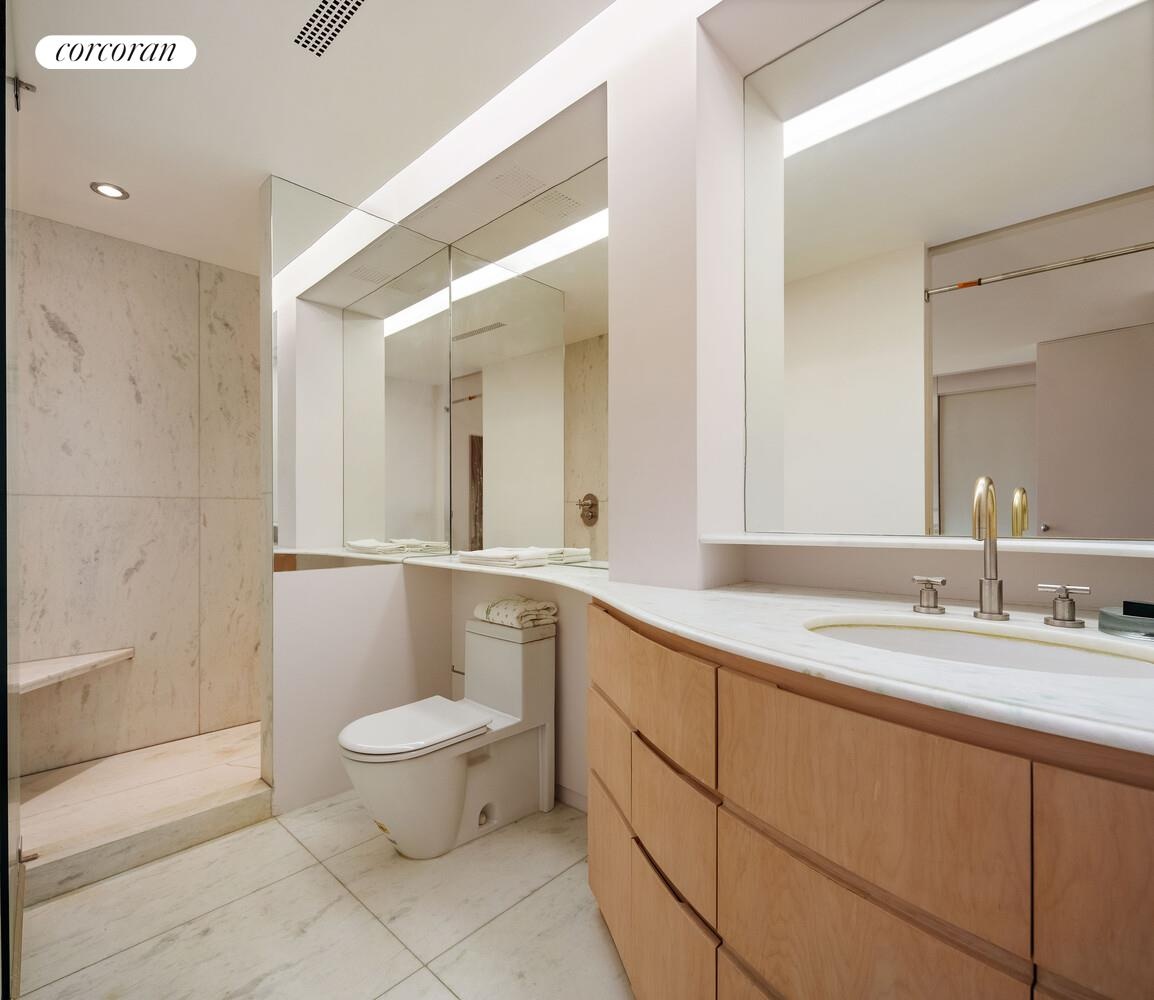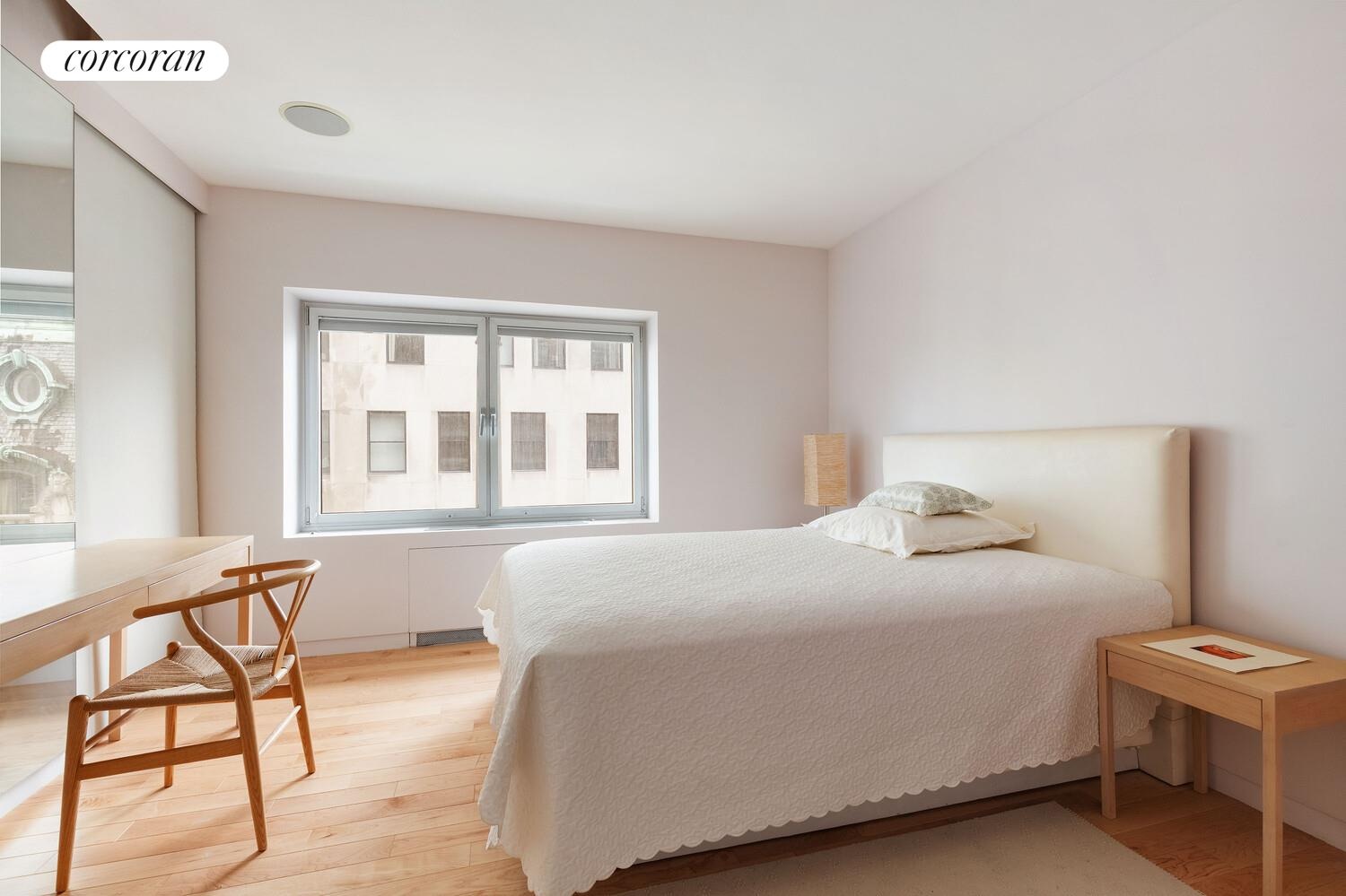 The flat itself (#5) unfolds west to east across the entire floor, brilliantly illuminated by natural light from sunrise to sunset, and it offers a front-row seat to the changing seasons across Central Park. Presently, the layout is configured with a master bedroom suite with a custom home office more aptly described as a professional sanctuary, and an en suite guest bedroom, both tucked smartly into the eastern portion of the plan. Along Fifth, a strikingly capacious west and north-facing living room invites high design and a curated art collection to complement its natural backdrop.