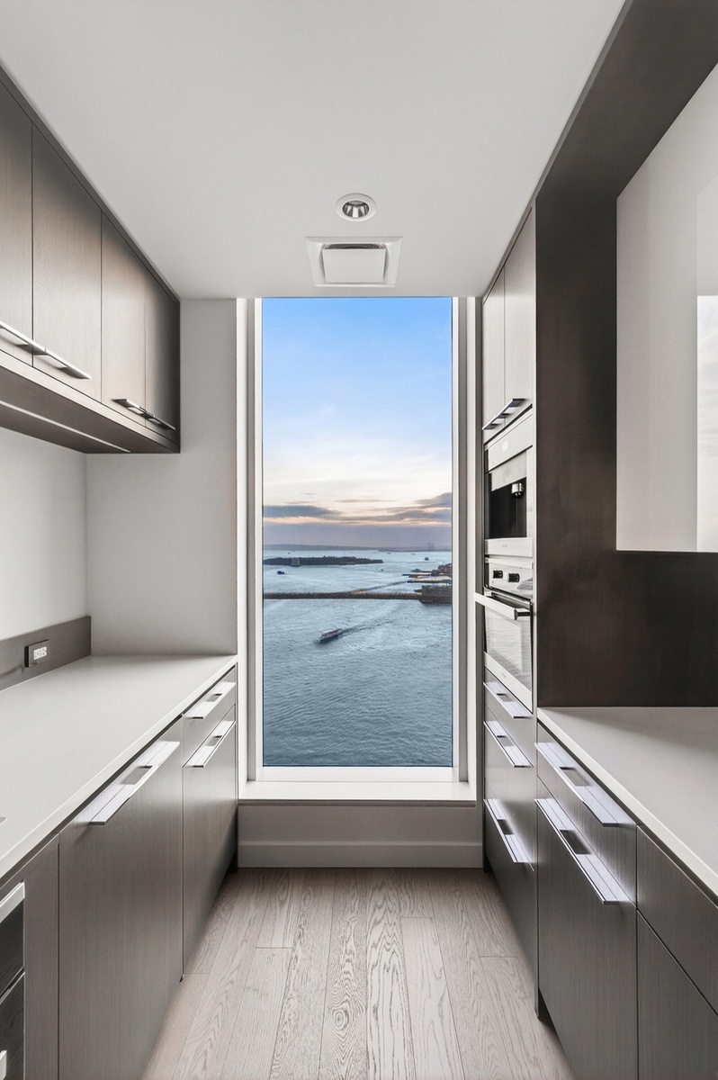 Thoughtfully designed by the acclaimed Meyer Davis Studio, the interiors embody a refined, modern elegance. Floor-to-ceiling windows invite abundant natural light throughout, complementing 5" wide stained oak flooring and meticulously curated finishes. The open chef’s kitchen is outfitted with a premium Miele appliance suite, imported stone surfaces, custom cabinetry, and a spacious breakfast bar perfectly positioned toward sweeping skyline views.