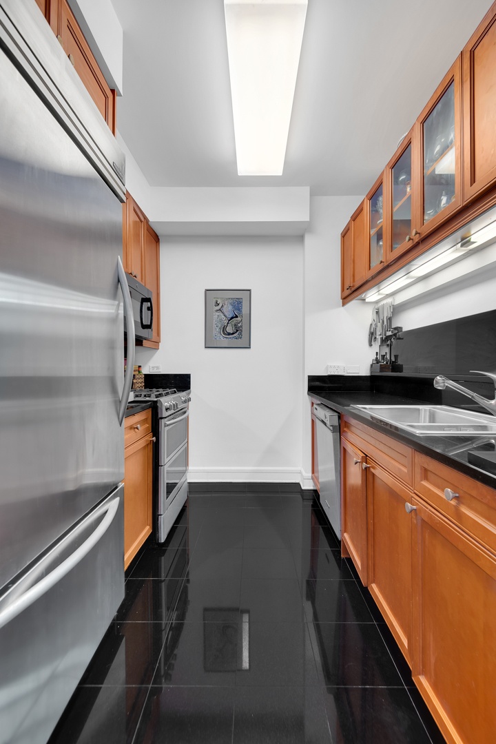 The thoughtfully designed chef's kitchen is outfitted with abundant cabinetry and counter space, complemented by premium stainless steel appliances and sleek granite countertops.