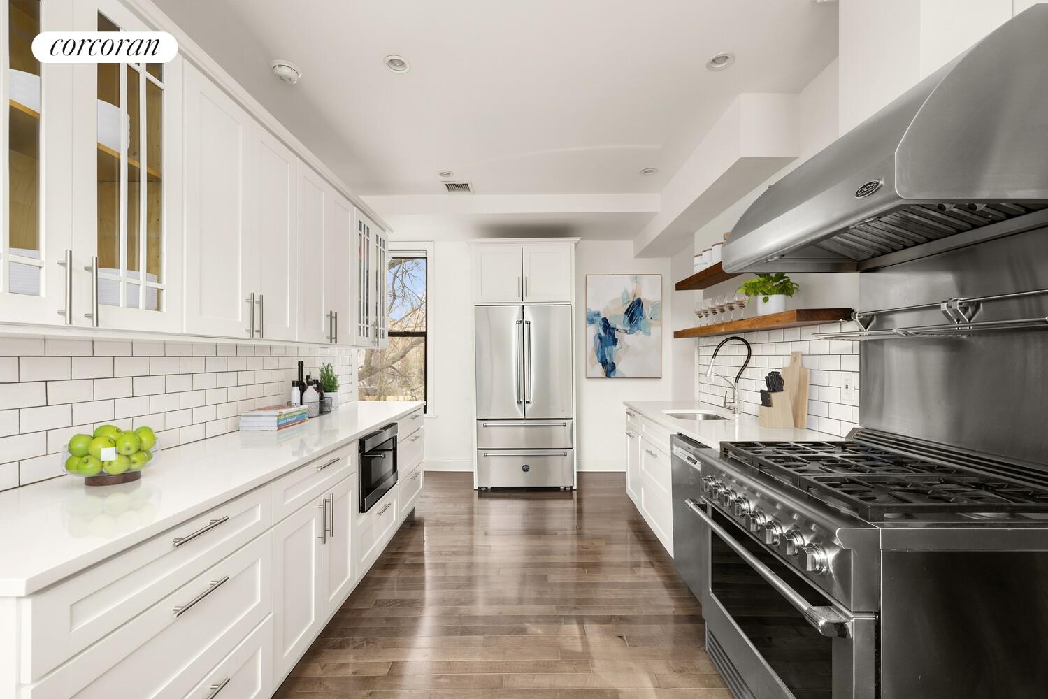 The chef's kitchen is nothing short of exceptional. Outfitted with a Fisher & Paykel 6-burner gas range, Bosch dishwasher, Bertazzoni refrigerator, and Sharp drawer microwave, it is as functional as it is beautiful. A wall of windows and a charming windowed breakfast nook invite you to linger over your morning coffee, while a generous walk-in pantry with custom built-in shelving keeps everything organized and within reach.
