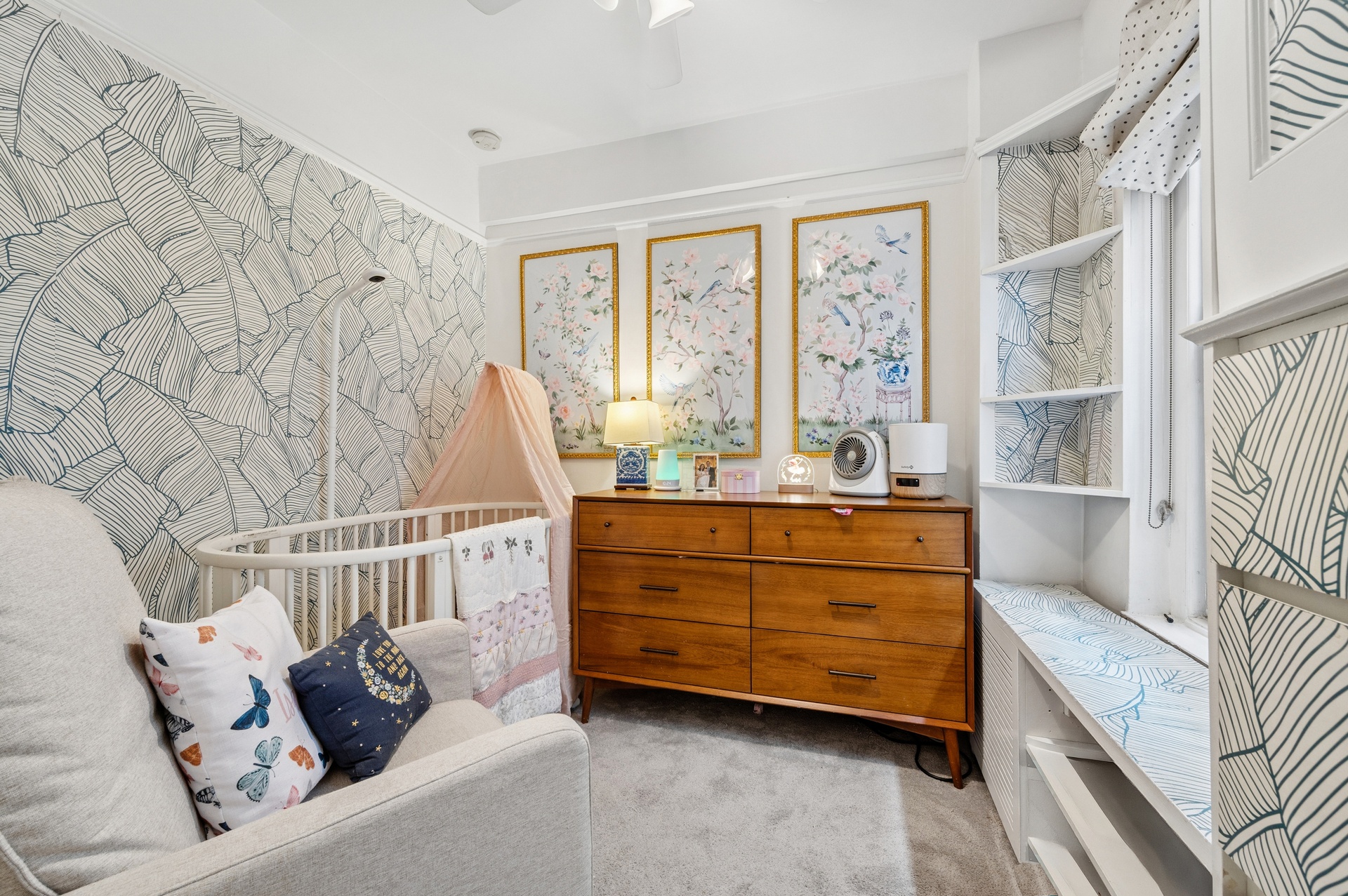 The second bedroom is currently set up as a nursery and works equally well as a guest room or home office.