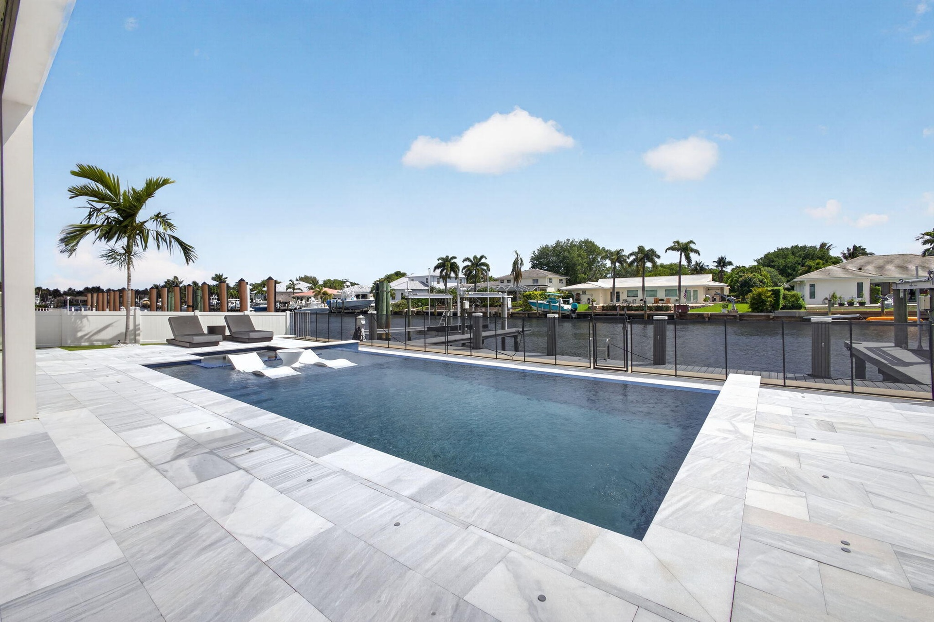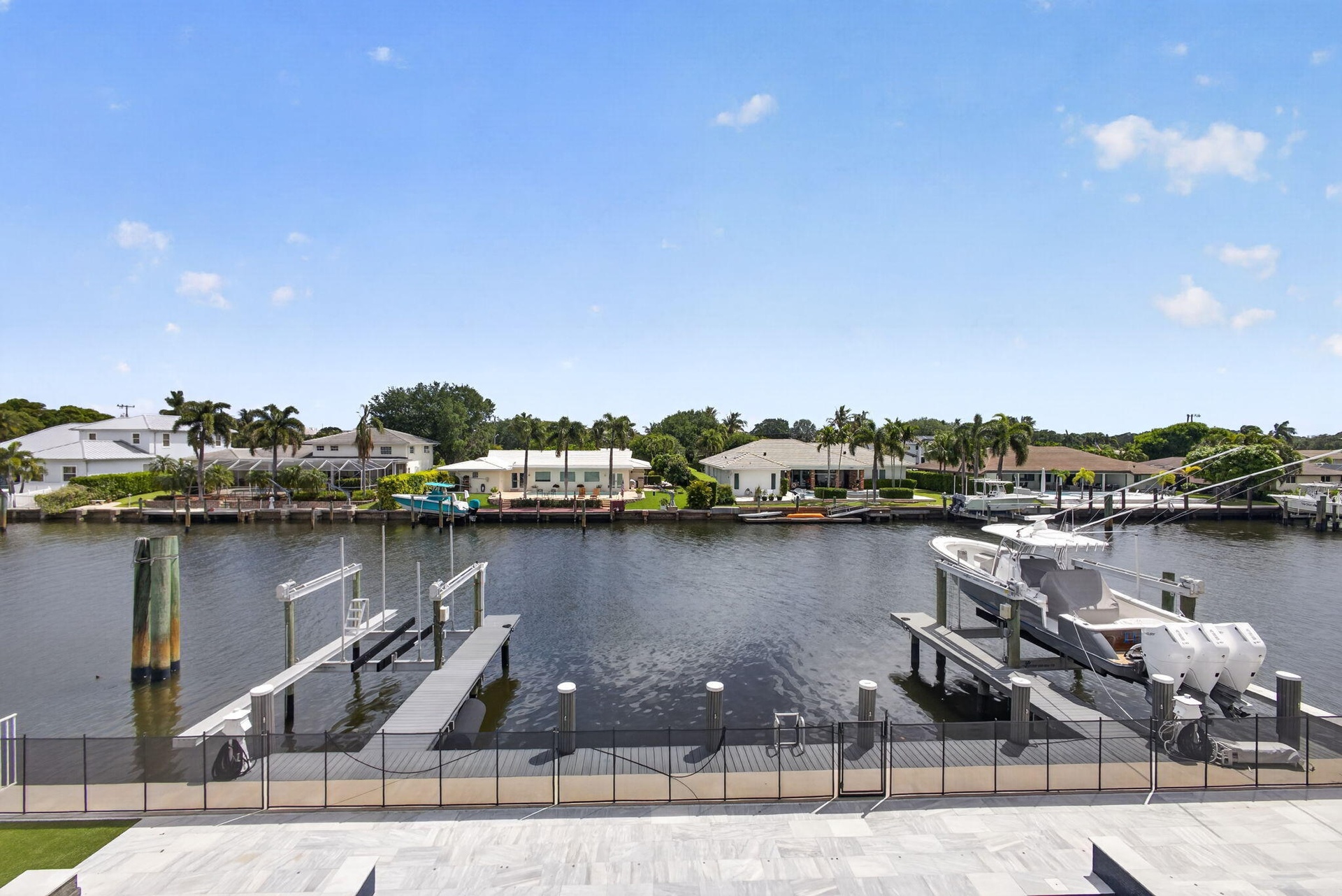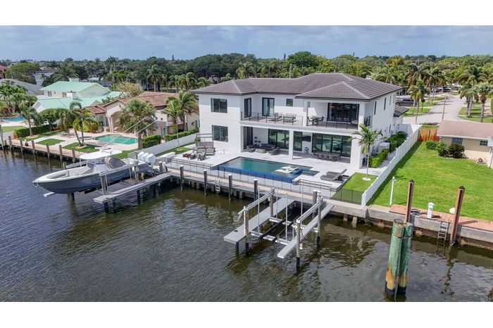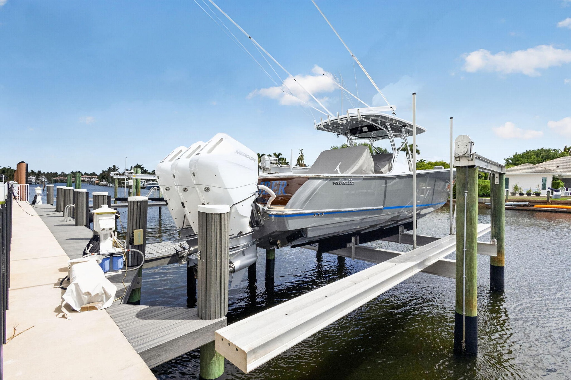 Experience the pinnacle of waterfront living from this exceptional two-story Intracoastal estate, offering over 5,300 square feet of exquisitely designed living space. Privately situated on an expansive .28-acre lot, this remarkable "boater's dream" boasts 90 feet of direct waterfront, a private dock, dual lifts, and unobstructed access to open water with no fixed bridges. Newly constructed in 2021, this custom residence was thoughtfully designed with uncompromising craftsmanship and a seamless blend of modern sophistication and relaxed coastal elegance. The open-concept floor plan captures breathtaking water views from nearly every room and features 4 bedrooms plus a den/office, 5 full baths, and two luxurious primary suites—ideal for multigenerational living or hosting in style. A private elevator adds both convenience and refinement. At the heart of the home, the expansive chef's kitchen is a statement of both form and function, showcasing custom cabinetry, premium Thermador appliances including a double oven, six-burner gas range, two dishwashers, dual quartz islands, and a spacious walk-in pantry—perfectly suited for both everyday living and grand-scale entertaining. The primary suite is a true sanctuary, offering an enormous balcony (accessible by all 3 upstairs bedrooms) with sweeping NPB Waterway views, 2 massive walk-in closets with California Closet built-ins, and custom ceiling detail that adds warmth and architectural distinction. The spa-inspired bath is nothing short of extraordinary, featuring a grand double-entry shower, oversized soaking tub and elegant his-and-her vanities, and 2 water closets. An impressive array of designer finishes and enhancements elevate the home throughout, including wide-plank wood flooring, custom built-ins, curated wall coverings, a striking glass-railed staircase, dual laundry rooms, tankless water heater, whole-house generator, impact windows and doors throughout, reverse osmosis water system, custom lighting, and California Closets in every room—including the garage. Step outside to your private resort-style oasis. Framed by sandblasted marble pavers, the outdoor living space is nothing short of spectacular, featuring an oversized infinity-edge pool with spa and sun shelf, artificial turf, covered patio with tongue-and-groove Synergy wood ceilings, outdoor shower, and a fully equipped summer kitchen. The dock is outfitted with two boat lifts (16,000 lb. and 24,000 lb.) and electric pedestals with both 30-amp and 50-amp service. This extraordinary North Palm Beach Waterway residence offers a lifestyle beyond compare—where luxury, comfort, and world-class boating converge.