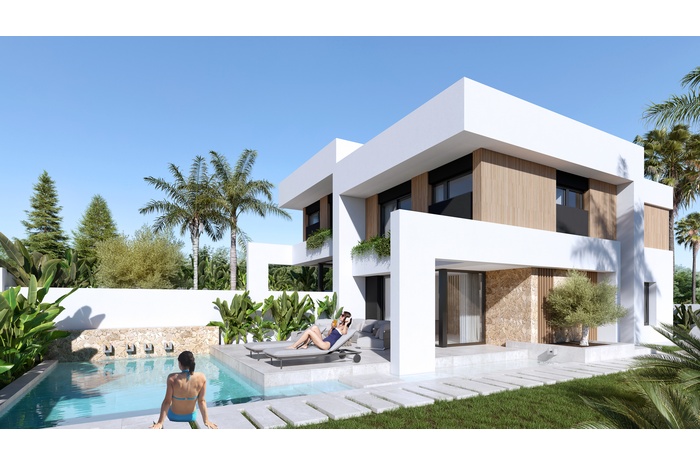 8-NEW VILLAS AT THE URB. LAS FILIPINAS, “VILLAMARTIN” Next Promotion of 8 New State of the Art Villas, distributed in 3 large double bedrooms, 2 modern bathrooms with double sink and a family toilet, built in plots of 300 m2 with the latest quality materials generation. The complex is near the shops, supermarket, restaurants, pharmacy, etc. And in between the international Golf courses of Villamarin, Campoamor, las Ramblas and las Colinas. The enclave is just up the road from the Orihuela beaches and about 35 miles from the Murcia or Alicante airports. These impressive Villas are developed over two floors to enjoy the design and comfort in there approximate 170 sq. meters built with the possibility to have a semibasement or a house sunroof. The Villas ground floor has an impressive luxurious front Living area where the TV side wall is panelled with natural stones and with sliding double glassed doors having access to a large front terrace where we find the swimming pool with 3 water fountains. There is also an ultra-modern fully fitted open kitchen illuminated with Led light and a large dining-room area with views to the garden. The first floor has two double bedrooms with fitted wardrobes, a family bathroom with two sinks and a large master bedroom with the bed wall being panelled in an oak board and mirrors in both sides and a magnificent ensuite bathroom with double sinks and with views to the pool. The Villas will also benefit of conduct A/C pre-installation, bathrooms with under floor hitting, full alarm installation, electric window shutters, front gate with video camera, remote control car gate and the very latest quality materials finishing’s...