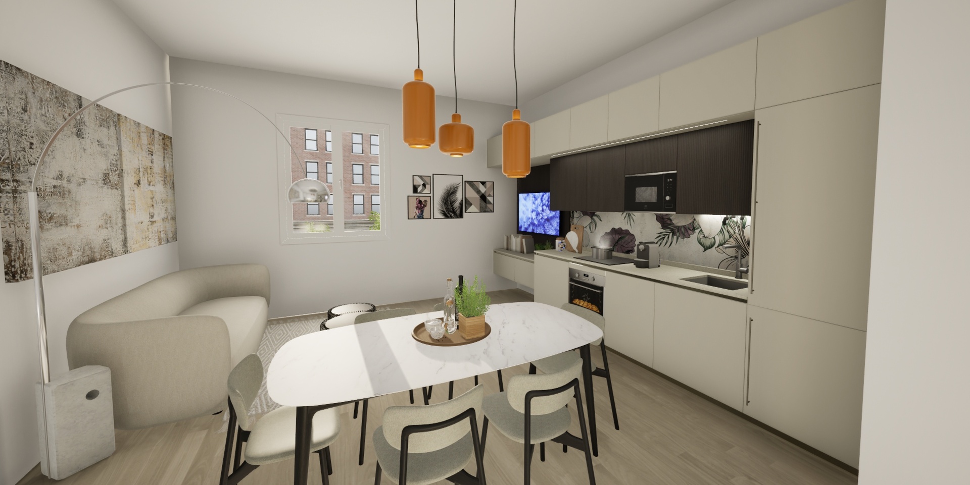 The property opens onto a spacious entrance hall, accessible via a stairwell served by an elevator, where it is possible to create functional storage solutions such as a wardrobe or shoe cabinet. This area connects seamlessly to the bright and well-proportioned living room with open-plan kitchen.