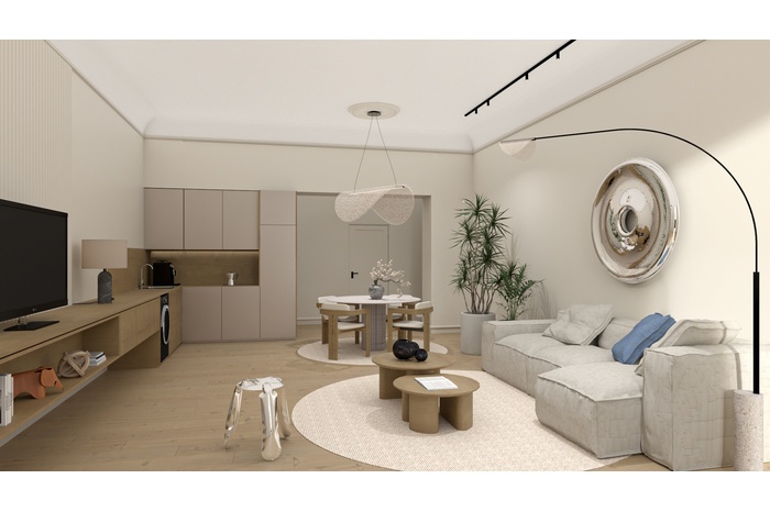 The apartment is located on the first floor of an elegant Liberty-style building with only 10 residential units. It benefits from a dual exposure (street and inner courtyard) with an east-west orientation, ensuring excellent natural light throughout the day thanks to open surroundings that do not obstruct the living area windows.