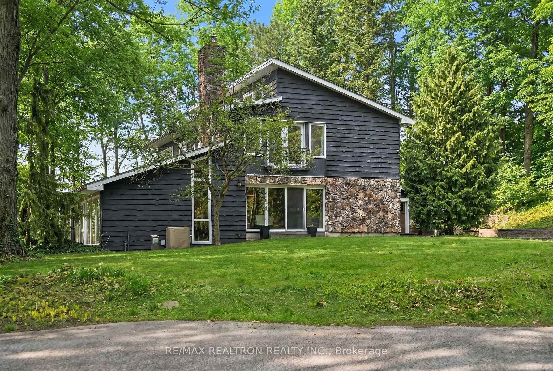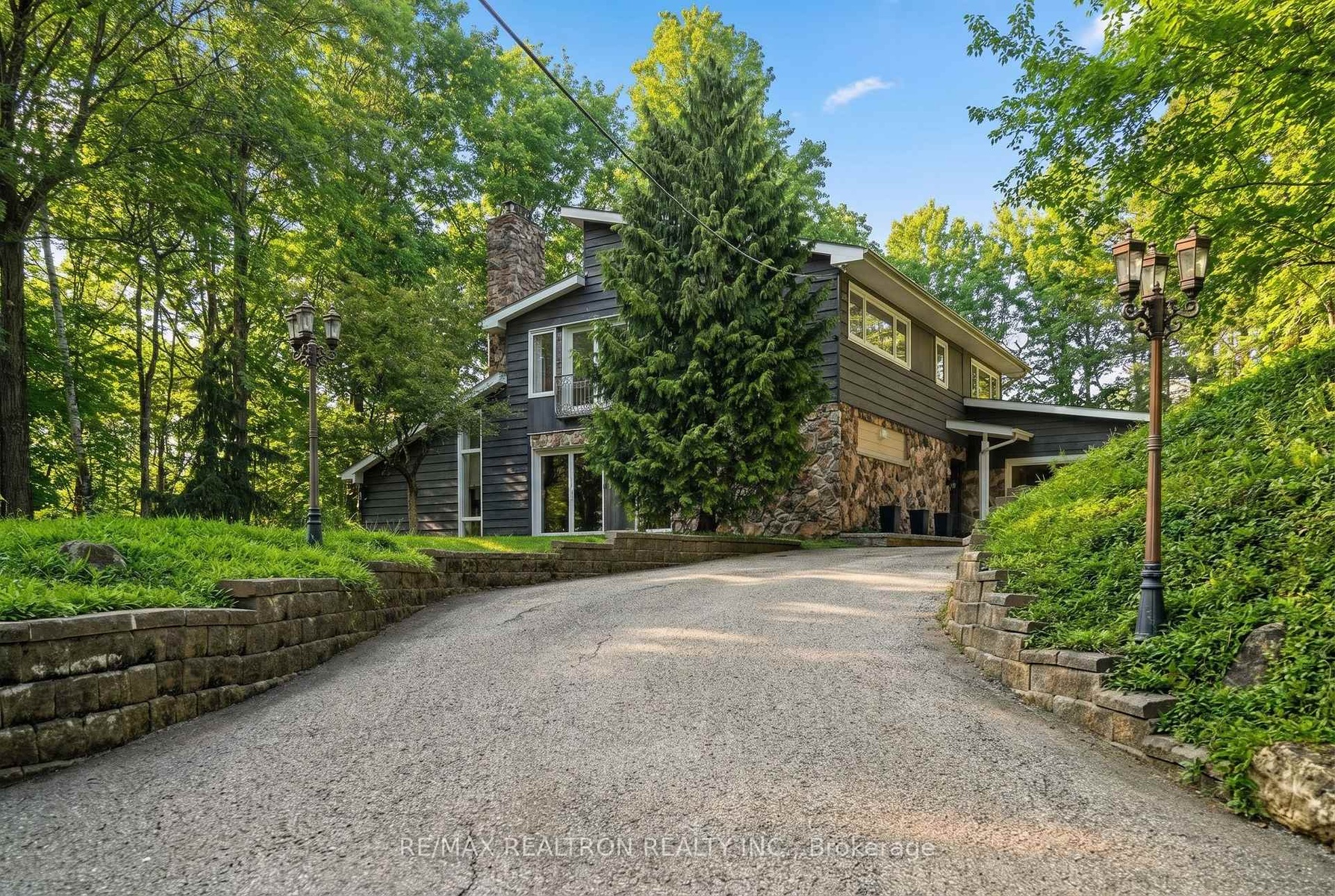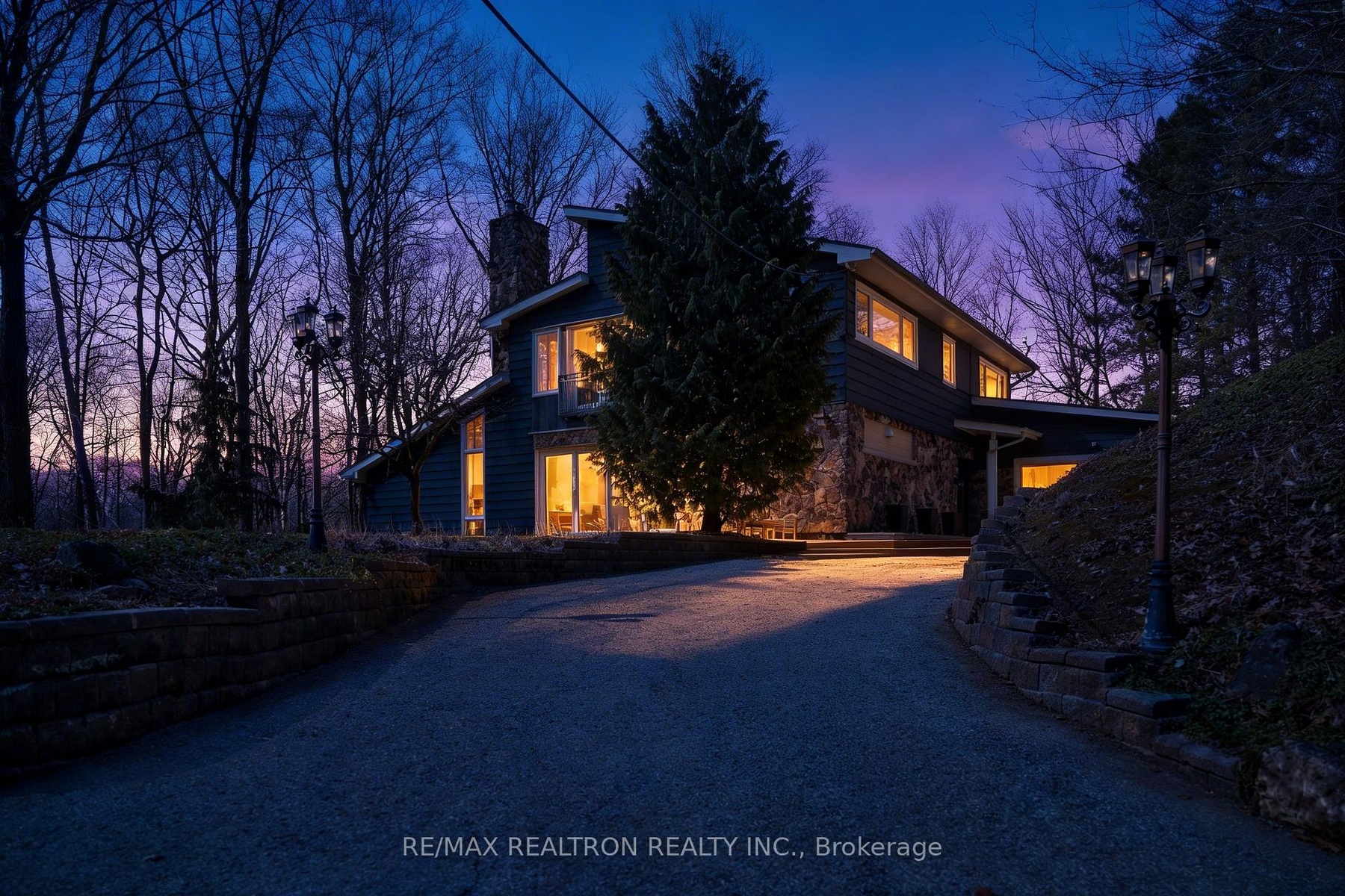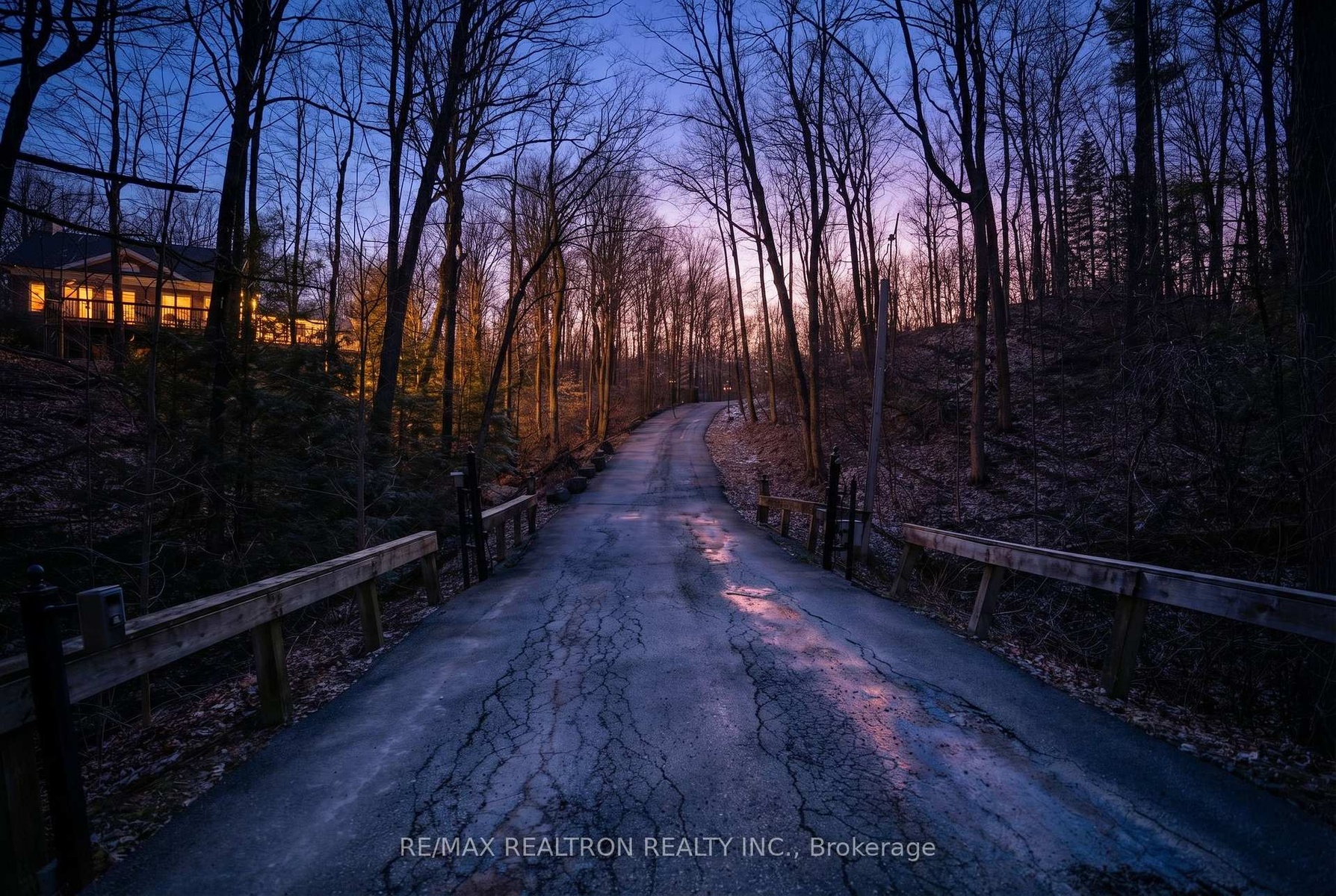 Tucked away within 4.12 acres of serene, forested landscape, this extraordinary custom residence offers an unparalleled blend of seclusion, sophistication, and contemporary living-just moments from the city. Thoughtfully reimagined, the home seamlessly preserves its original charm while embracing modern elegance. A stunning heritage stone fireplace and dramatic volcanic stone feature wall anchor the living space, where expansive windows invite in breathtaking ravine and woodland views-creating a living canvas that changes with the seasons. At the heart of the home, A fully integrated German-inspired kitchen defined by clean architectural lines, featuring a sculptural waterfall island in premium Cambria quartz with marble-inspired veining and architectural concrete-style cabinetry. A seamless cooking wall with integrated Miele cooking surface and Teppanyaki grill is complemented by a curated Miele appliance suite, including built-in oven, microwave, steam oven, coffee system, warming drawer, and integrated dishwasher. A dedicated home office overlooks the tranquil backyard, offering an inspiring setting immersed in nature. Upstairs, the primary suite is a private sanctuary, complete with a sleek electric fireplace, a relaxing sitting area, and a spa-inspired ensuite featuring heated floors for year-round comfort. Additional bedrooms are beautifully appointed with custom built-ins, generous closet space, and sweeping panoramic views. The finished lower level provides versatile space for recreation, wellness, or entertainment. Recent upgrades include a 200-amp electrical panel, updated mechanical systems, and a comprehensive security system for peace of mind. A winding private drive guide you through peaceful woodlands to this remarkable residence-where luxury and nature exist in perfect harmony. An exceptional opportunity also awaits to design and build your own infinity pool, further elevating this already breathtaking retreat.