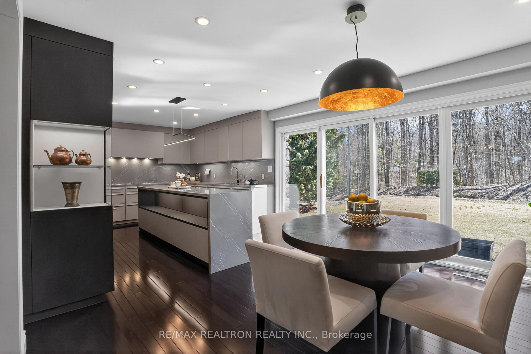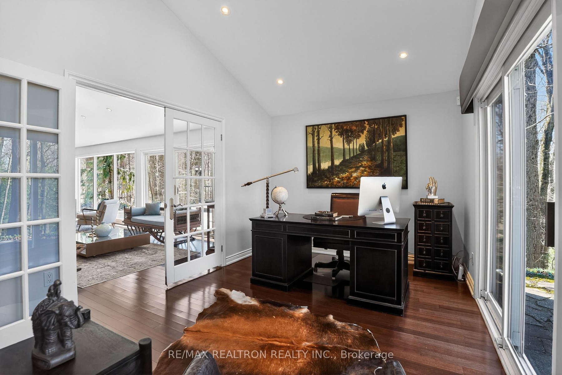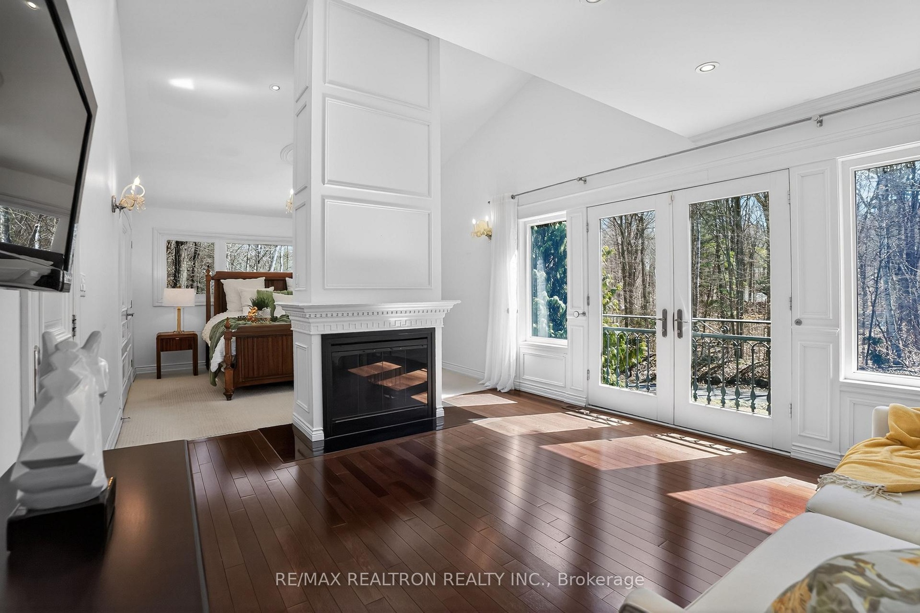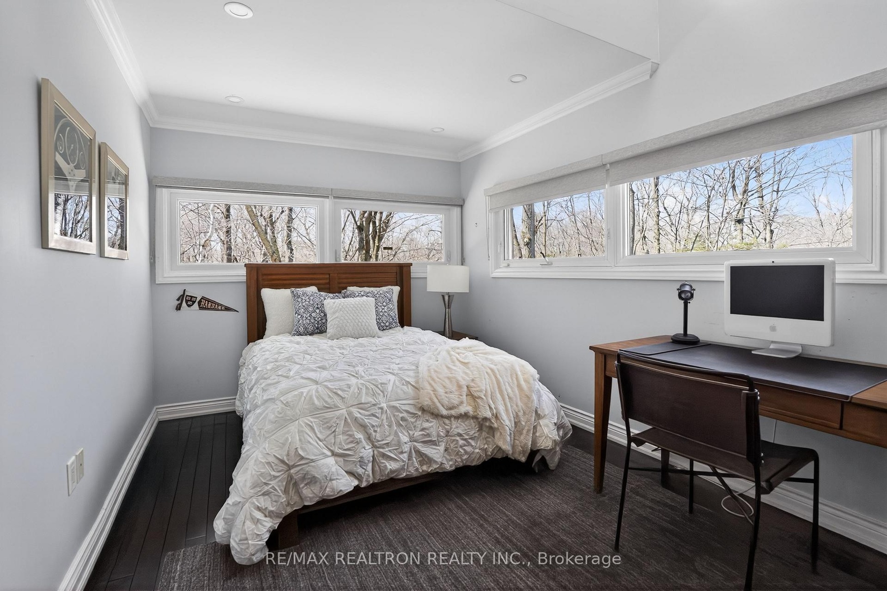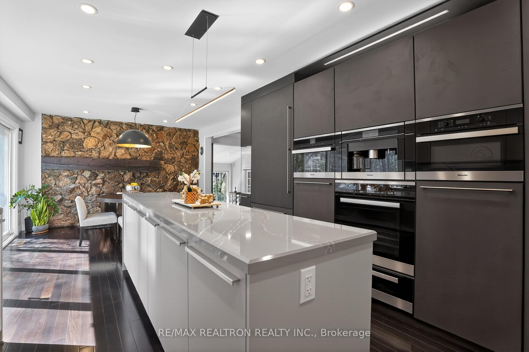 Tucked away within 4.12 acres of serene, forested landscape, this extraordinary custom residence offers an unparalleled blend of seclusion, sophistication, and contemporary living-just moments from the city. Thoughtfully reimagined, the home seamlessly preserves its original charm while embracing modern elegance. A stunning heritage stone fireplace and dramatic volcanic stone feature wall anchor the living space, where expansive windows invite in breathtaking ravine and woodland views-creating a living canvas that changes with the seasons. At the heart of the home, A fully integrated German-inspired kitchen defined by clean architectural lines, featuring a sculptural waterfall island in premium Cambria quartz with marble-inspired veining and architectural concrete-style cabinetry. A seamless cooking wall with integrated Miele cooking surface and Teppanyaki grill is complemented by a curated Miele appliance suite, including built-in oven, microwave, steam oven, coffee system, warming drawer, and integrated dishwasher. A dedicated home office overlooks the tranquil backyard, offering an inspiring setting immersed in nature. Upstairs, the primary suite is a private sanctuary, complete with a sleek electric fireplace, a relaxing sitting area, and a spa-inspired ensuite featuring heated floors for year-round comfort. Additional bedrooms are beautifully appointed with custom built-ins, generous closet space, and sweeping panoramic views. The finished lower level provides versatile space for recreation, wellness, or entertainment. Recent upgrades include a 200-amp electrical panel, updated mechanical systems, and a comprehensive security system for peace of mind. A winding private drive guide you through peaceful woodlands to this remarkable residence-where luxury and nature exist in perfect harmony. An exceptional opportunity also awaits to design and build your own infinity pool, further elevating this already breathtaking retreat.