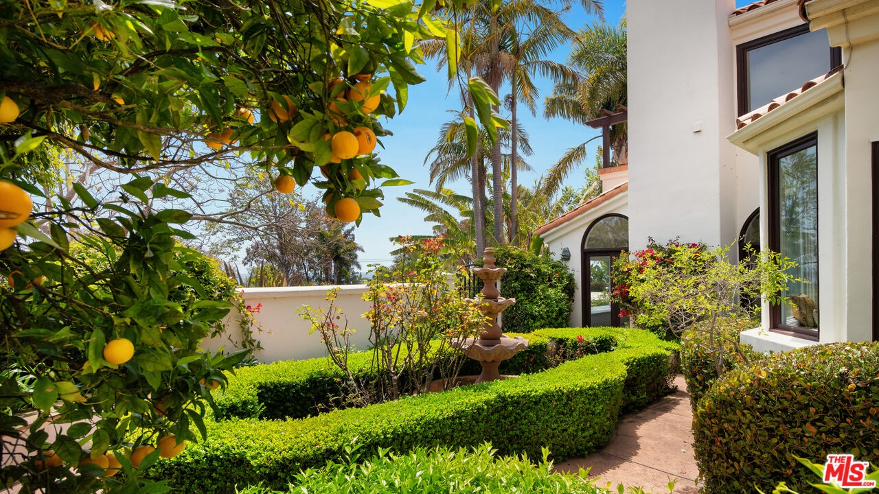 Privately located within a gated enclave of just four homes, this coastal residence offers ocean views, elegant design, and a resort-like lifestyle. A gated driveway opens to a spacious motor court with parking for up to eight vehicles and views of the Pacific visible from the front yard. Through a wood front door, the double-height foyer welcomes with wood floors and a sculptural light fixture, setting the stage for the refined interiors ahead.To the right, the sunken living room features a marble accent wall with a sleek linear fireplace, wood-beamed ceilings, French doors, a bay window, and rich wood flooring. Just a step up, the formal dining room continues the elegance with coffered ceilings, accordion glass doors that open to the outdoors, and seamless indoor-outdoor flow.The kitchen can be accessed through a sliding wood door or the main hall. Tile floors, wood beams, and French windows frame this chef's space, equipped with stone counters, a marble backsplash, a Viking oven with barbecue cooktop, Viking hood, Sub-Zero fridge and freezer, GE microwave and dishwasher, and ample cabinetry. A built-in desk area adds versatility, and just off the kitchen is a family room with wood floors, vaulted ceilings, a built-in breakfast bench, and direct access to the backyard with pool views.To the left of the foyer, a hallway leads to a bedroom or office with French windows, sliding wood closet doors, and pool views. Nearby is a large bathroom with stone tile floors, a stone vanity with illuminated mirror, and a tiled shower. A few steps down leads to a den with wood floors, French doors to the driveway with ocean views, a bar area, and access to a two-car garage with built-ins and a private sauna.Upstairs, the primary suite features wood floors, recessed lighting, a stone fireplace, and sliding doors to a pergola-covered balcony with panoramic ocean views. The en suite bath has tile floors, a freestanding tub, open shower, bidet, and double sinks with French windows capturing the view. A generous closet includes built-ins and pull-down stairs to a loft for additional storage.Nearby, the laundry room is outfitted with Whirlpool washer and dryer, stone counters, and built-in cabinets. Another upstairs bedroom features a bay window with pool views and French windows with ocean views, plus mirrored closet doors. A nearby bath offers stone tile, a shower, and more ocean vistas. The final upstairs bedroom includes wood floors, a built-in desk, sliding closet, large closet, and stunning coastal views.Outside, the backyard is built for entertaining with a wood deck beneath a pergola, multiple lounge and dining areas, and steps down to a full outdoor kitchen with BBQ, sink, tiled counters, and bar seating. A grassy lawn, citrus trees, and a peaceful garden with fountain add a tranquil feel. The raised pool area features an in-ground hot tub, PebbleTec floors, a waterfall feature, automatic cover, and privacy-enhancing landscaping throughout.