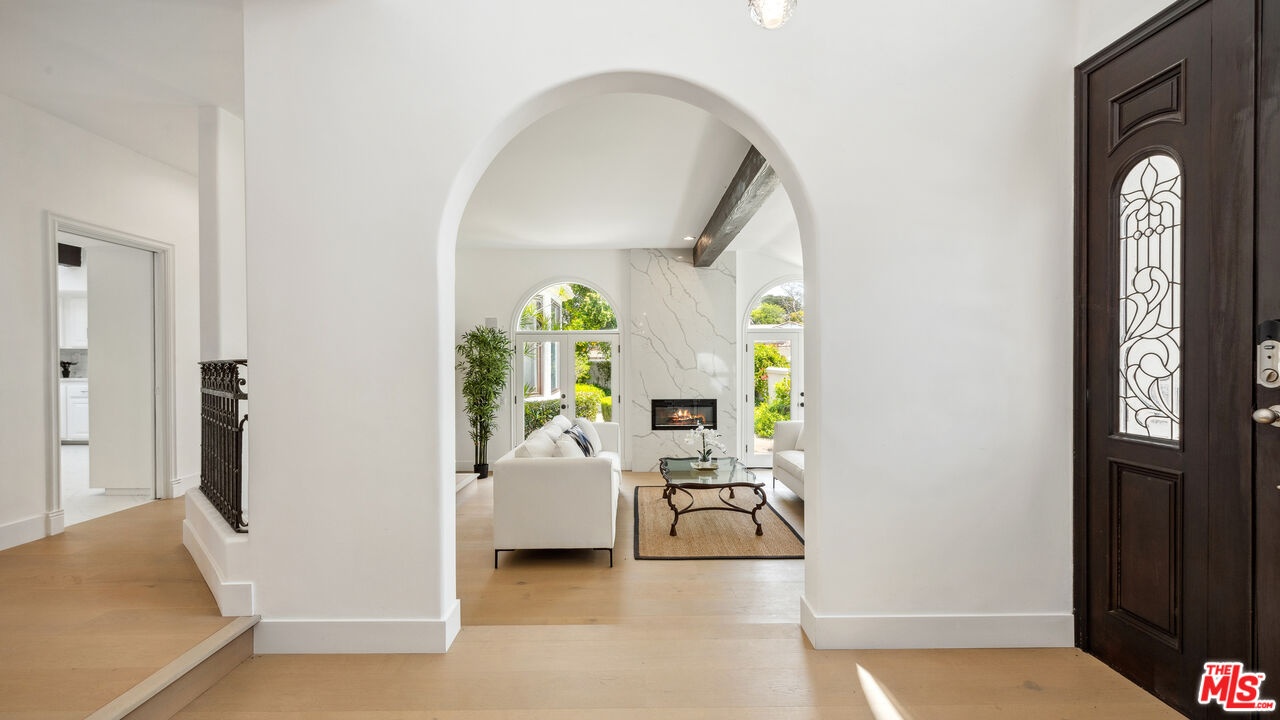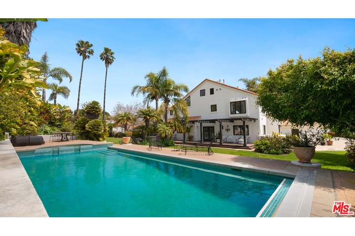 Privately located within a gated enclave of just four homes, this coastal residence offers ocean views, elegant design, and a resort-like lifestyle. A gated driveway opens to a spacious motor court with parking for up to eight vehicles and views of the Pacific visible from the front yard. Through a wood front door, the double-height foyer welcomes with wood floors and a sculptural light fixture, setting the stage for the refined interiors ahead.To the right, the sunken living room features a marble accent wall with a sleek linear fireplace, wood-beamed ceilings, French doors, a bay window, and rich wood flooring. Just a step up, the formal dining room continues the elegance with coffered ceilings, accordion glass doors that open to the outdoors, and seamless indoor-outdoor flow.The kitchen can be accessed through a sliding wood door or the main hall. Tile floors, wood beams, and French windows frame this chef's space, equipped with stone counters, a marble backsplash, a Viking oven with barbecue cooktop, Viking hood, Sub-Zero fridge and freezer, GE microwave and dishwasher, and ample cabinetry. A built-in desk area adds versatility, and just off the kitchen is a family room with wood floors, vaulted ceilings, a built-in breakfast bench, and direct access to the backyard with pool views.To the left of the foyer, a hallway leads to a bedroom or office with French windows, sliding wood closet doors, and pool views. Nearby is a large bathroom with stone tile floors, a stone vanity with illuminated mirror, and a tiled shower. A few steps down leads to a den with wood floors, French doors to the driveway with ocean views, a bar area, and access to a two-car garage with built-ins and a private sauna.Upstairs, the primary suite features wood floors, recessed lighting, a stone fireplace, and sliding doors to a pergola-covered balcony with panoramic ocean views. The en suite bath has tile floors, a freestanding tub, open shower, bidet, and double sinks with French windows capturing the view. A generous closet includes built-ins and pull-down stairs to a loft for additional storage.Nearby, the laundry room is outfitted with Whirlpool washer and dryer, stone counters, and built-in cabinets. Another upstairs bedroom features a bay window with pool views and French windows with ocean views, plus mirrored closet doors. A nearby bath offers stone tile, a shower, and more ocean vistas. The final upstairs bedroom includes wood floors, a built-in desk, sliding closet, large closet, and stunning coastal views.Outside, the backyard is built for entertaining with a wood deck beneath a pergola, multiple lounge and dining areas, and steps down to a full outdoor kitchen with BBQ, sink, tiled counters, and bar seating. A grassy lawn, citrus trees, and a peaceful garden with fountain add a tranquil feel. The raised pool area features an in-ground hot tub, PebbleTec floors, a waterfall feature, automatic cover, and privacy-enhancing landscaping throughout.