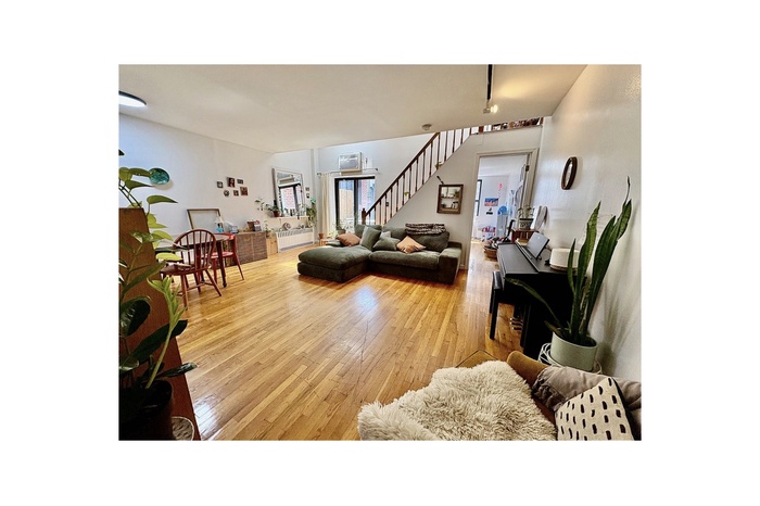 The thoughtfully designed layout is enhanced by four skylights, filling the apartment with sunlight throughout the day and adding to its airy feel. The duplex configuration provides a natural separation between living and sleeping areas, creating both comfort and functionality.