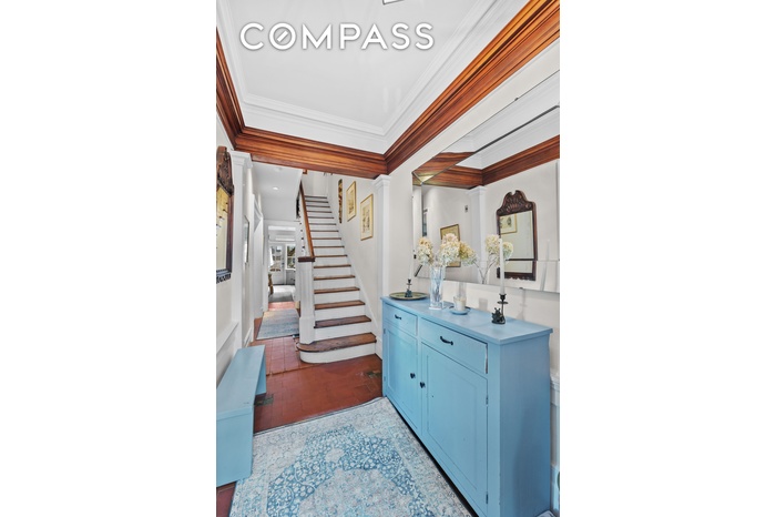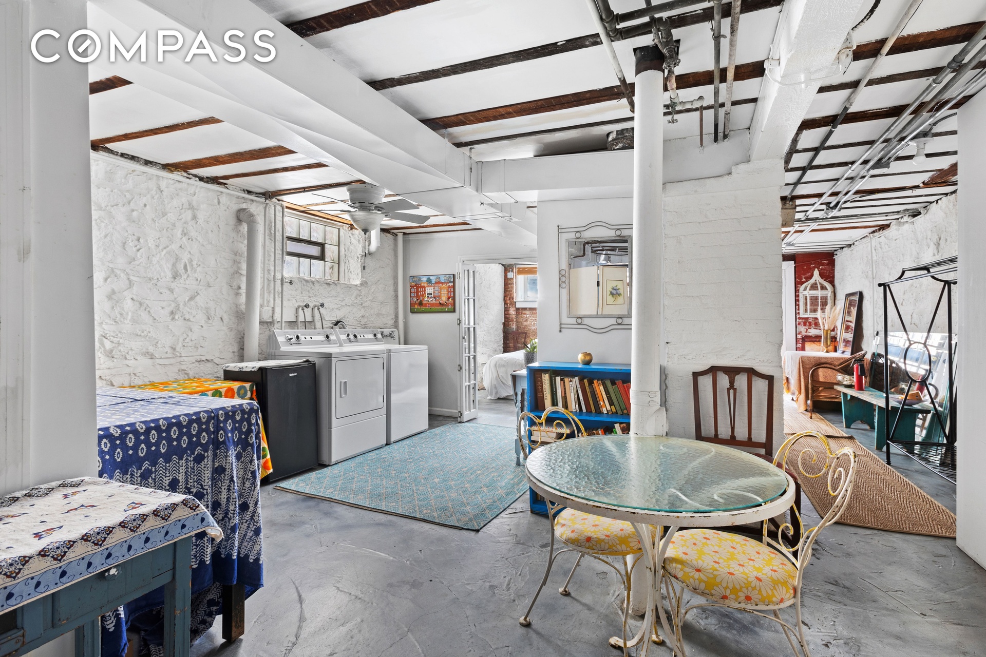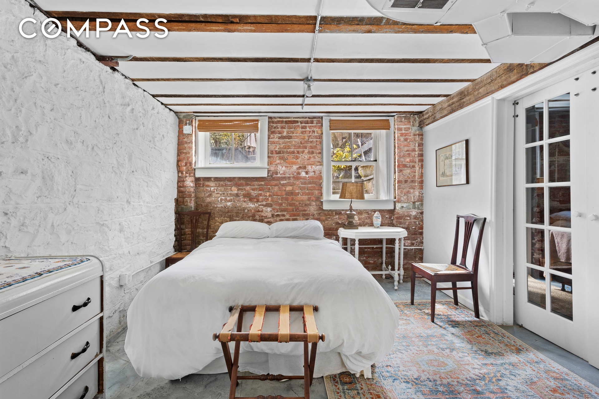 and two glass doors. Rich with character—featuring exposed brick in the bedroom or office, original wooden ceiling beams, and both barn-style and French doors. The bedroom enjoys a view onto the sunny backyard and provides direct access through a rear entrance. This level also includes a full bath and in-unit washer and dryer, offering exceptional flexibility for guest accommodations, recreation, or workspace, along with a dedicated bike room and storage beneath the stoop.