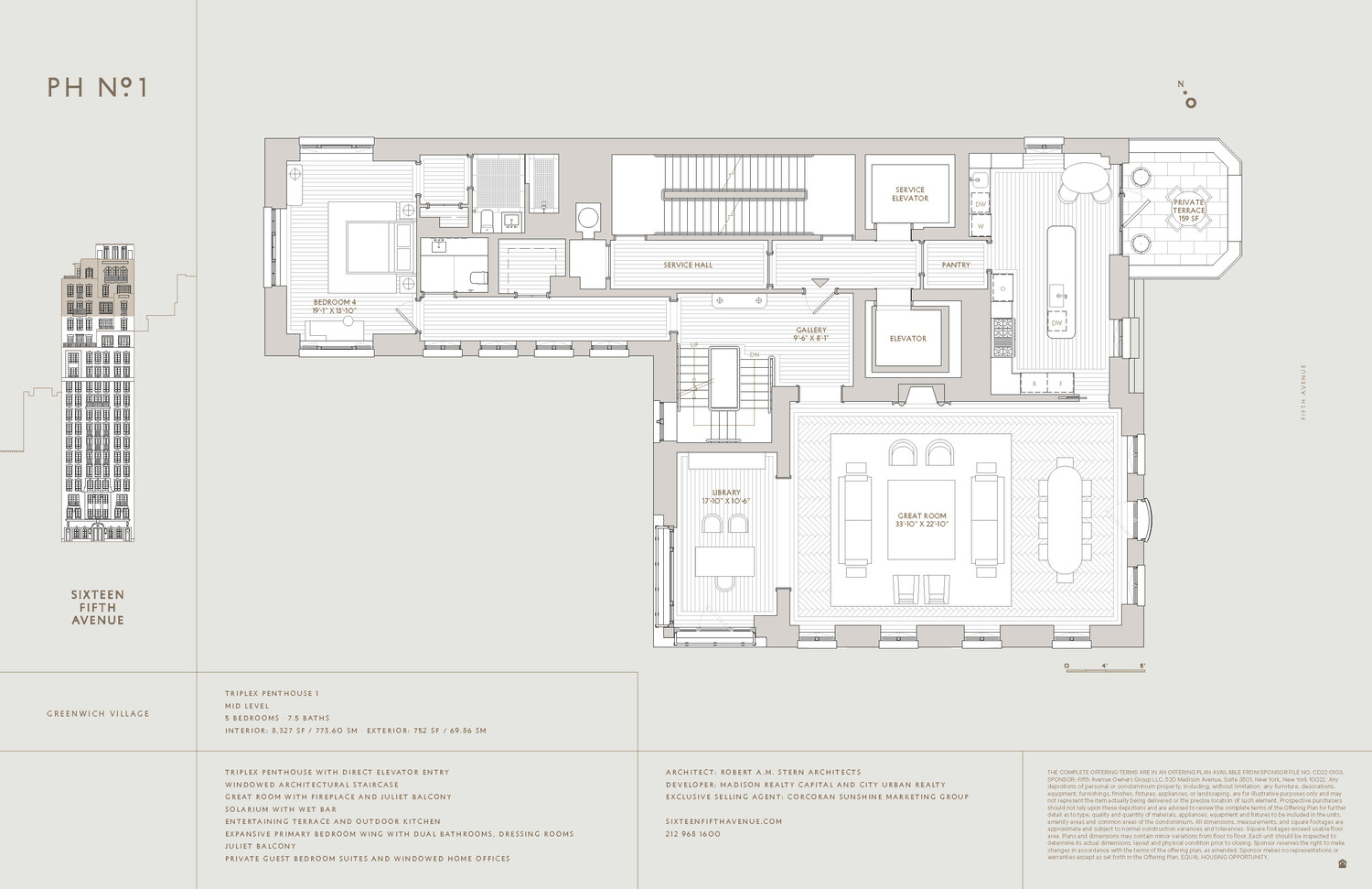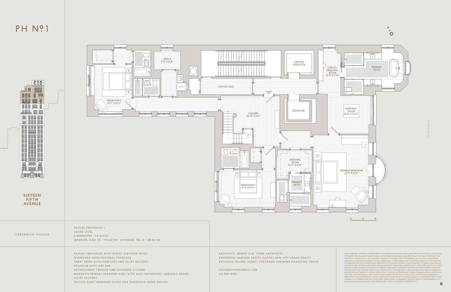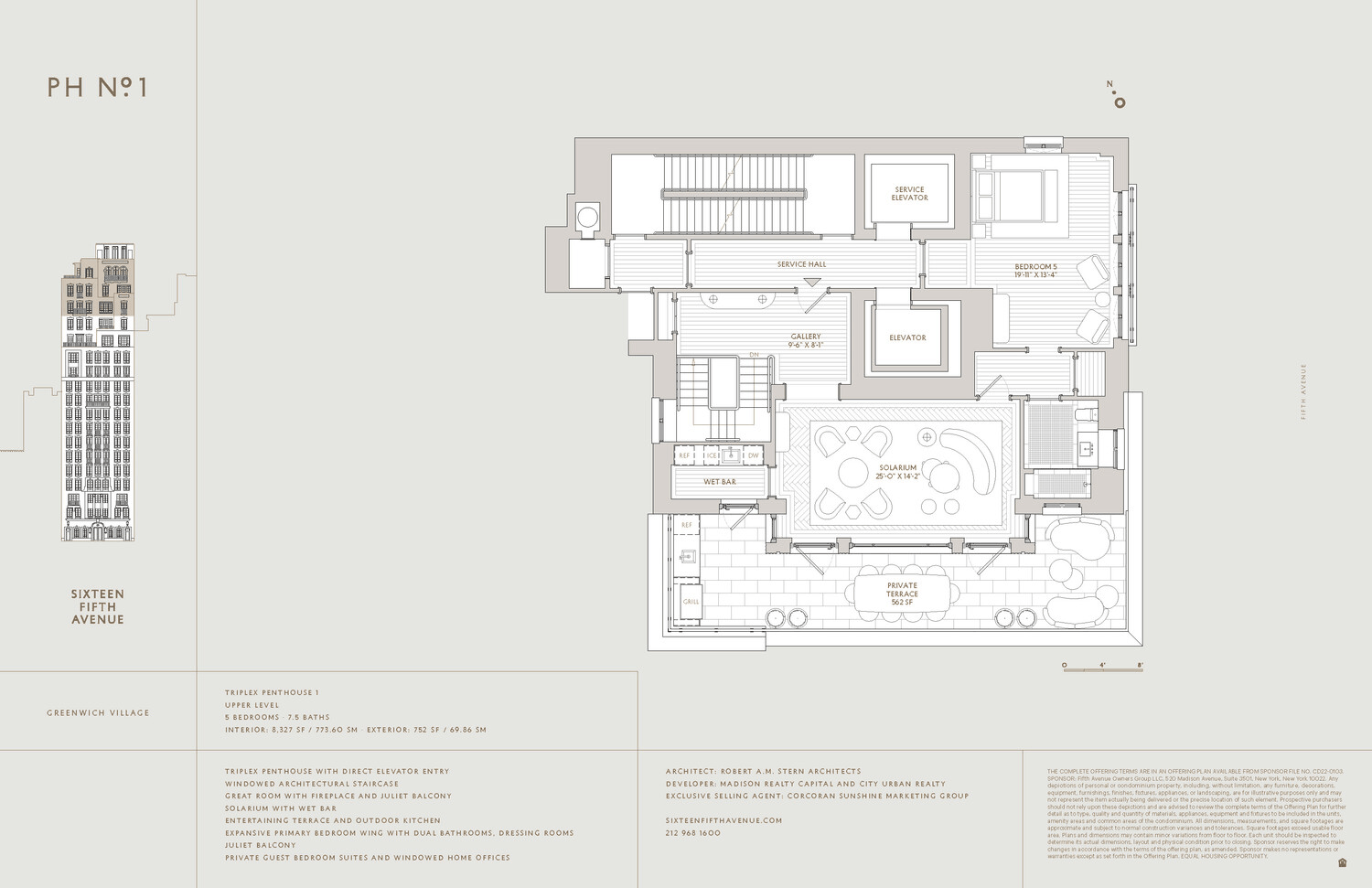 Perched atop Robert A.M. Stern Architect's celebrated Sixteen Fifth Avenue, this extraordinary triplex penthouse is a masterwork of classical architecture and modern luxury, occupying the building's top three floors at the iconic crossroads of lower Fifth Avenue and Greenwich Village. With approximately 8,327 square feet of elegant interiors and 752 square feet of private outdoor space, this 5-bedroom, 7.5 bath residence offers grand scale, rare privacy, and sweeping four-exposure views over Washington Square Park, Downtown Manhattan, and the New York City skyline.