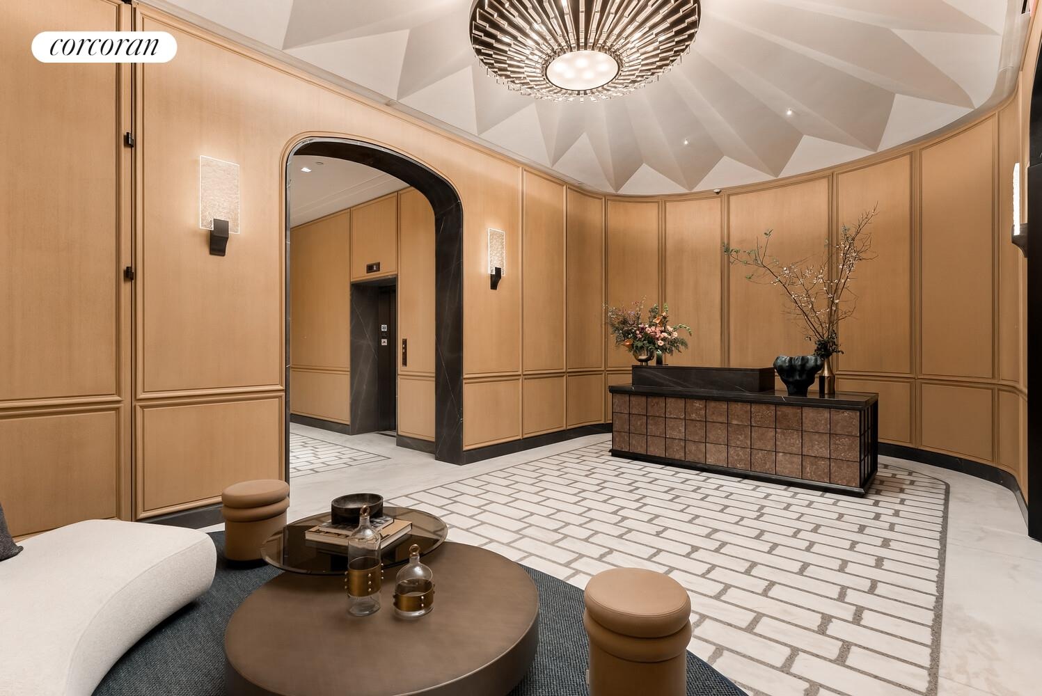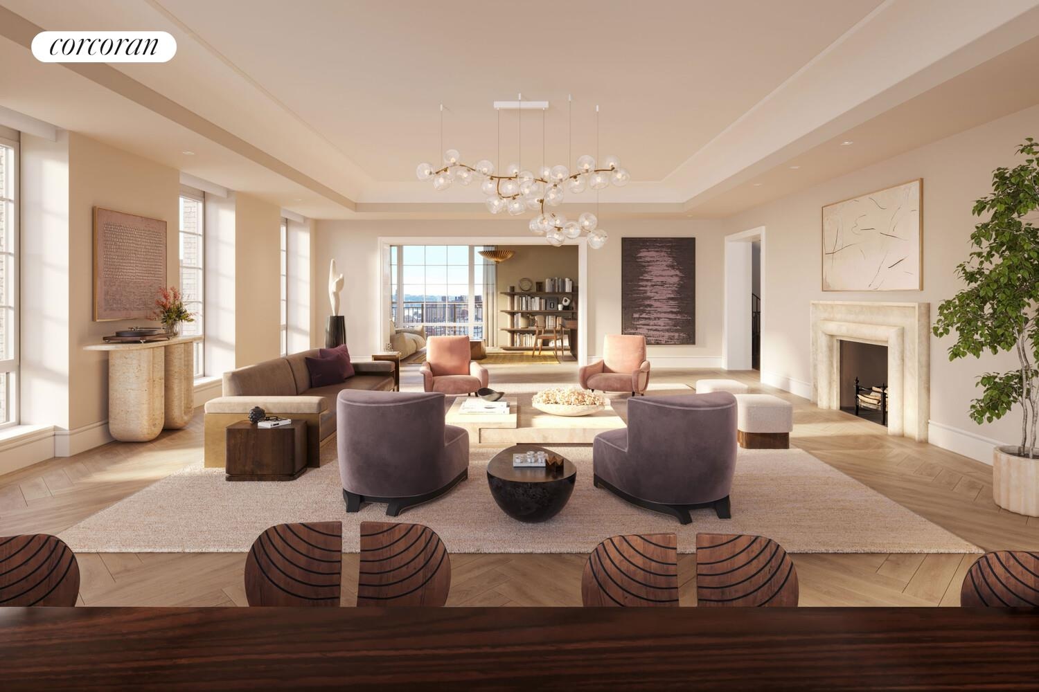 A private landing opens to a grand entrance gallery featuring a custom, windowed, architectural staircase-an immediate statement of craftsmanship and scale. Designed for both formal entertaining and refined daily living, Penthouse 1 features a breathtaking Great Room with herringbone white oak floors, a stone-clad fireplace, and oversized french casement windows. A great room with a library flows seamlessly from the living space, while the windowed Christopher Peacock chef's kitchen blends timeless design with modern performance, complete with Calacutta Gold marble, top-tier Miele appliances, and a breakfast nook opening to a limestone private terrace.