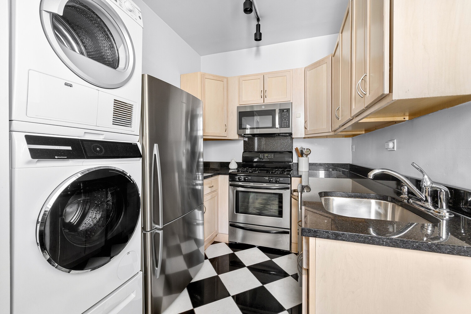 Additional features include an in-unit washer/dryer, refinished hardwood floors, and abundant closet and storage space throughout.