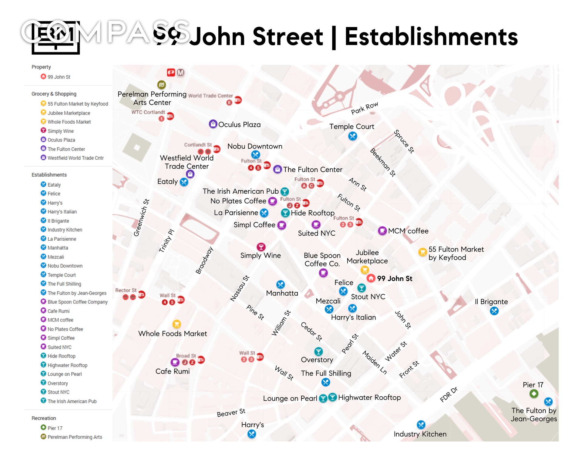 Transportation couldn’t be more convenient. The closest subway lines include the A/C, 2/3, 4/5, and J trains at Fulton Street Station. The East River Ferry provides easy access to DUMBO and Williamsburg, while the nearby PATH train station connects quickly to Jersey City and Hoboken. Fulton Street Station, just one block away, offers multiple subway lines for seamless travel throughout the city.
