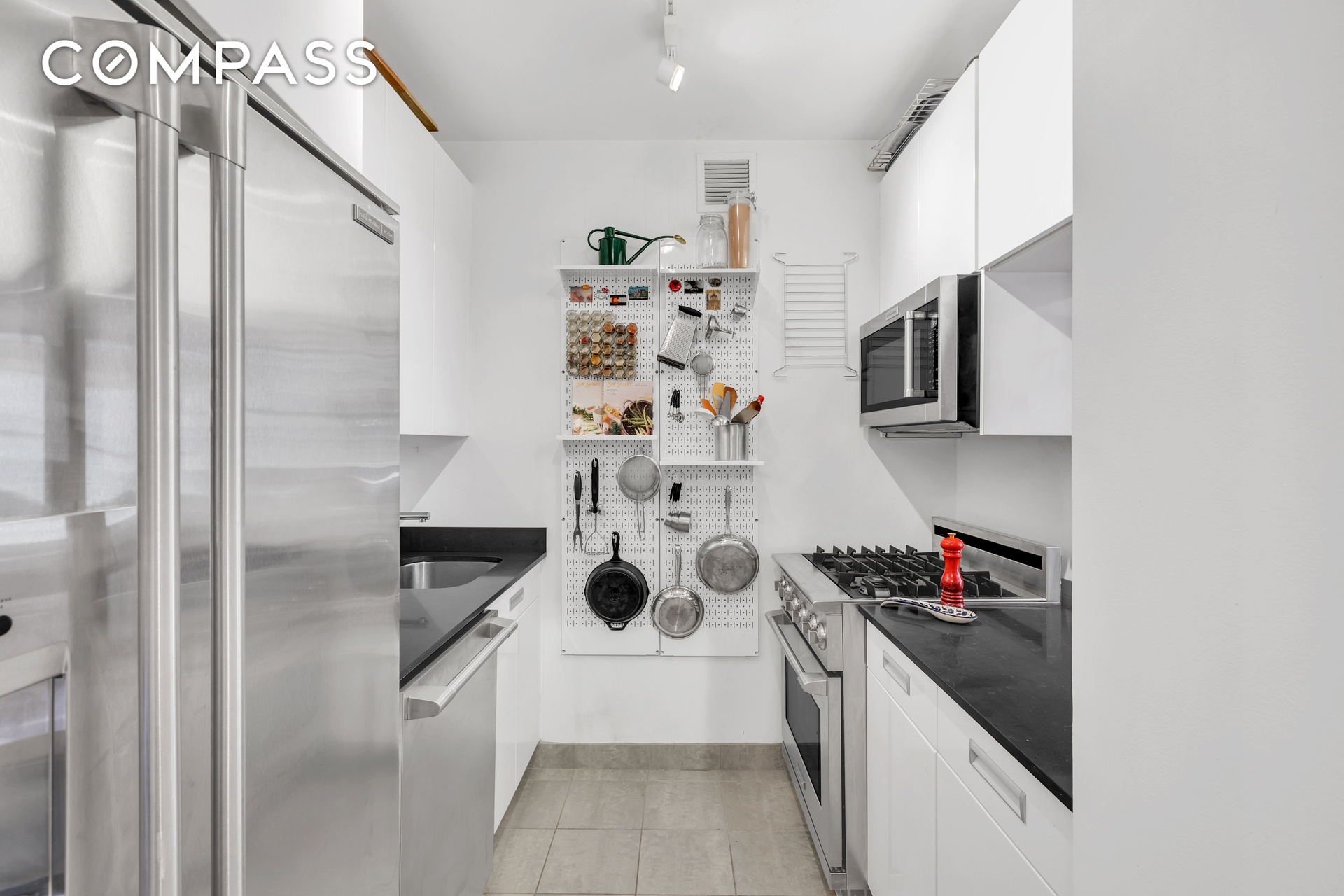 The kitchen is adorned with sleek Electrolux stainless steel appliances, deep gray Caesarstone countertops, and glossy white lacquer cabinets with soft-close drawers.. The spacious bathroom is a true showstopper, featuring luxurious Calcutta marble floors, countertops, and backsplash, creating a chic and polished retreat.