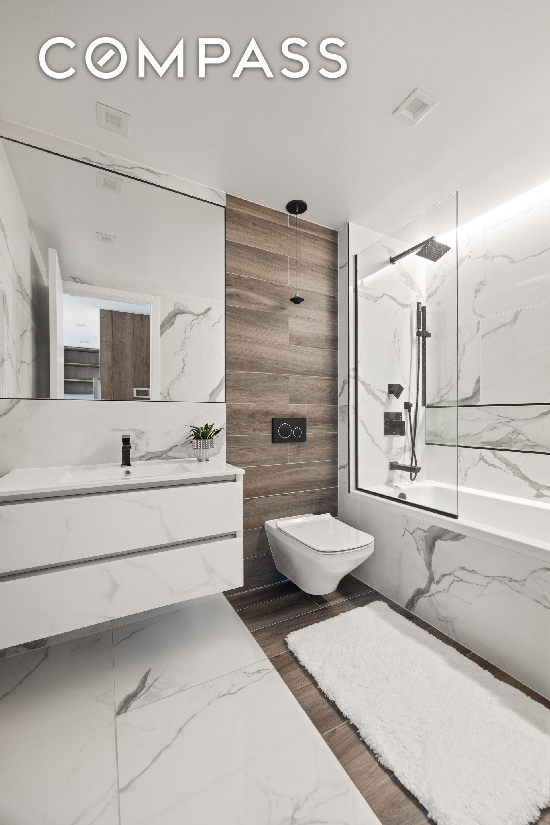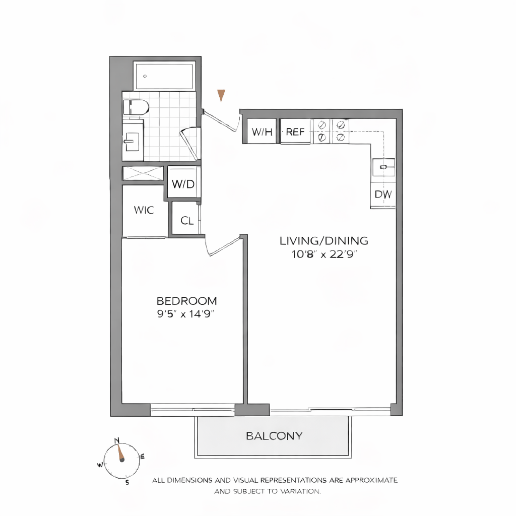 Inside, the apartment features a sunny, south-facing open living and dining area, a sleek contemporary kitchen with generous cabinetry and a full appliance package including a dishwasher, as well as wide-plank wood floors and recessed lighting throughout. The private balcony, accessible from both the living room and the bedroom, offers a lovely spot to enjoy your morning coffee.