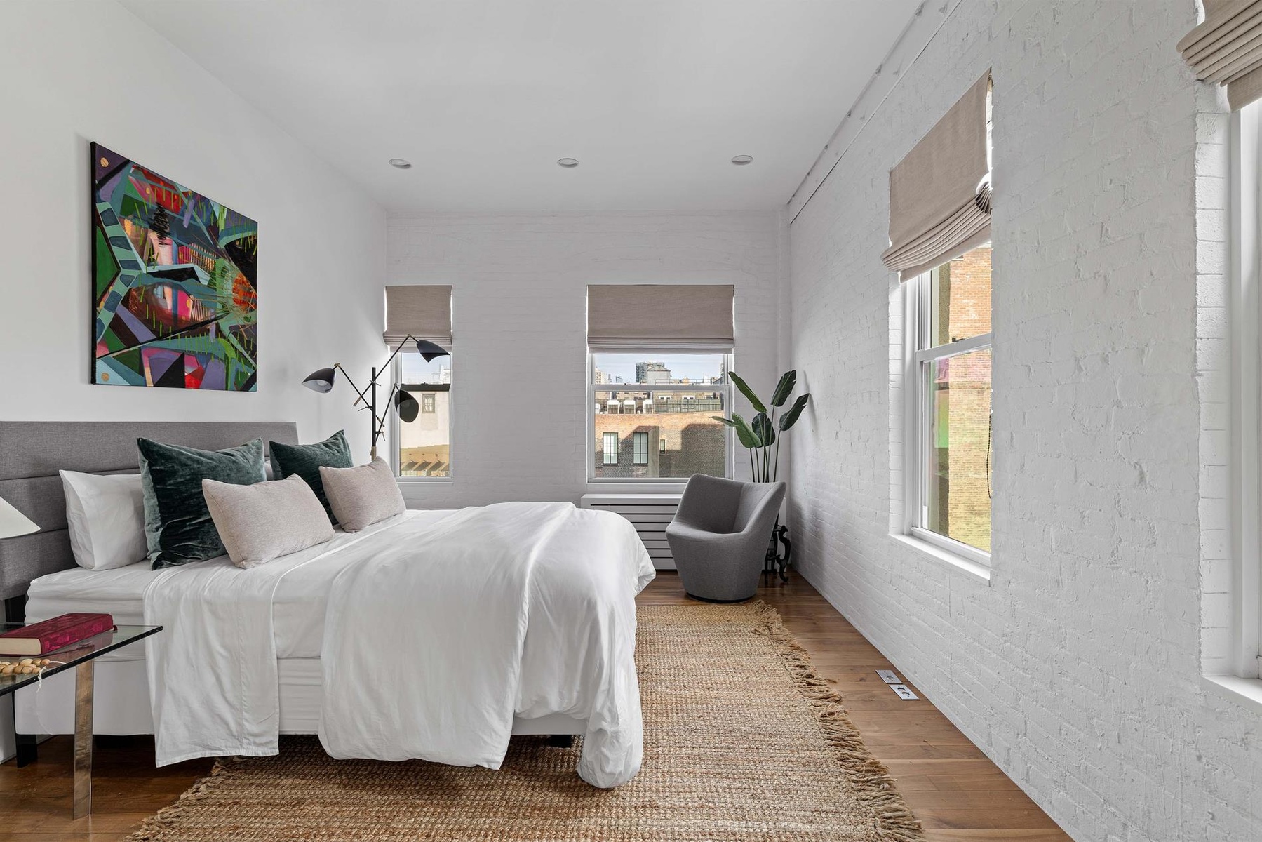 The penthouse at 96 Grand Street offers a rare full floor residence with private elevator access, expansive interior volume, a flexible and well considered layout, and a landscaped rooftop terrace with panoramic city views, thoughtfully blending historic character with modern refinement.