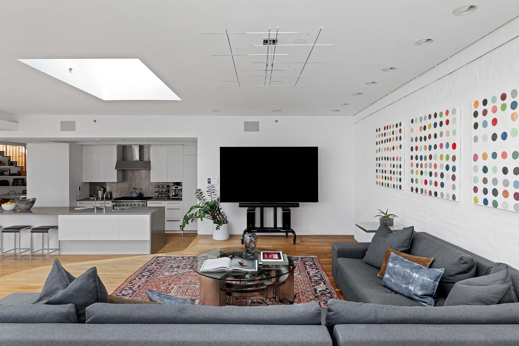 Original brickwork and oak floors reinforce the loft’s authenticity, while an architectural fireplace introduces warmth and texture. A sculptural marble bar positioned beneath a skylight creates a natural focal point, completing the space with a refined yet inviting character.