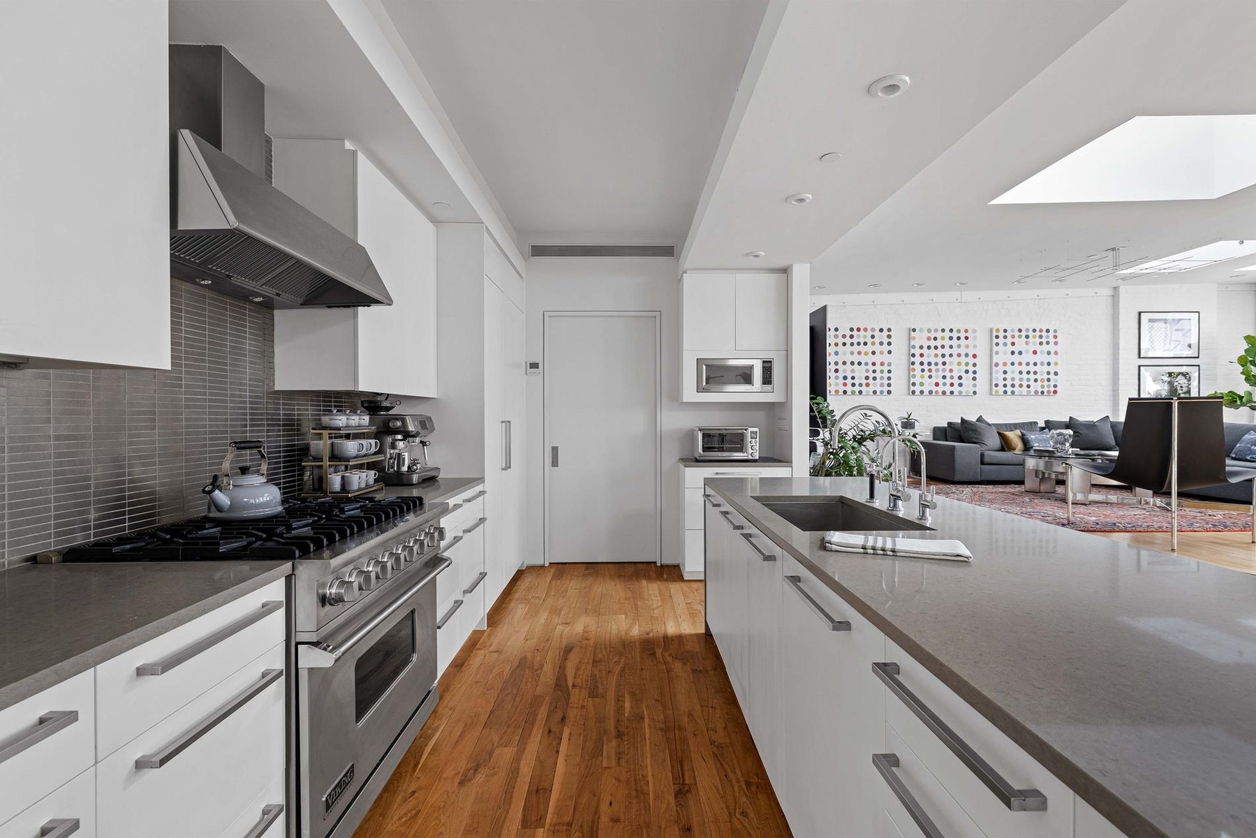 The adjacent chef’s kitchen is outfitted with bespoke Corian cabinetry, a professional grade Viking range, dual Miele dishwashers, Sub-Zero refrigeration, and a large central island.