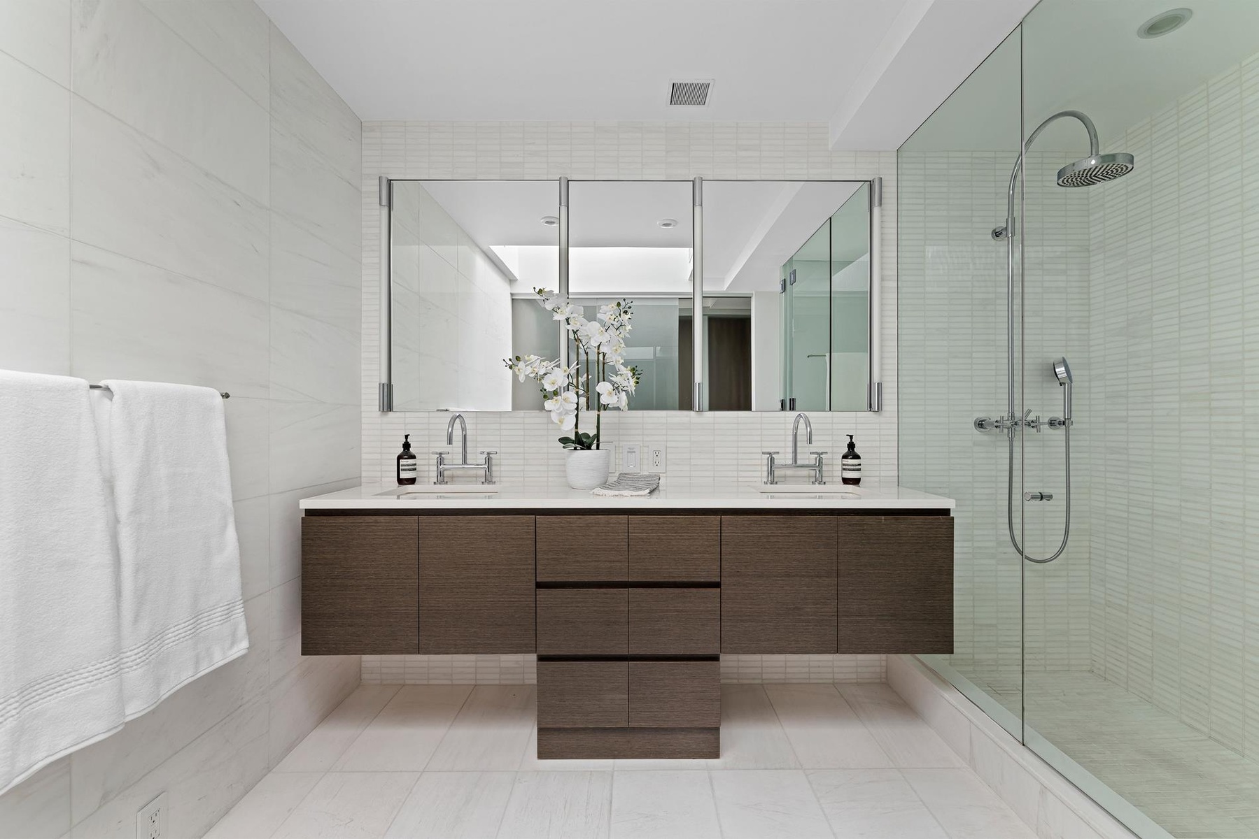A private wing of the residence is arranged with clarity and separation from the main living areas. The primary suite offers a calm retreat with custom oak millwork & a generous dressing room. The spa inspired bathroom features radiant heated floors, a deep soaking tub, a glass enclosed shower, and double vanities.