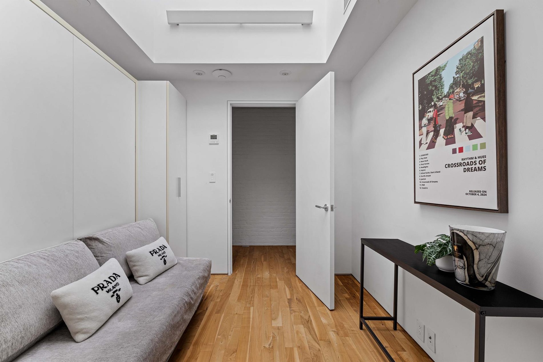 Positioned at the base of the stair, the den is subtly defined by custom wood slats that provide a sense of separation without interrupting light or flow. The result is a comfortable, inviting retreat that feels both private and integrated within the larger loft environment.