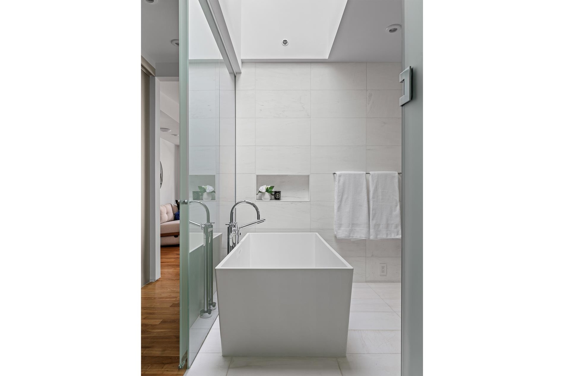 The penthouse opens into a dramatic sequence of light-filled spaces anchored by a 50’+/- great room spanning nearly the full width of the building. Architectural platforms subtly define areas for lounging, dining, and gathering, allowing the open plan to accommodate both large-scale entertaining and quiet everyday living.