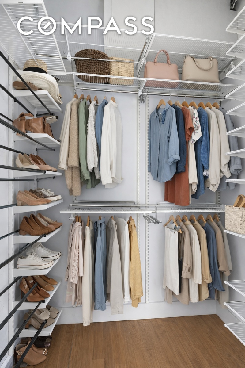 The apartment itself spans 1,326 square feet with triple exposures, soaring ceilings, and a west-facing living room that catches the sunset over the rooftops. The kitchen has been done right -- reclaimed wood cabinetry, marble countertops, a Capital range, 36-inch Liebherr refrigerator, and Bosch dishwasher. Wide-plank hardwood floors, custom heating and cooling, an LG washer/dryer, and Elfa closets throughout. Nothing half-finished here.