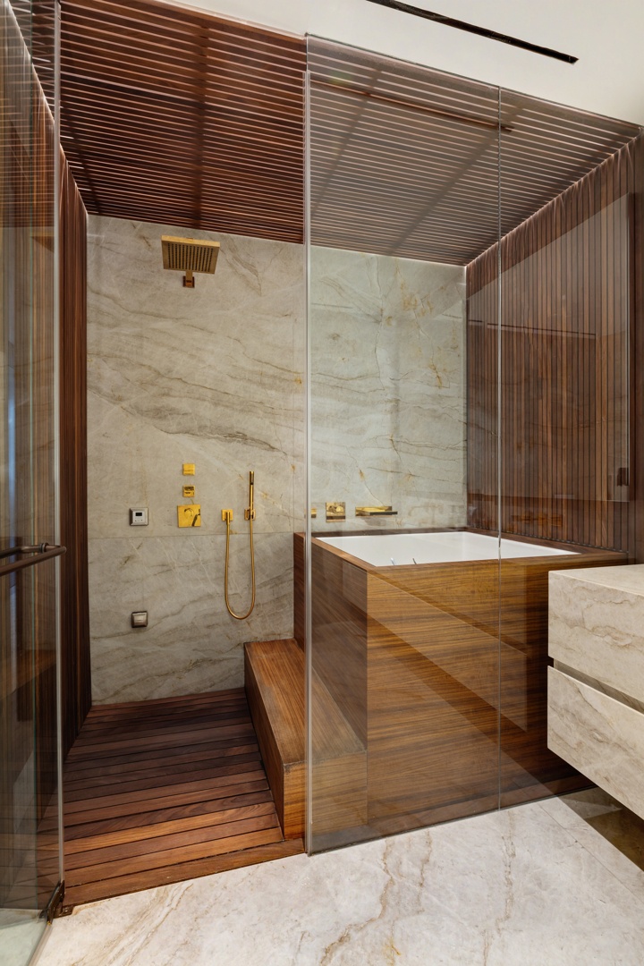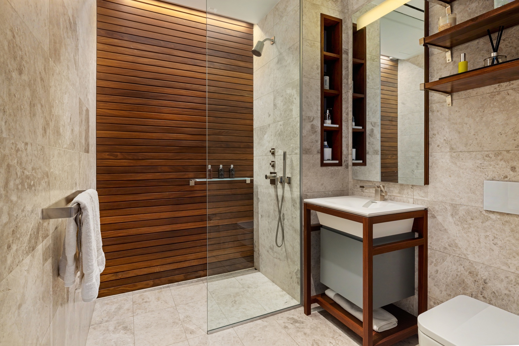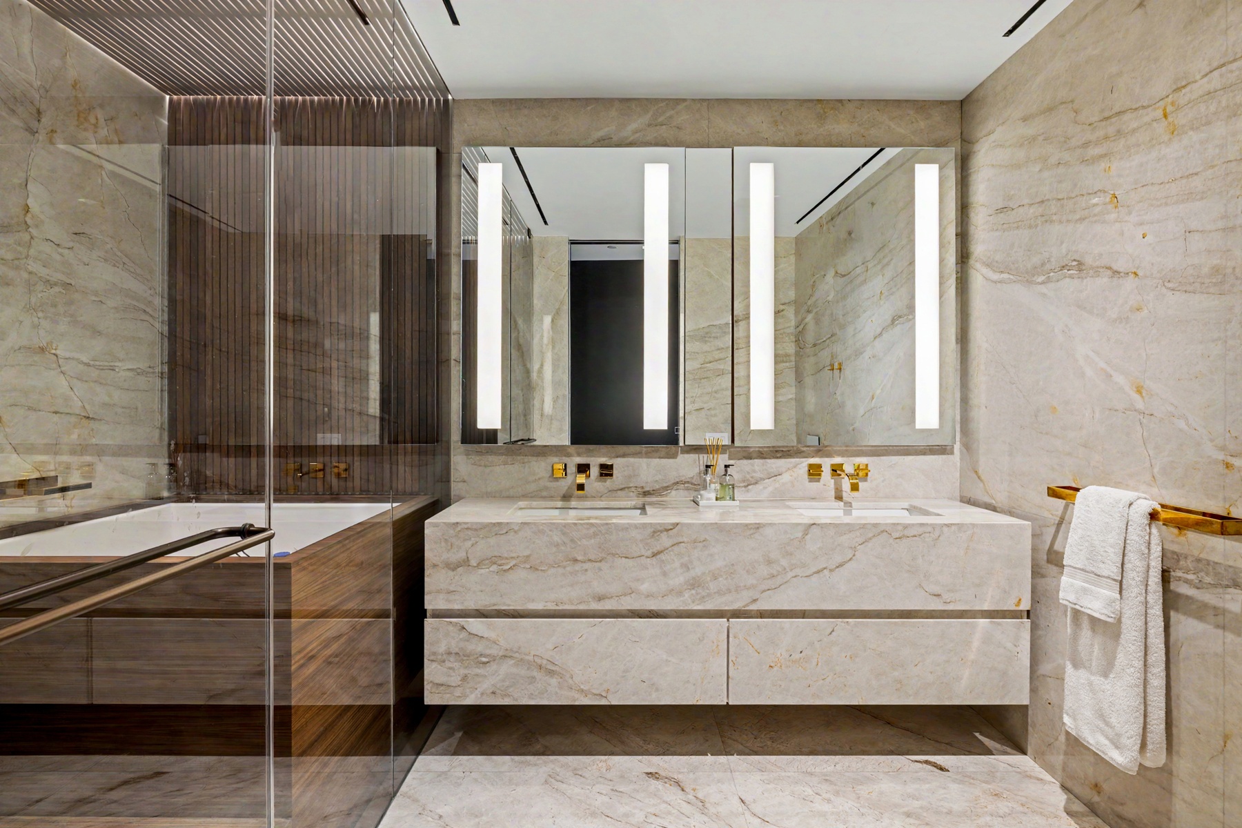 The thoughtfully designed split-bedroom layout allows for optimal privacy. The serene primary bedroom suite has space for a sitting area or home office and features a generous walk-in closet and additional storage closet. The luxurious spa-like bathroom is adorned with quartzite slab floors, walls, and countertops complemented by a custom double vanity with Dornbracht fixtures and integrated lighting. The shower is a glass-enclosed, steam rain shower next to the deep soaking tub beautifully clad in quartzite and teak. A second bedroom and bath are finished to the same exceptional standard.
