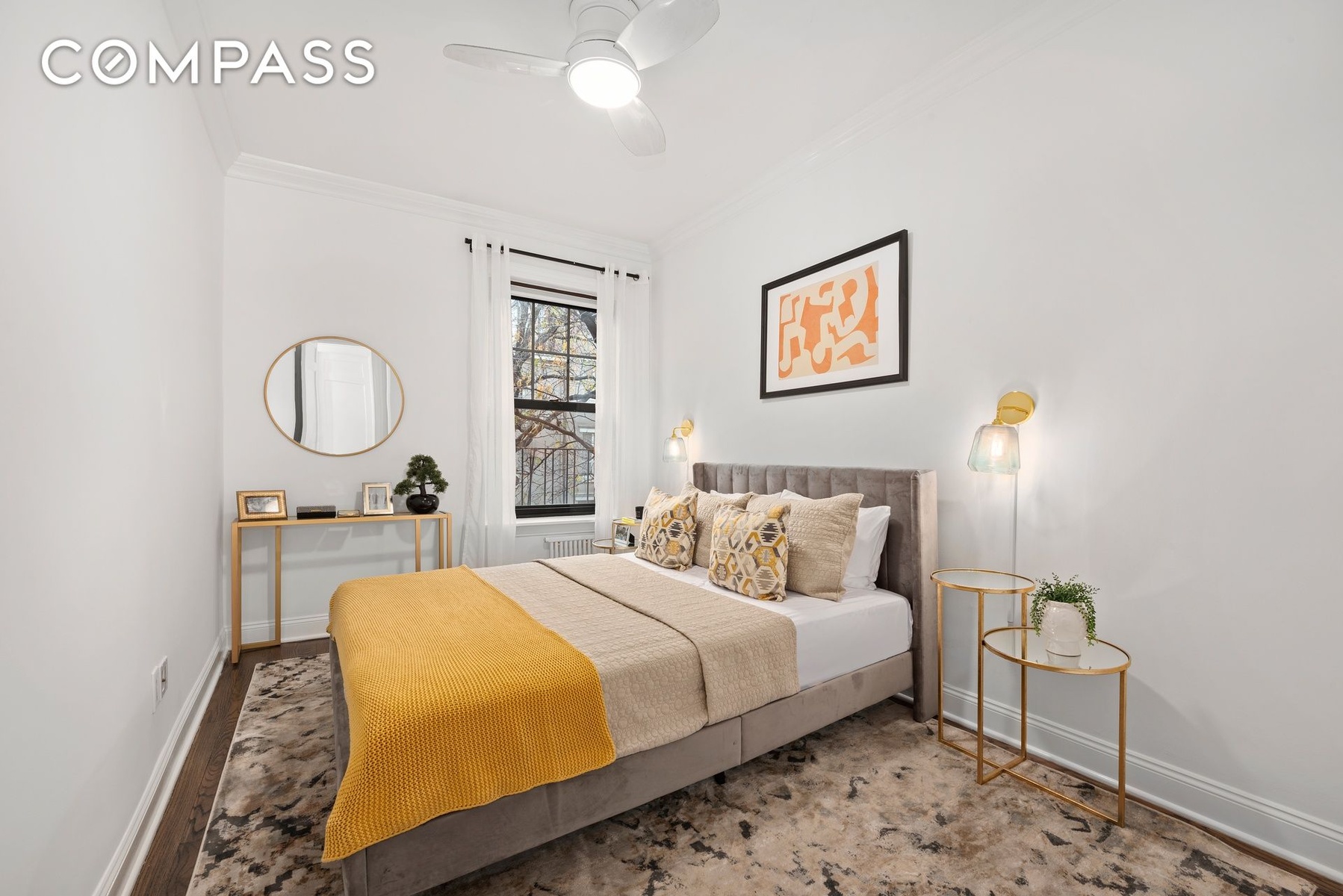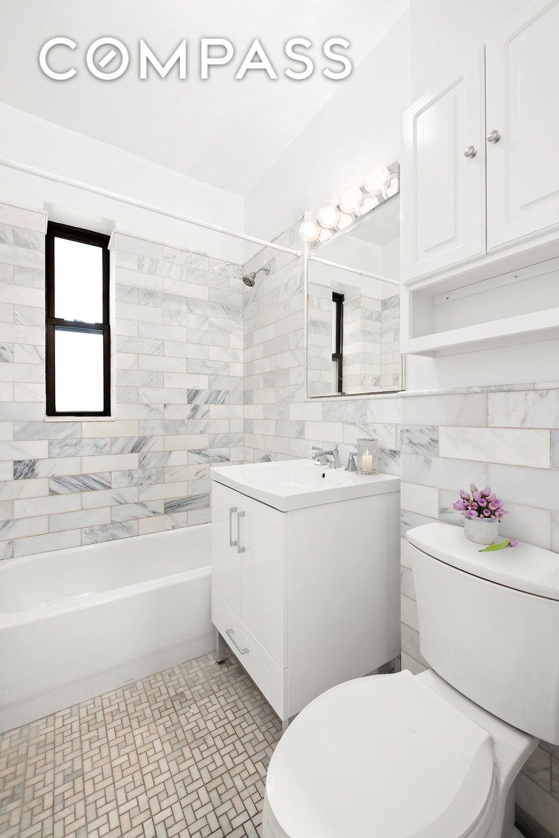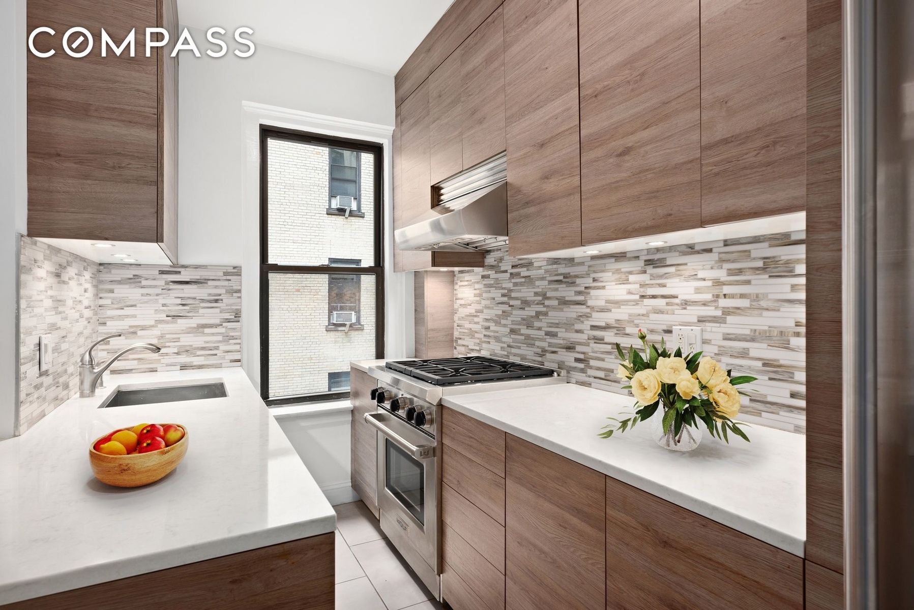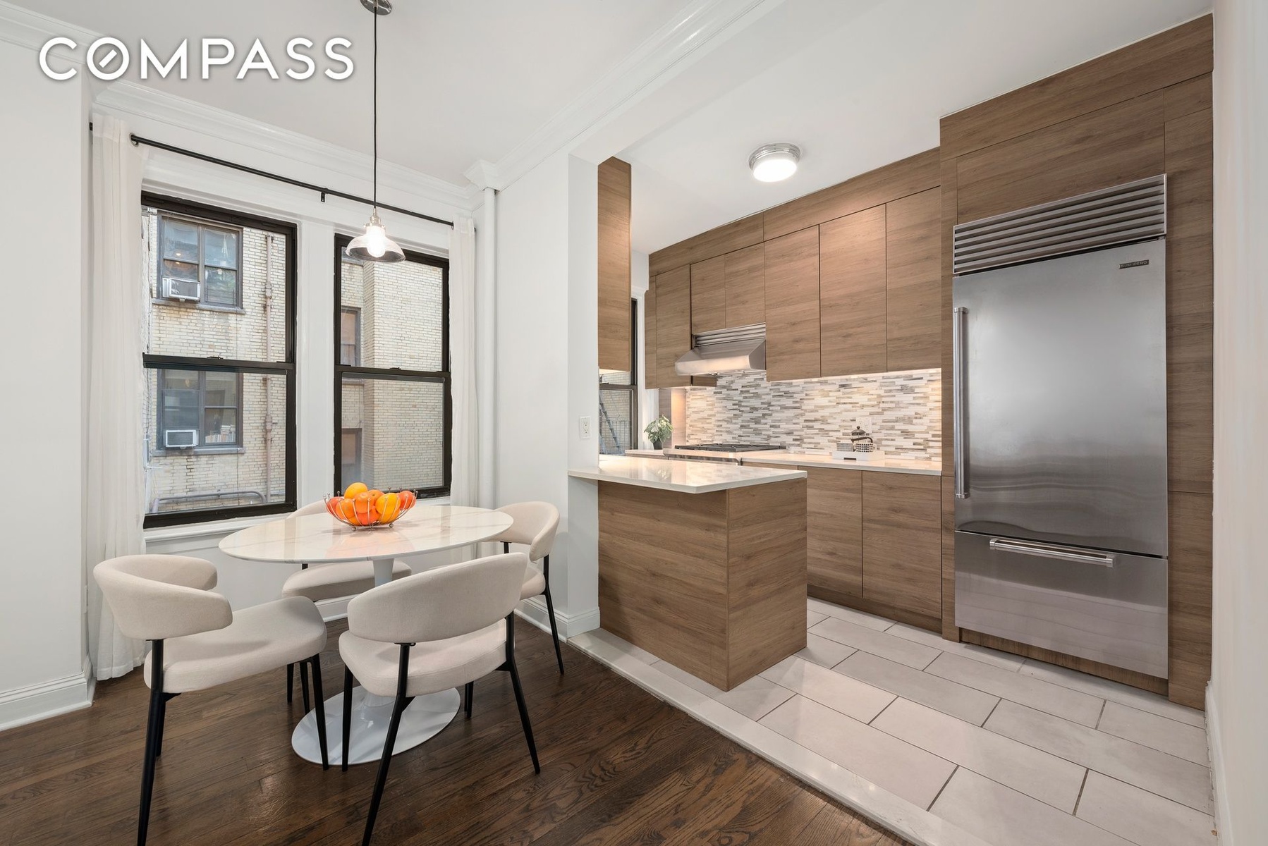 Incredible opportunity to purchase a turn-key true two bedroom, one bathroom apartment in the heart of the West Village. Located up one flight of stairs, the home features an effortless layout with dark oak hardwood floors throughout. From the foyer with a large coat closet, the apartment flows into an open concept living area with oversized windows and a separate dining area. The renovated windowed kitchen features a breakfast bar and high-end finishes and appliances including Carrera countertops, tiled backsplashes, sleek cabinets with under-cabinet lighting, SubZero refrigerator, Miele dishwasher, and Wolf gas range. A hallway guides you past an elegant tiled windowed bathroom to the bedrooms. The primary bedroom offers an oversized walk-in closet and south exposure with views of the tree-lined street. The second bedroom faces north and can work as a home office or gym.