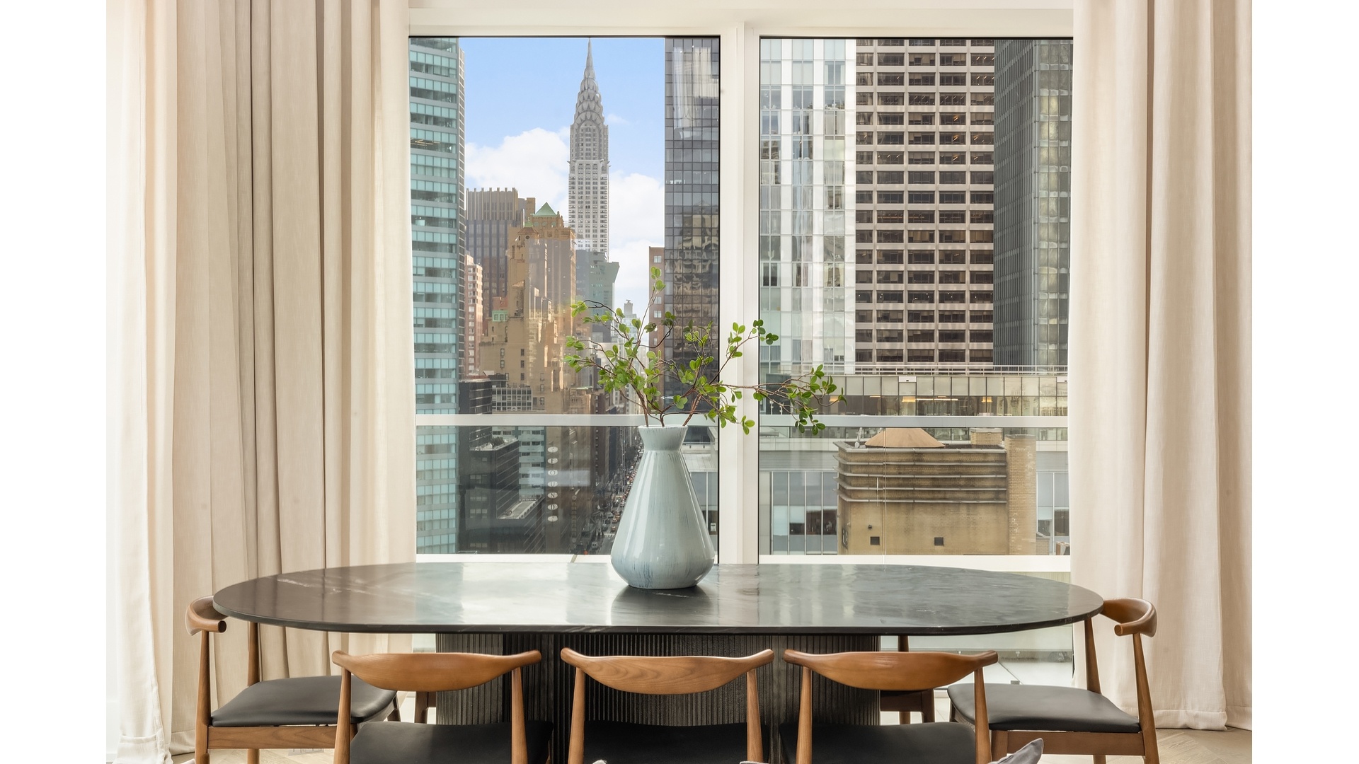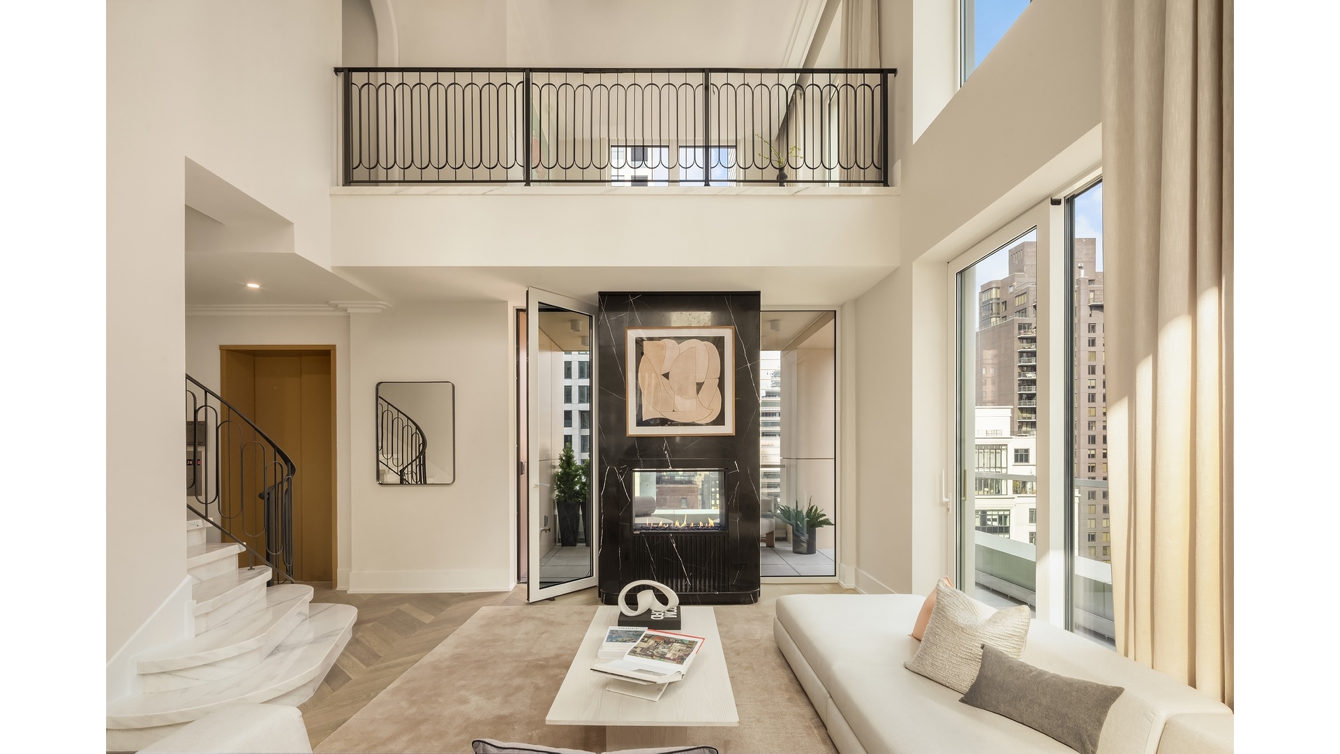 A private elevator gallery opens into a dramatic double-height great room, designed for gracious living, dining, and entertaining. A striking indoor-outdoor fireplace serves as a centerpiece and creates a seamless connection between the great room and adjacent 468-square-foot private terrace, which extends the entertaining space outdoors, perfect for al fresco lounging and dining. Triple-glazed windows showcase breathtaking views of the Chrysler Building and across Midtown Manhattan, while white oak floors hand-laid in a chevron pattern run throughout. A grand staircase with a custom railing makes a bold architectural statement.