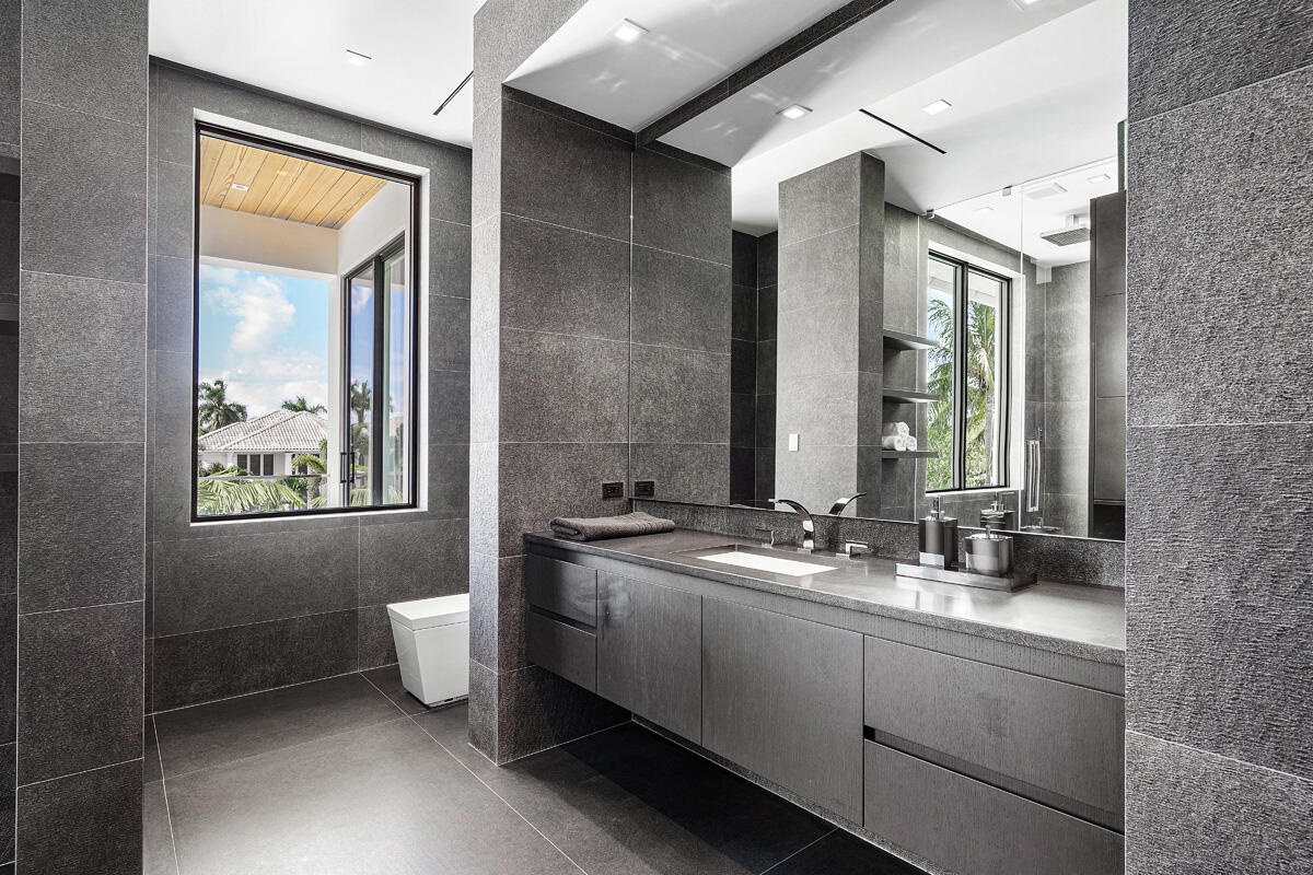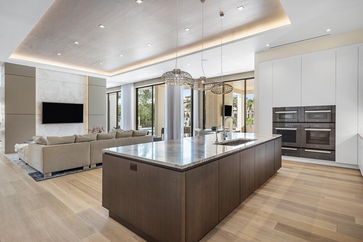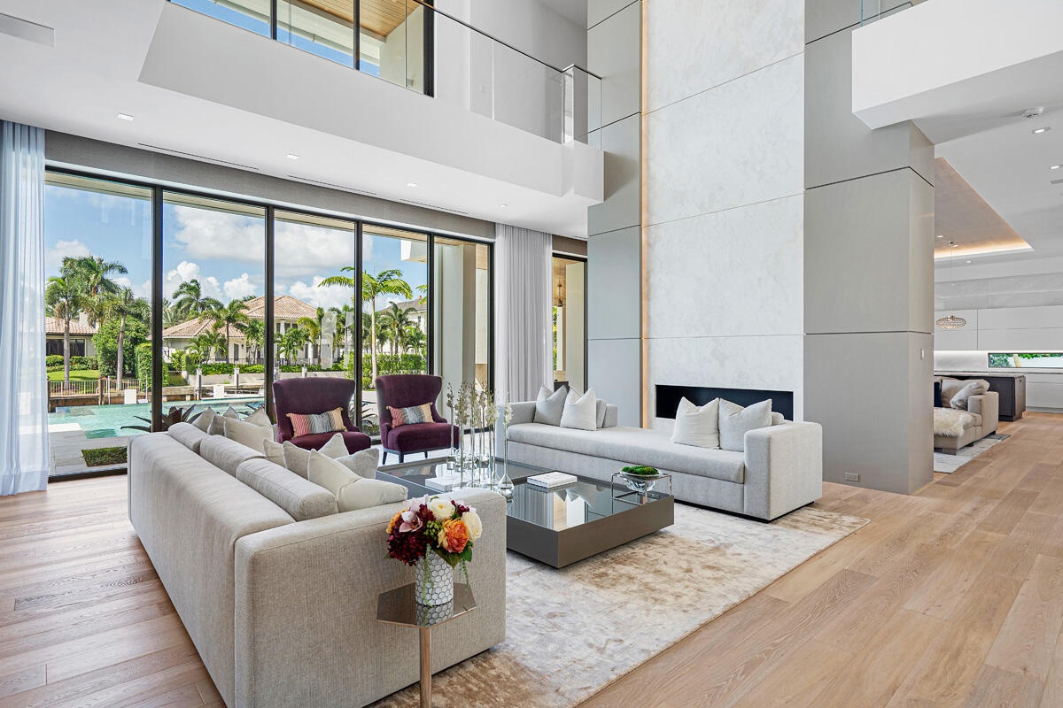 Crafted by Sarkela Corporation, 249 Alexander Palm Road is a striking waterfront estate positioned along one of Royal Palm Yacht & Country Club's most coveted streets, offering direct Intracoastal and ocean access. A gated approach reveals a commanding arrival, where marble-clad architectural elements set the tone for the level of detail carried throughout. Inside, the residence unfolds with a refined European aesthetic, defined by exceptional materials and a cohesive, contemporary design vision. Custom lighting by Terzani, curated marble selections, bespoke wall treatments, and premium European oak flooring establish a sense of continuity and quiet distinction across the interiors. Spanning 8,815 square feet, the layout is both expansive and fluid, designed to accommodate both formal entertaining and relaxed daily living. A dramatic two-story living room is anchored by a 24-foot marble fireplace, complemented by a formal dining room with a glass-enclosed wine display, a media lounge with bar, a private office, and a well-appointed kitchen featuring cabinetry by Duccini Milano. The primary suite occupies a private position on the upper level, offering a generous sitting area facing the water, along with dual baths and dressing rooms designed for comfort and privacy. Outdoor spaces are also considered, with manicured grounds framing a covered summer lounge, an outdoor kitchen, a linear fireplace, and an infinity-edge pool with an integrated spa and a sun shelf. Furnishings curated by designer Raquel Mothe enhance the home's architectural clarity and material palette. A private deep-water dock, finished with marble decking and equipped with power and water, accommodates large vessels and provides immediate access to open water. This residence is designed for those who value precision, scale, and a seamless waterfront lifestyle.
