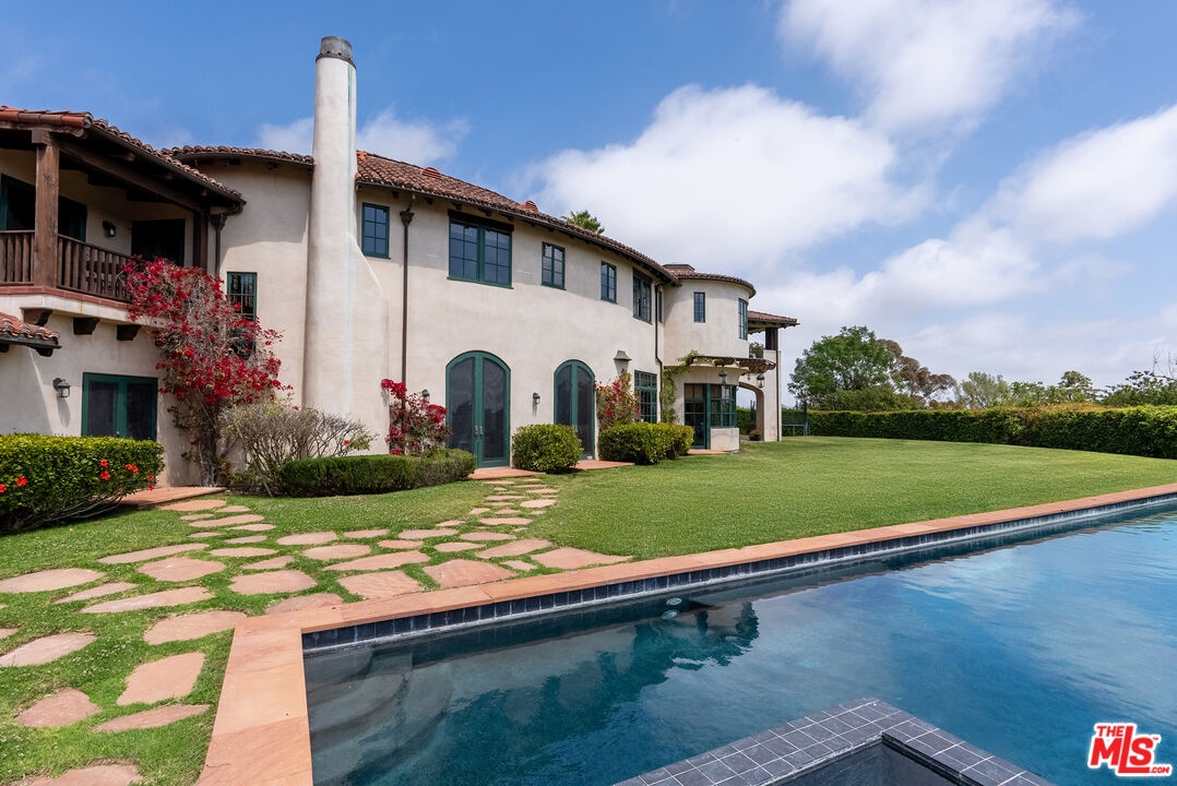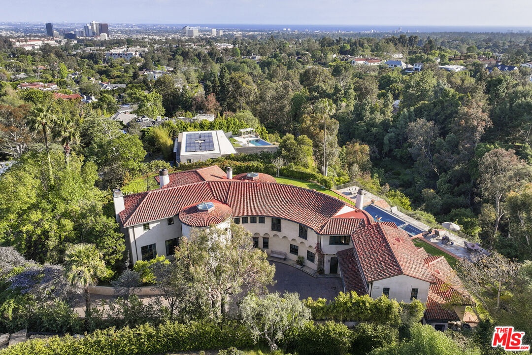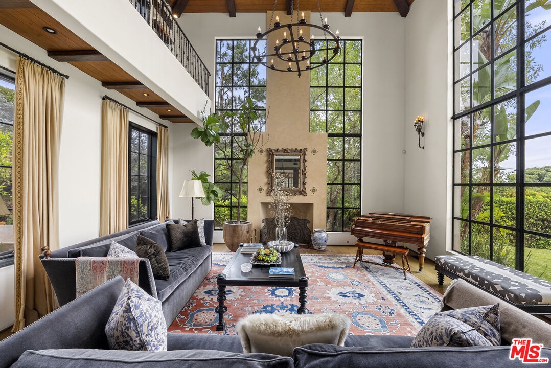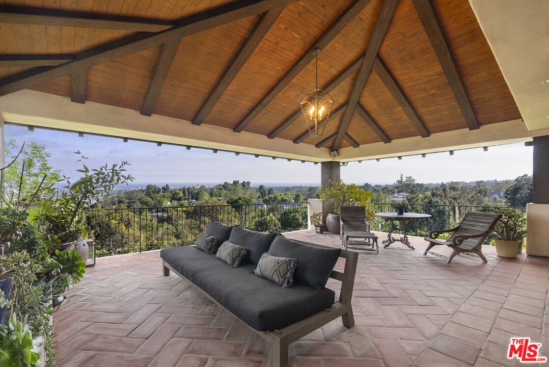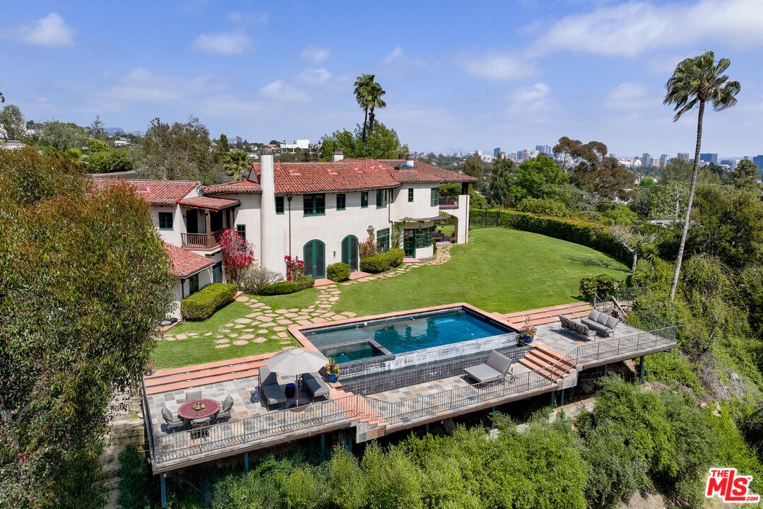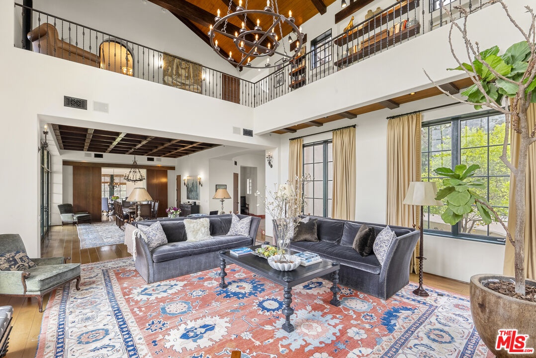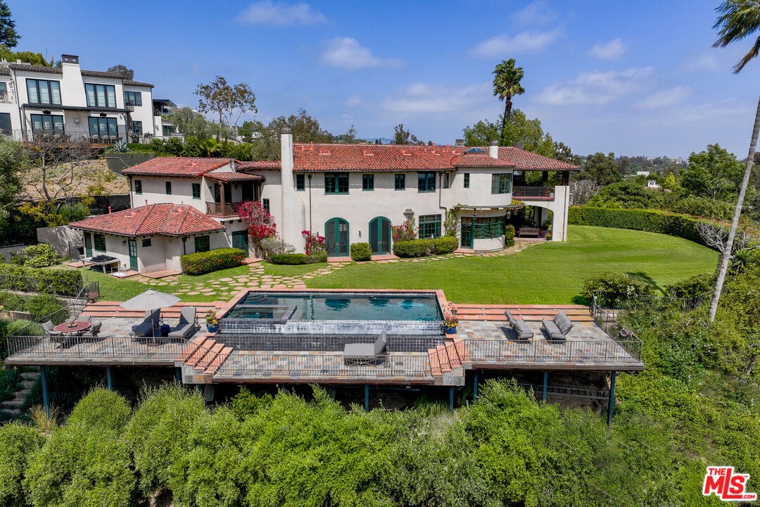 A double gated private view property on an oversized, lushly landscaped setting, this stunning Spanish-style estate blends classic architectural charm with an effortless indoor-outdoor California lifestyle. Framed by mature trees and sweeping canyon views, the property offers rare scale, privacy, and versatility in one of the area's most desirable settings. The residence showcases authentic character throughout, with arched doorways, hand-crafted details, and rich wood-beamed ceilings that create warmth and distinction. Sunlit interiors are enhanced by oversized windows and thoughtfully designed spaces, including multiple bedrooms with cozy window seating, inviting living areas, and a spacious lower-level lounge ideal for entertaining, media, or recreation. The heart of the home flows seamlessly to the outdoors, where an expansive backyard retreat awaits. A resort-style pool and spa are surrounded by multiple lounging and dining areas, all positioned to capture serene treetop and canyon vistas. A covered patio extends the living space year-round, perfect for al fresco dining and relaxed gatherings. The sprawling grassy yard offers endless entertaining in a private and serene setting.