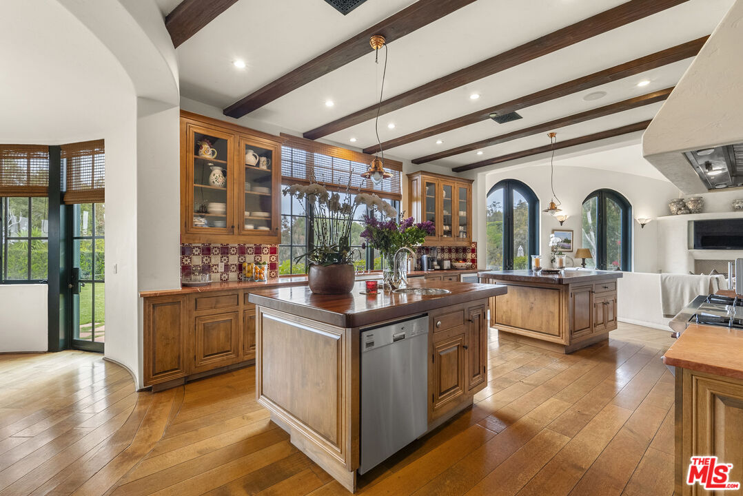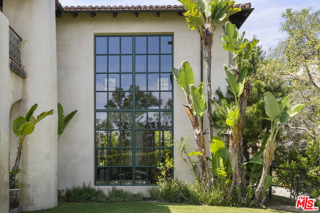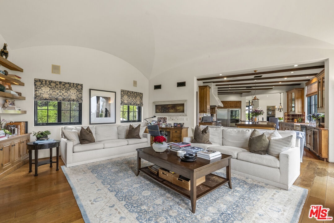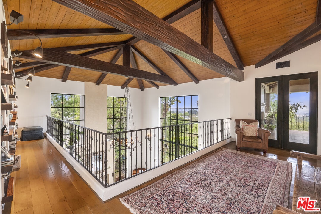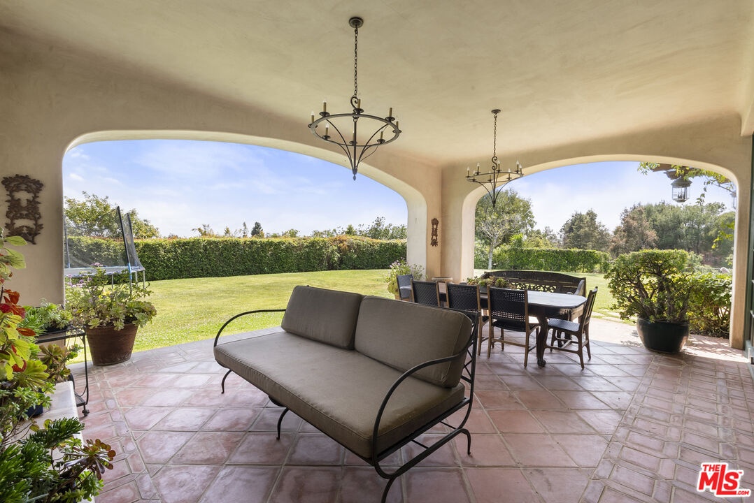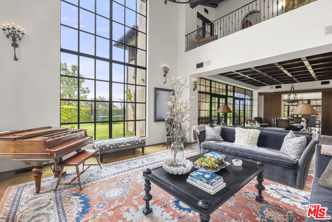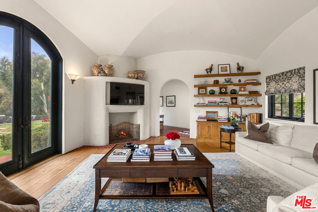 A double gated private view property on an oversized, lushly landscaped setting, this stunning Spanish-style estate blends classic architectural charm with an effortless indoor-outdoor California lifestyle. Framed by mature trees and sweeping canyon views, the property offers rare scale, privacy, and versatility in one of the area's most desirable settings. The residence showcases authentic character throughout, with arched doorways, hand-crafted details, and rich wood-beamed ceilings that create warmth and distinction. Sunlit interiors are enhanced by oversized windows and thoughtfully designed spaces, including multiple bedrooms with cozy window seating, inviting living areas, and a spacious lower-level lounge ideal for entertaining, media, or recreation. The heart of the home flows seamlessly to the outdoors, where an expansive backyard retreat awaits. A resort-style pool and spa are surrounded by multiple lounging and dining areas, all positioned to capture serene treetop and canyon vistas. A covered patio extends the living space year-round, perfect for al fresco dining and relaxed gatherings. The sprawling grassy yard offers endless entertaining in a private and serene setting.