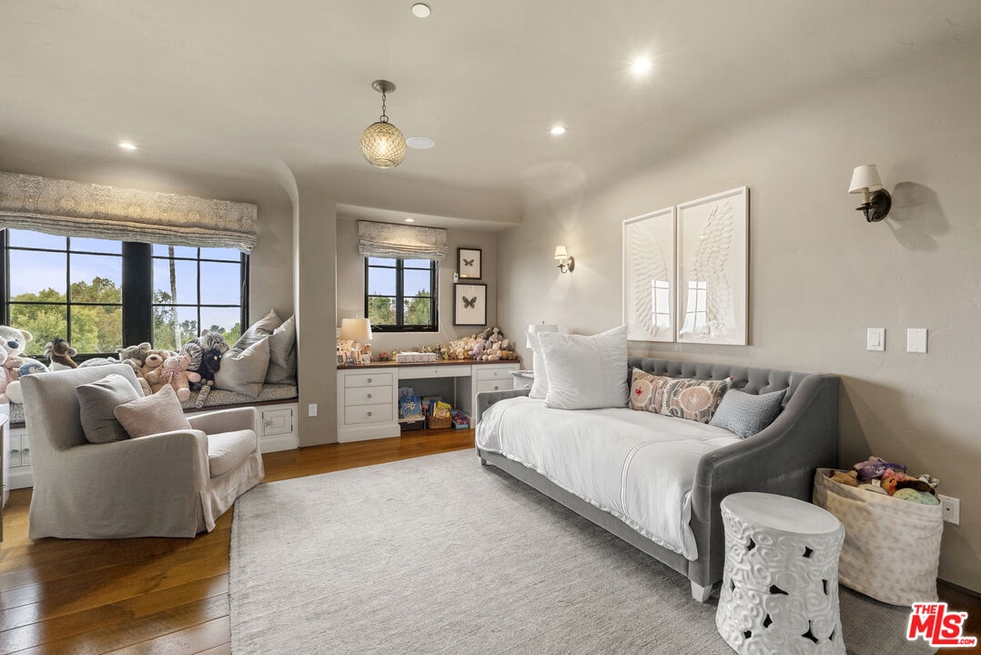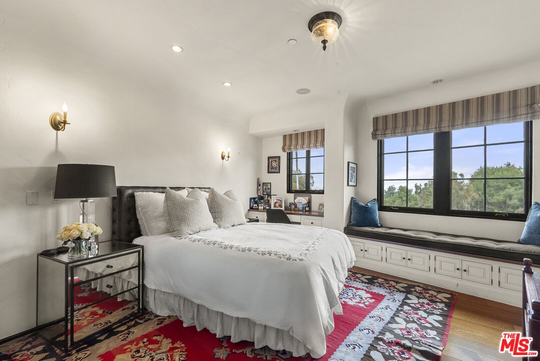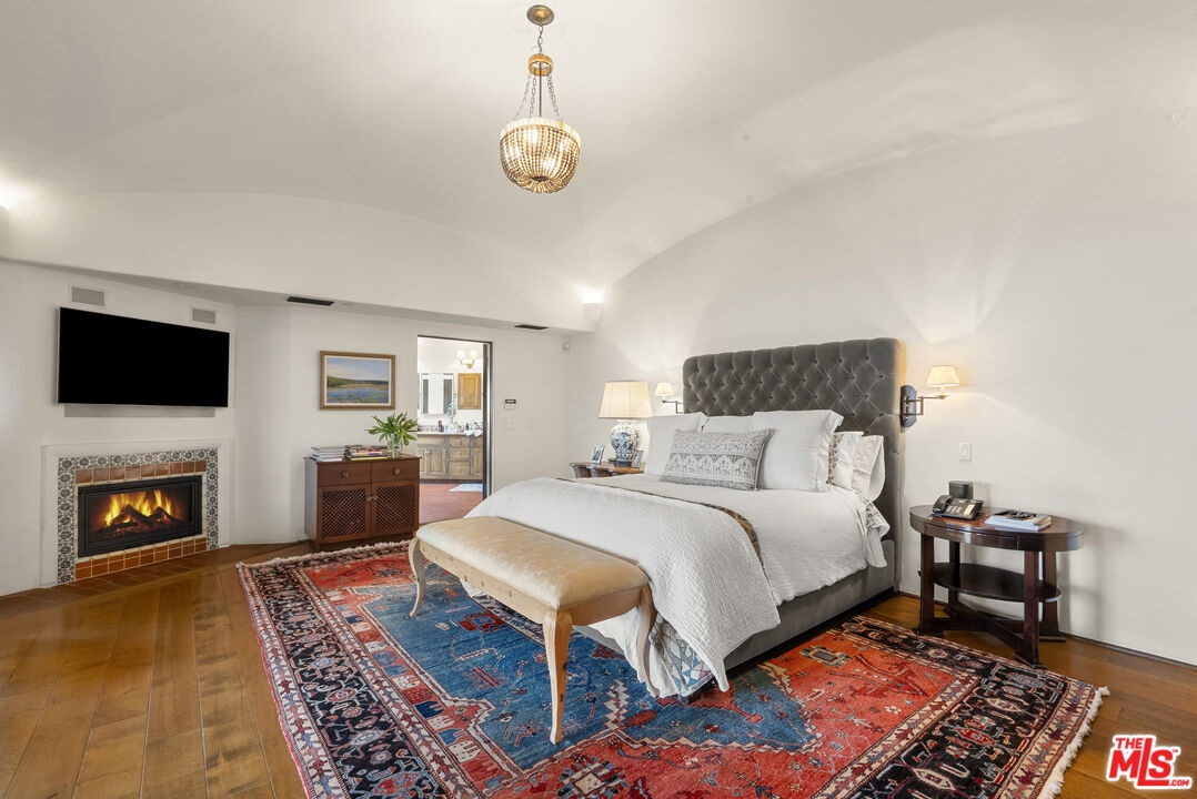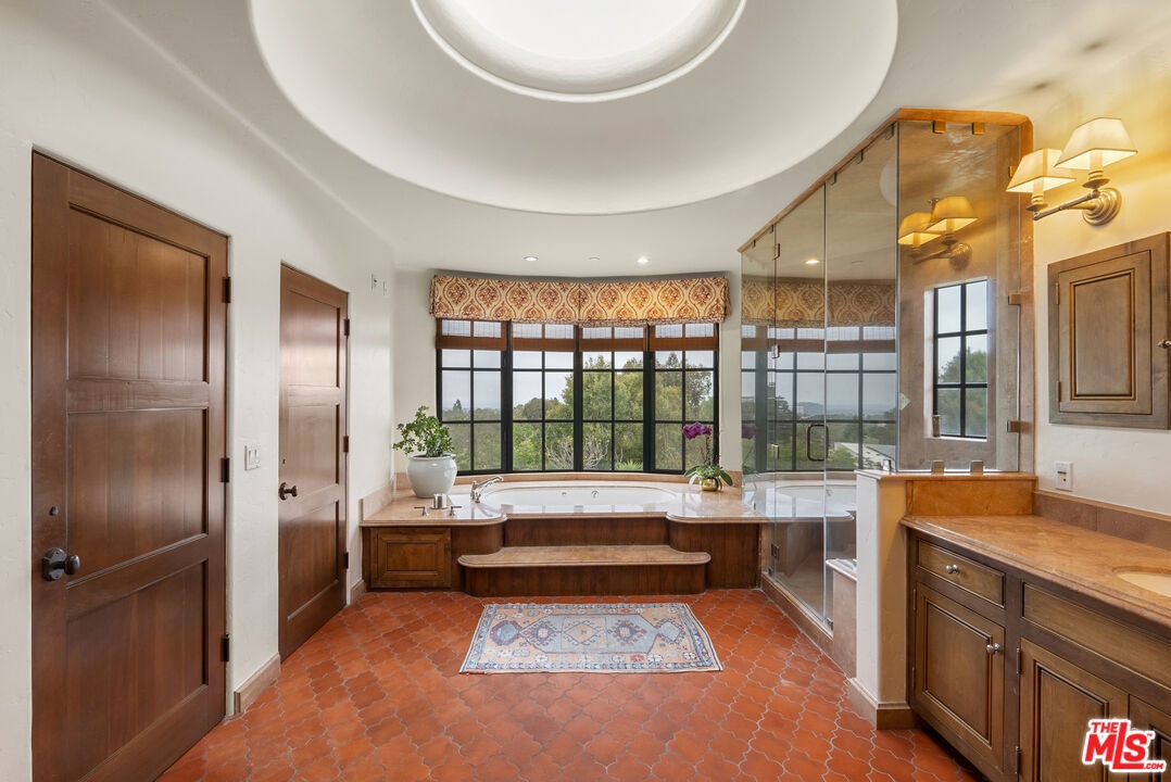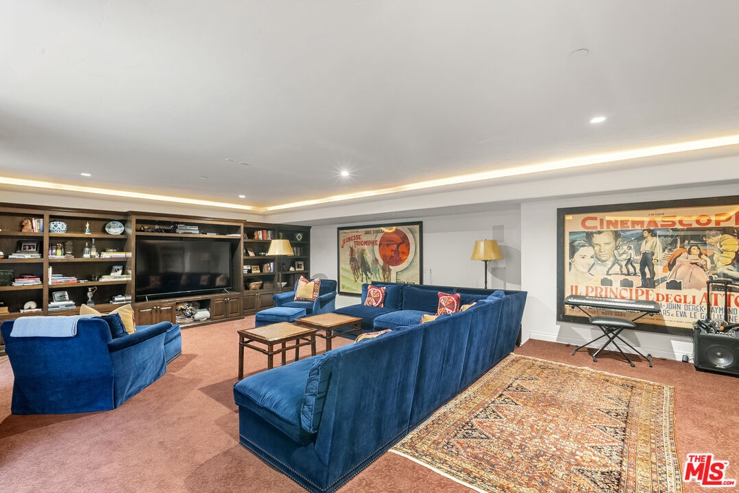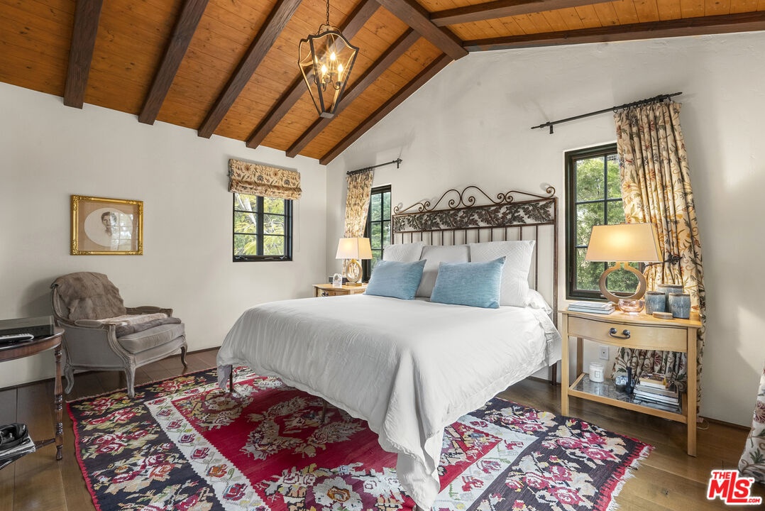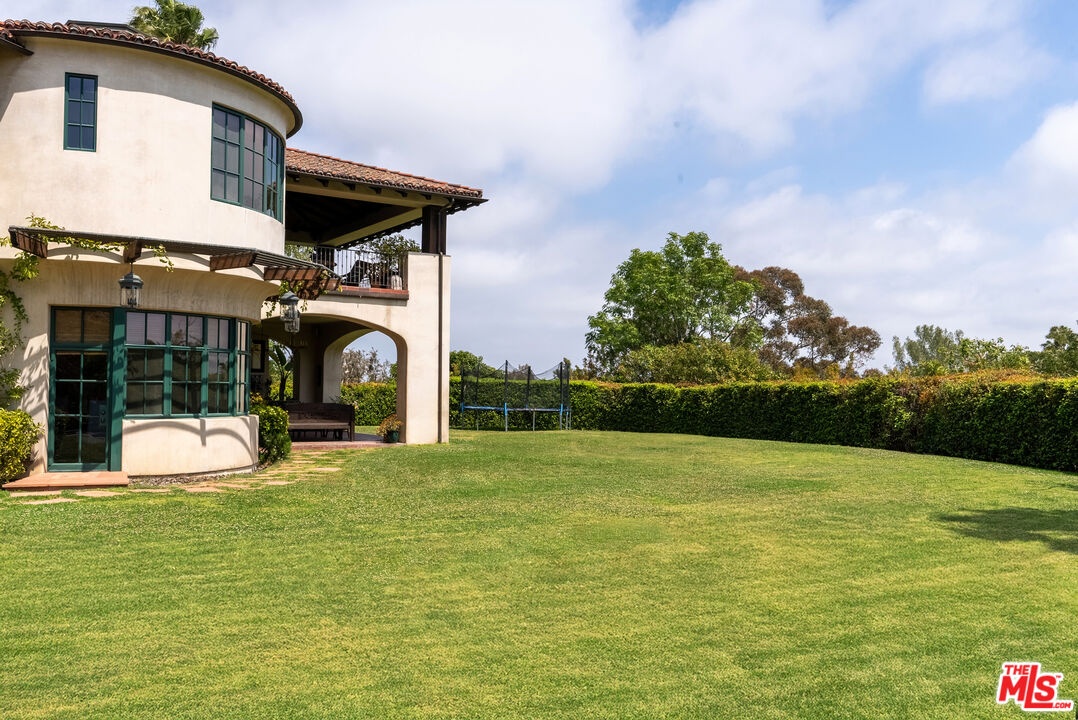 A double gated private view property on an oversized, lushly landscaped setting, this stunning Spanish-style estate blends classic architectural charm with an effortless indoor-outdoor California lifestyle. Framed by mature trees and sweeping canyon views, the property offers rare scale, privacy, and versatility in one of the area's most desirable settings. The residence showcases authentic character throughout, with arched doorways, hand-crafted details, and rich wood-beamed ceilings that create warmth and distinction. Sunlit interiors are enhanced by oversized windows and thoughtfully designed spaces, including multiple bedrooms with cozy window seating, inviting living areas, and a spacious lower-level lounge ideal for entertaining, media, or recreation. The heart of the home flows seamlessly to the outdoors, where an expansive backyard retreat awaits. A resort-style pool and spa are surrounded by multiple lounging and dining areas, all positioned to capture serene treetop and canyon vistas. A covered patio extends the living space year-round, perfect for al fresco dining and relaxed gatherings. The sprawling grassy yard offers endless entertaining in a private and serene setting.