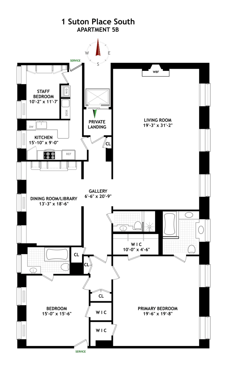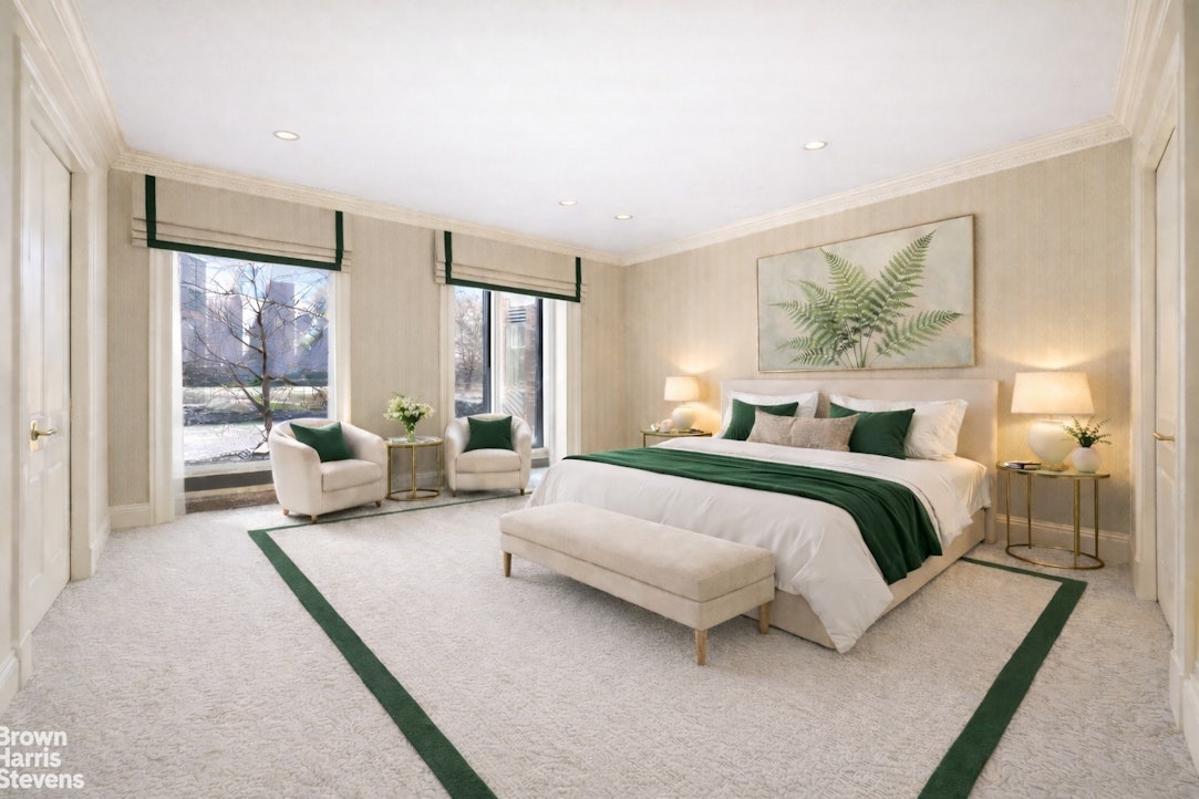 Across the hall is a separate library/dining room, which can also serve as a third bedroom or guest room. There are two generously sized bedrooms, each with walk-in closets and en-suite baths. The primary bedroom is positioned on the east side to take full advantage of the garden and river views. The apartment also includes a large, windowed kitchen, a laundry area, and a private office or staff room.