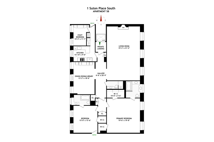 Across the hall is a separate library/dining room, which can also serve as a third bedroom or guest room. There are two generously sized bedrooms, each with walk-in closets and en-suite baths. The primary bedroom is positioned on the east side to take full advantage of the garden and river views. The apartment also includes a large, windowed kitchen, a laundry area, and a private office or staff room.