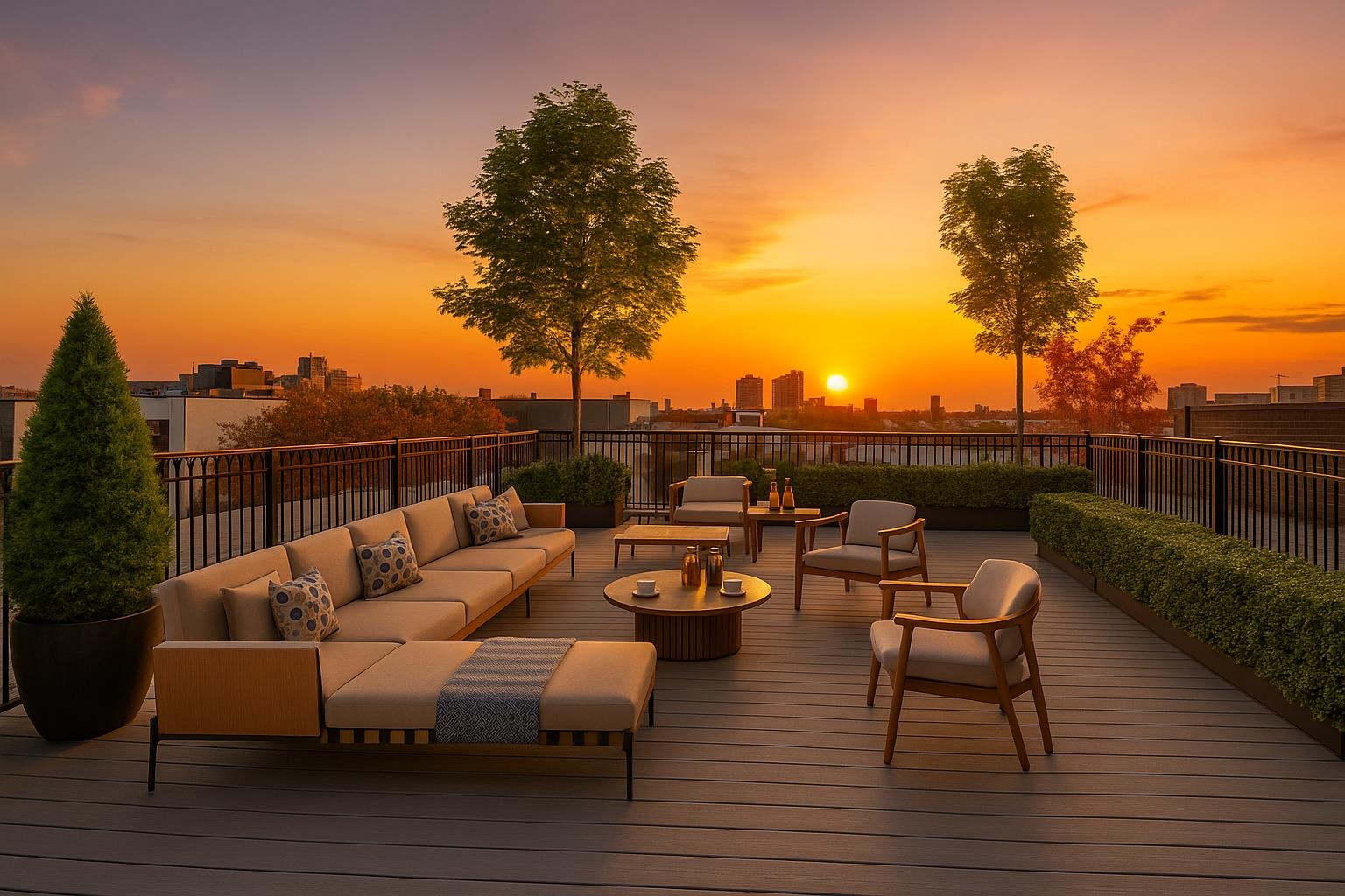 On the upper level is a sun-splashed landing that opens onto a 674-sf. rooftop terrace, the perfect setting for alfresco meals, gardening, sunbathing, and grilling.