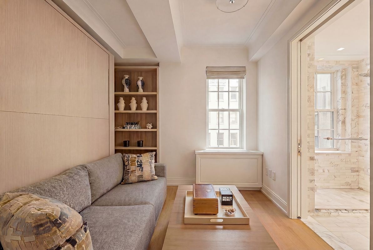 The great room enjoys eastern and northern light and looks out over the trees and townhouses of East 66th Street. Throughout, the floors are 5-inch-wide rift- and quarter-sawn solid oak in a natural finish, laid in a chevron pattern with a linear border.