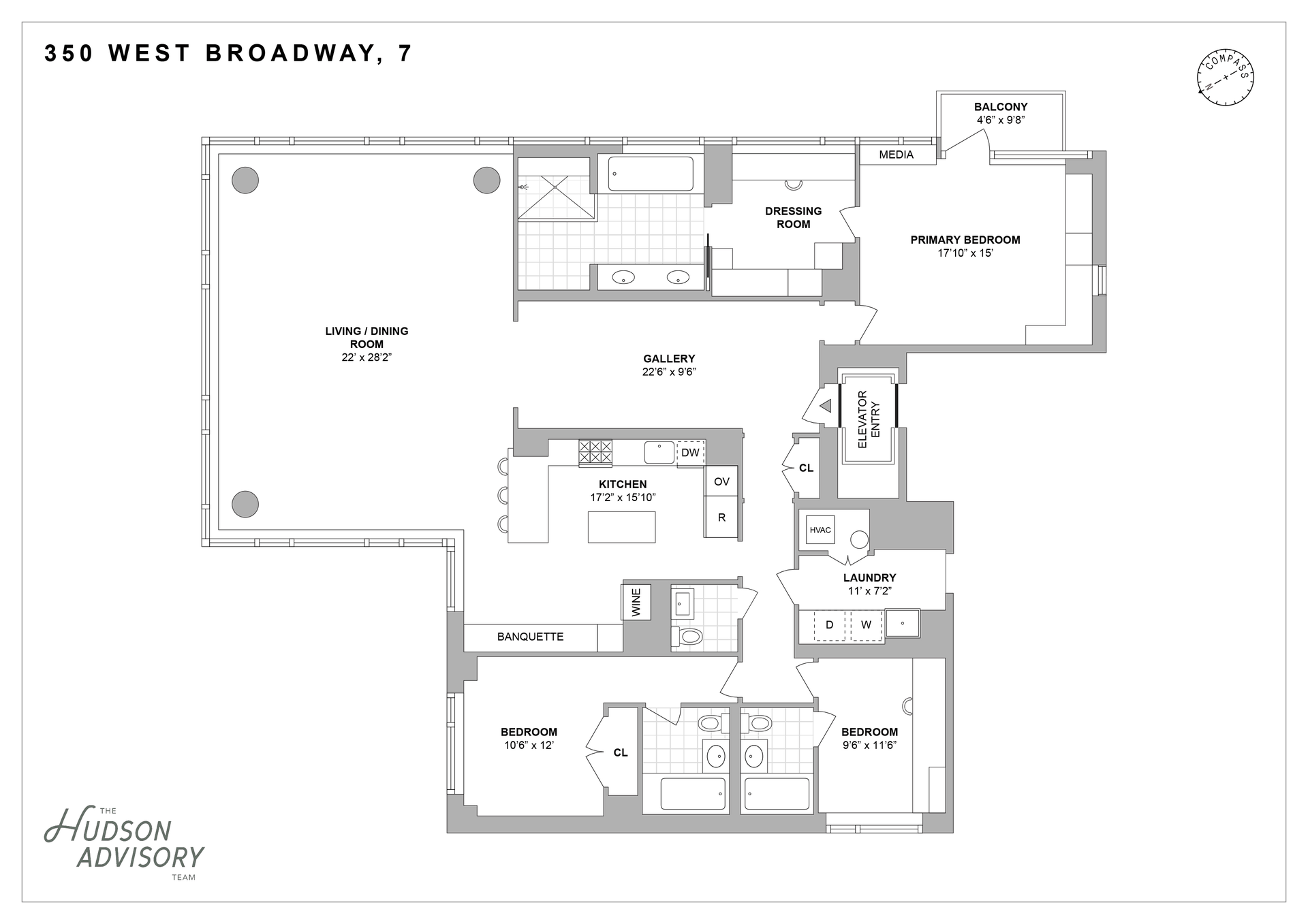 This full-floor, three-bedroom, three-and-a-half-bathroom loft, renovated in 2020, offers privacy, volume, and carefully considered design within a boutique SoHo building. Enter directly from the private elevator into a formal entry gallery that leads to a corner great room. 10-foot ceilings and oversized windows provide expansive views over West Broadway and the Midtown skyline, including the Empire State Building.